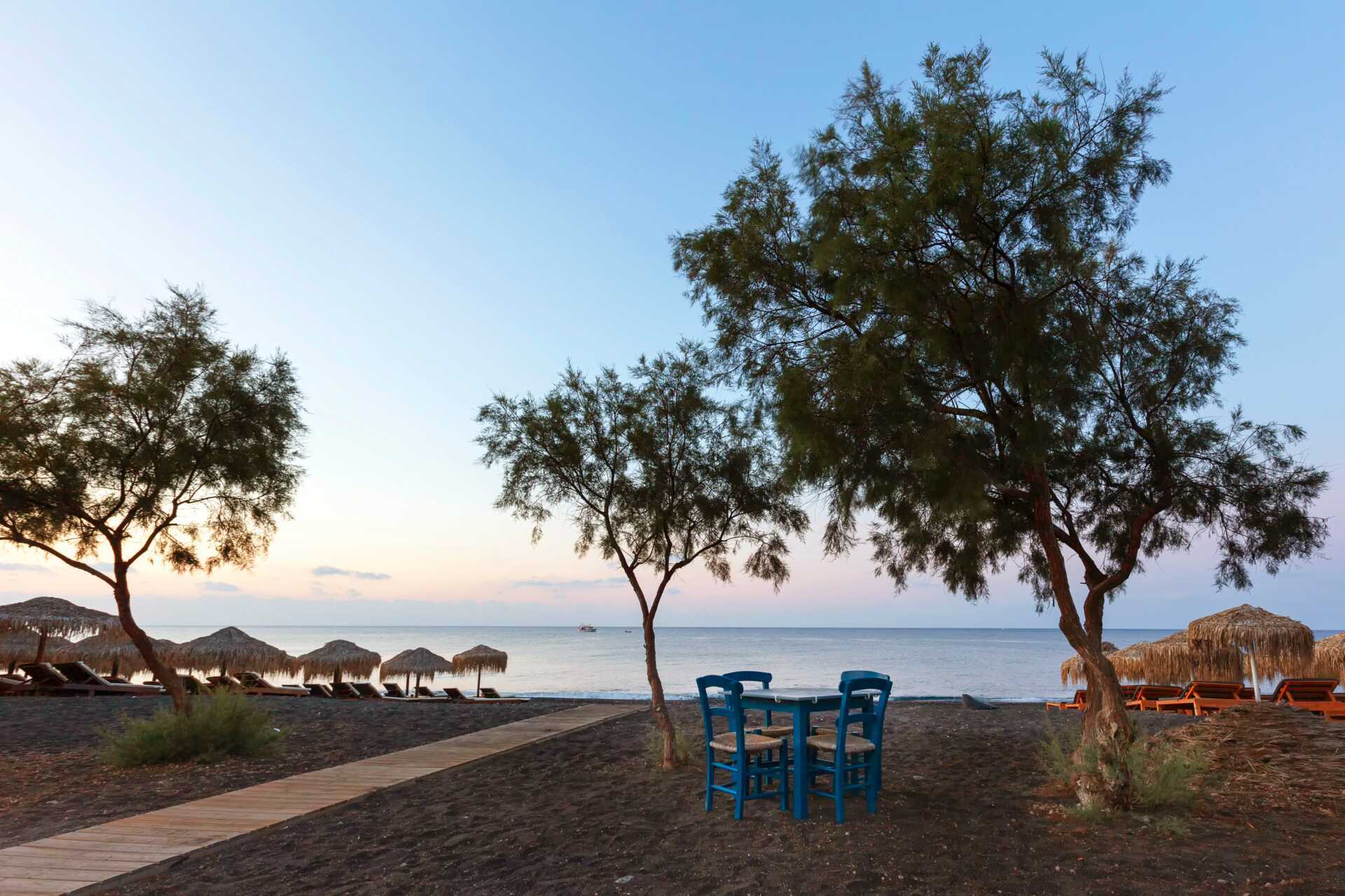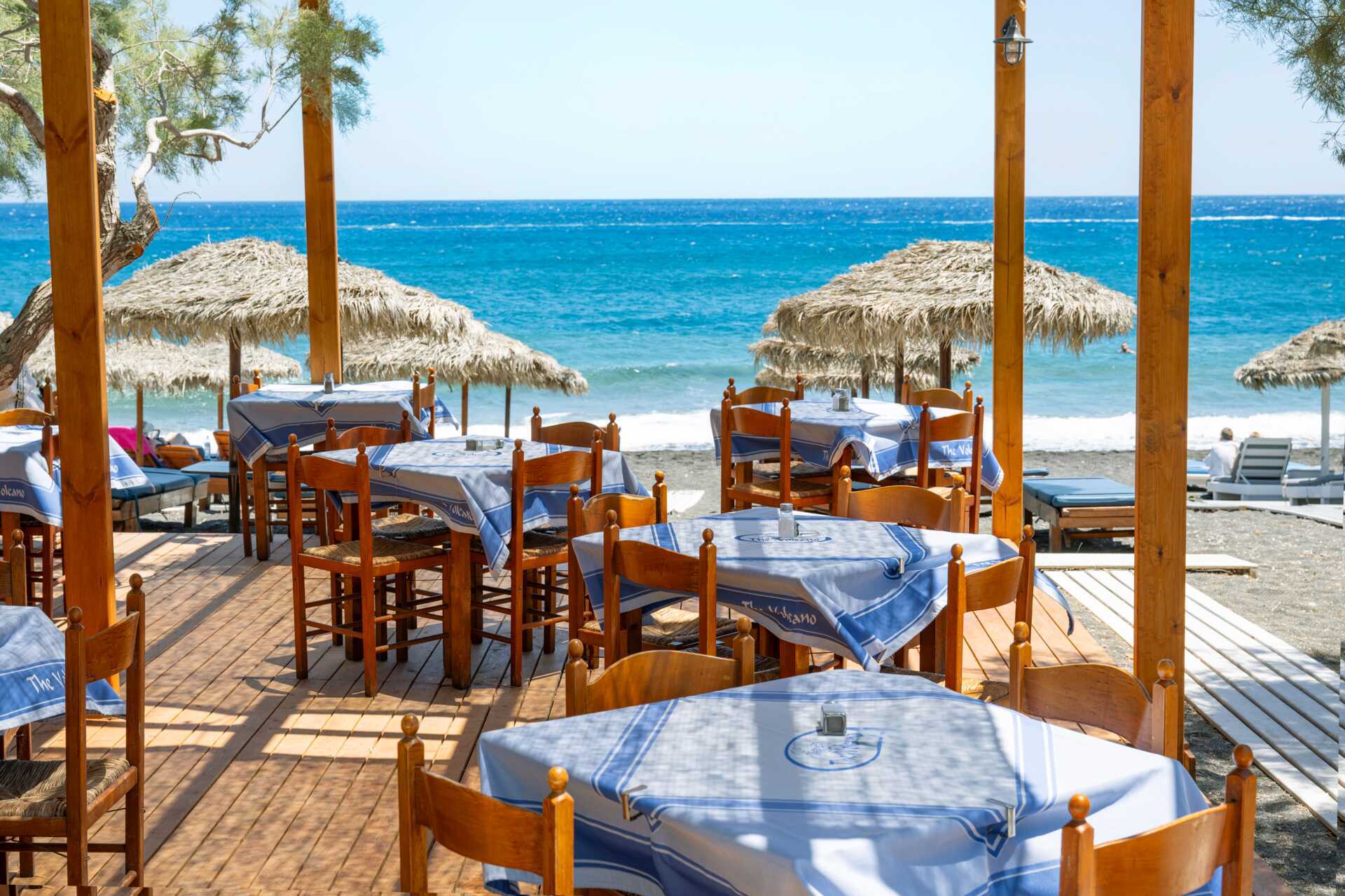 Perissa og Perivolos deler samme strand, den endrer bare navn der grensen mellom landsbyene går. Langs hele stranden er det solsenger og parasoller, som du kan bruke mot å kjøpe noe i restauranten eller baren. Perissas del av stranden blir ofte beskrevet som Santorinis aller beste – den svarte lavasanden som møter det mørkeblå og krystallklare vannet er et vakkert syn. På Perivolos del av stranden, den sørlige enden, er det livligere med ulike vannsporter og strandbarer som byr på fin skygge.