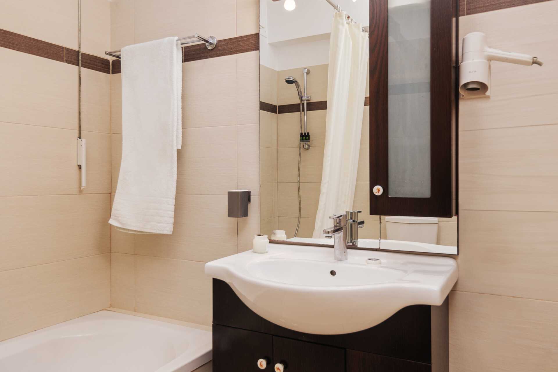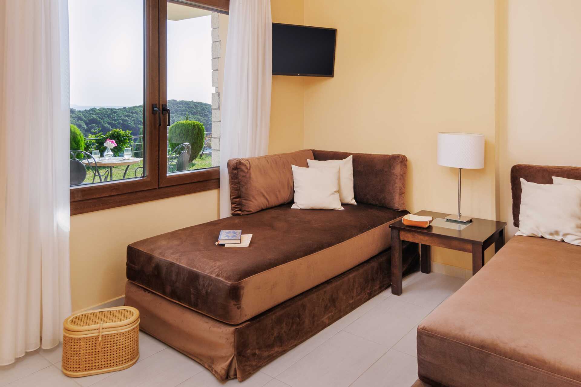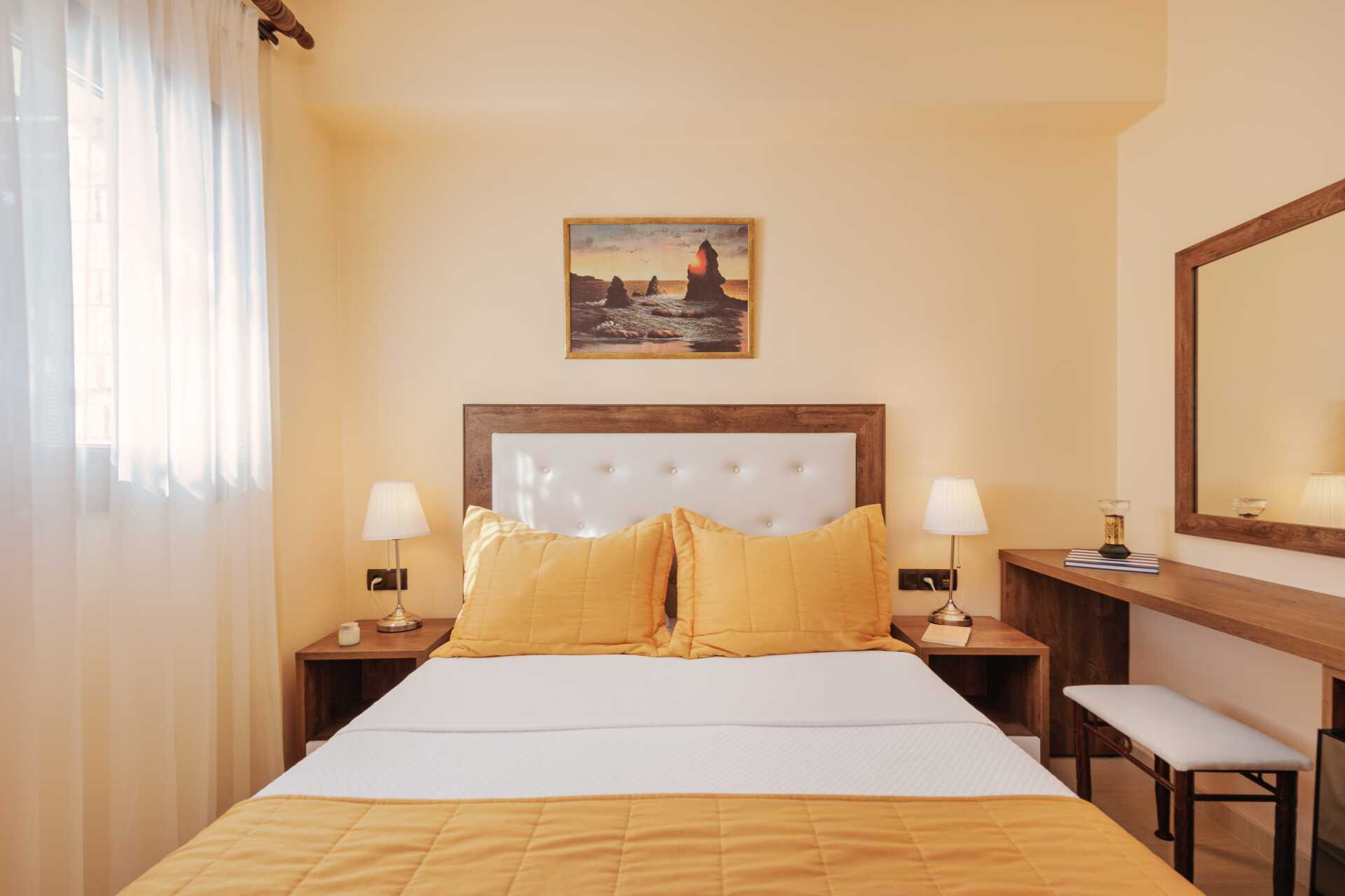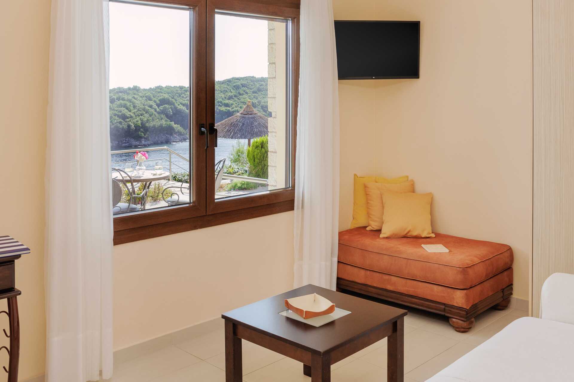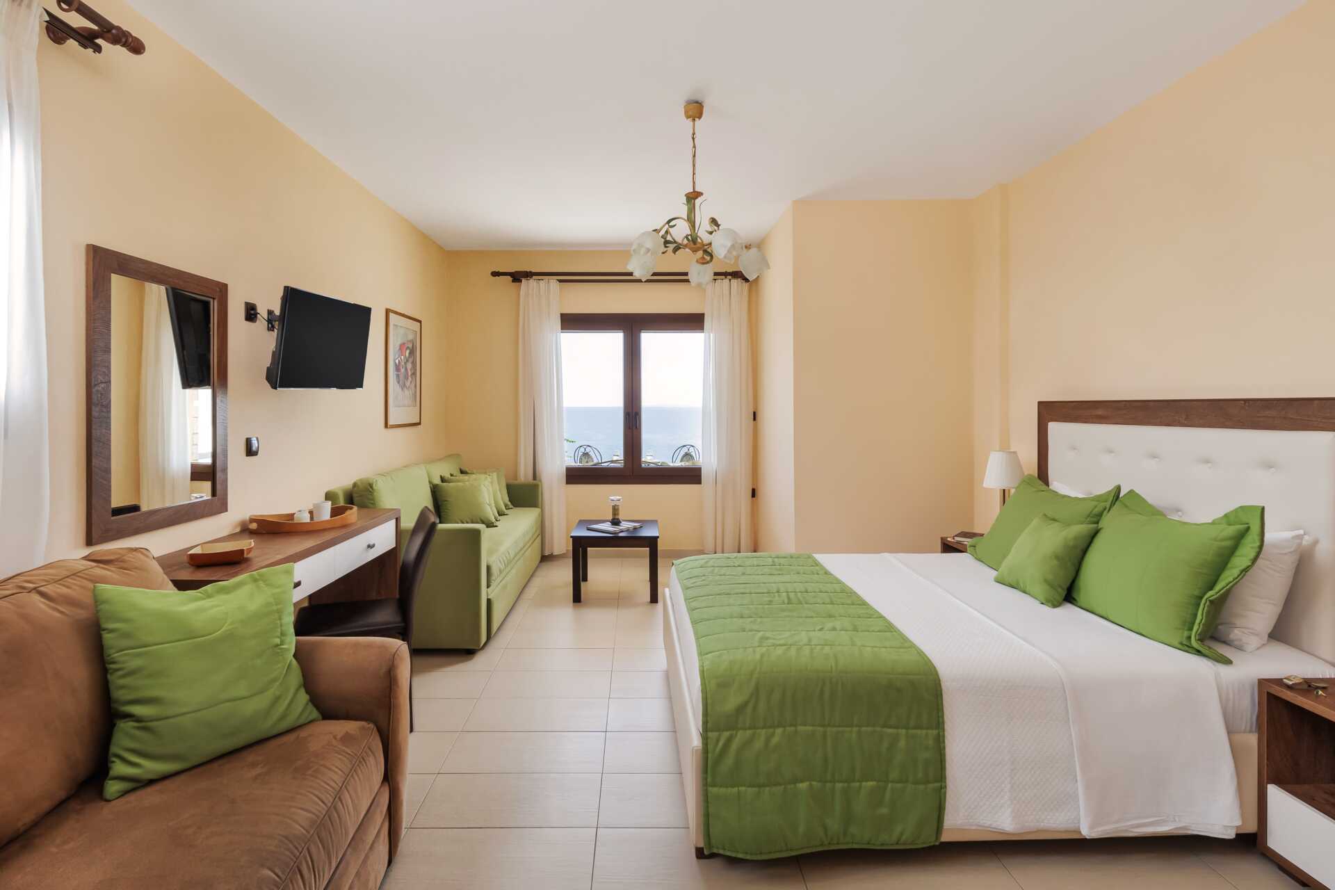 Familierom med markterrasse og havutsikt. Familierommet består av et soverom og en stue. En dobbeltseng. Mulig med ekstrasenger i sovesofa. Wifi, luftkondisjonering og safe inkludert. Kjøleskap. Vannkoker. TV. Hårføner. Badekar eller dusj samt wc. Rengjøring 7 ggr/uke.