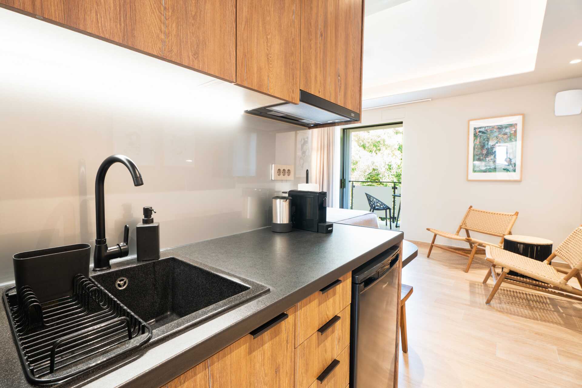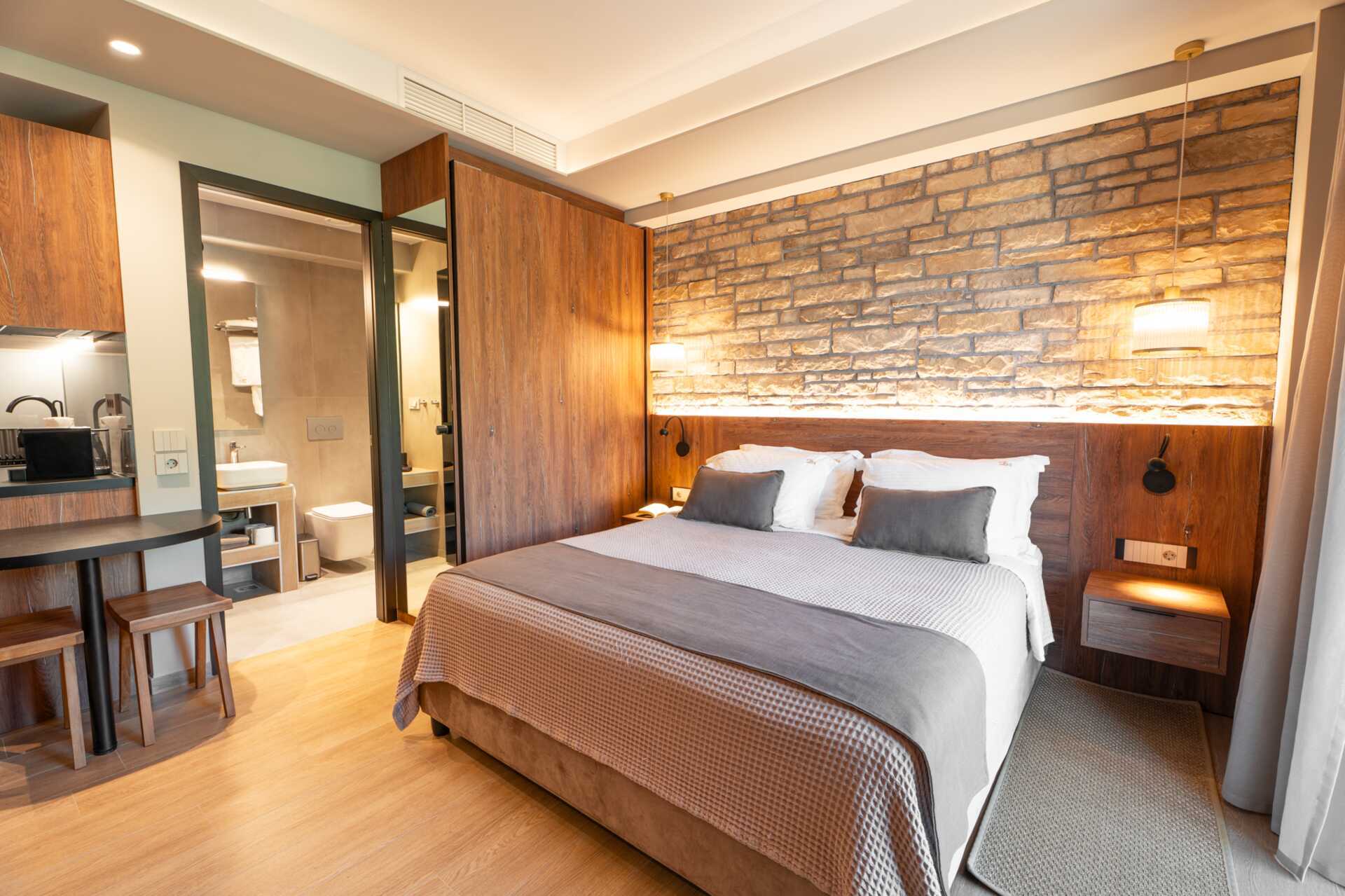 Ettromsleilighet med balkong. Kombinert soverom med minikjøkken. En dobbeltseng. Minikjøkken med kjøleskap, kokeplater, espressomaskin, vannkoker og enkelt kjøkkenutstyr. Wifi, luftkondisjonering og safe inkludert. TV. Strykejern og strykebrett. Hårføner. Dusj og wc. Rengjøring 5 ggr/uke. Barn under 2 år regnes inn i maksantallet i rommet.