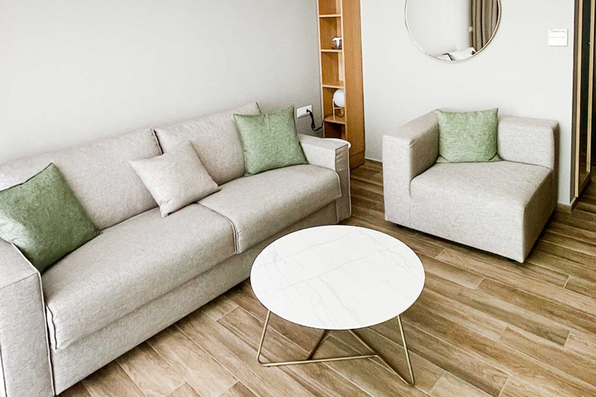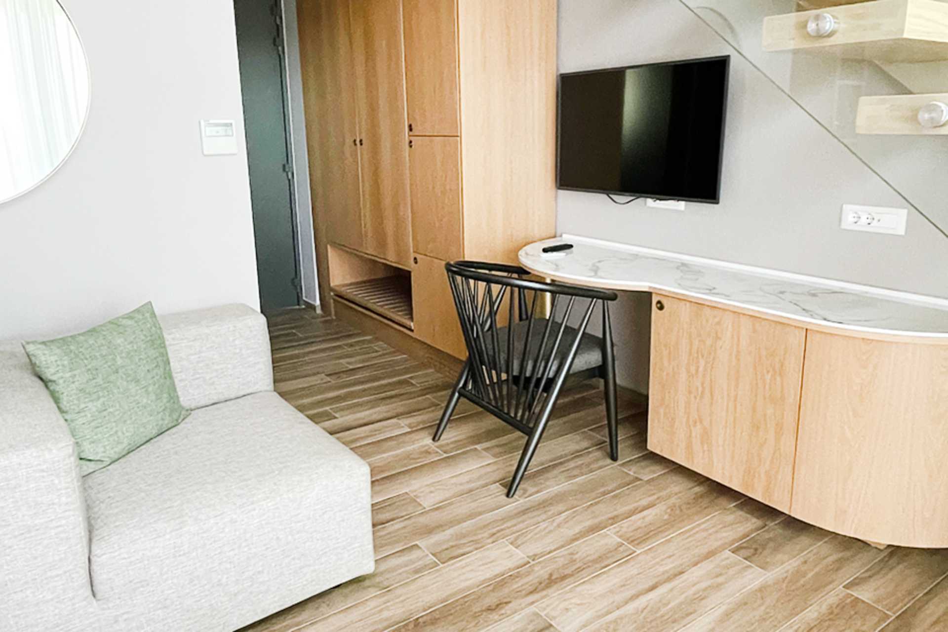 Dobbeltrom i etasje med balkong og utsikt. I første etasje er det stue med mulighet for ekstra senger i sovesofa, bad med dusj og toalett og terrasse. Ovenpå er det en komfortabel dobbeltseng og sengetøy fra CocoMat. Det er åpent mellom etasjene. Wifi, safe og luftkondisjonering inkludert. Kaffemaskin, kapsler ved ankomst deretter mot et gebyr. Kjøleskap. TV. Bluetooth-høyttalere kan lånes i resepsjonen mot et depositum. Hårføner. Rengjøring 7 ggr/uke.