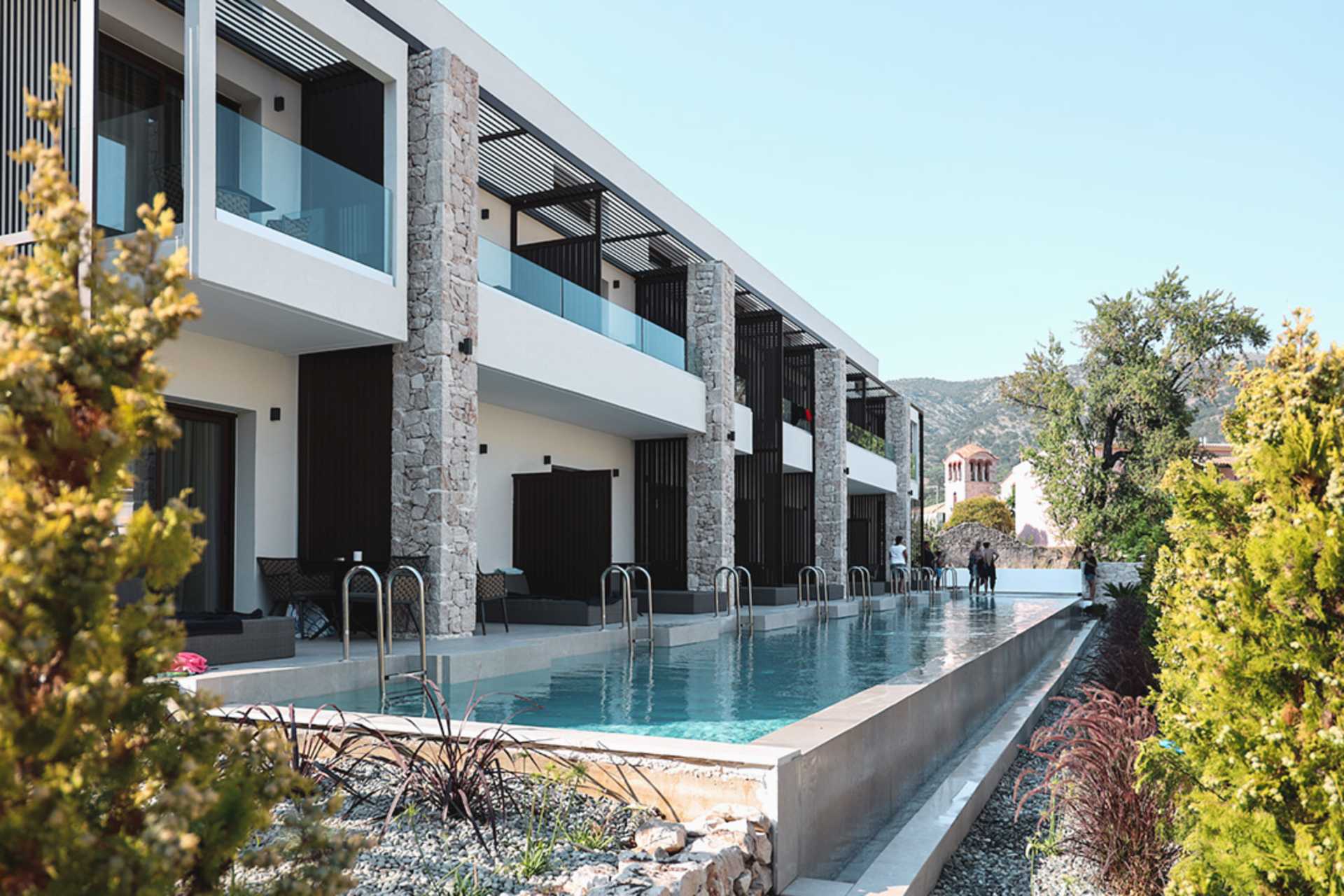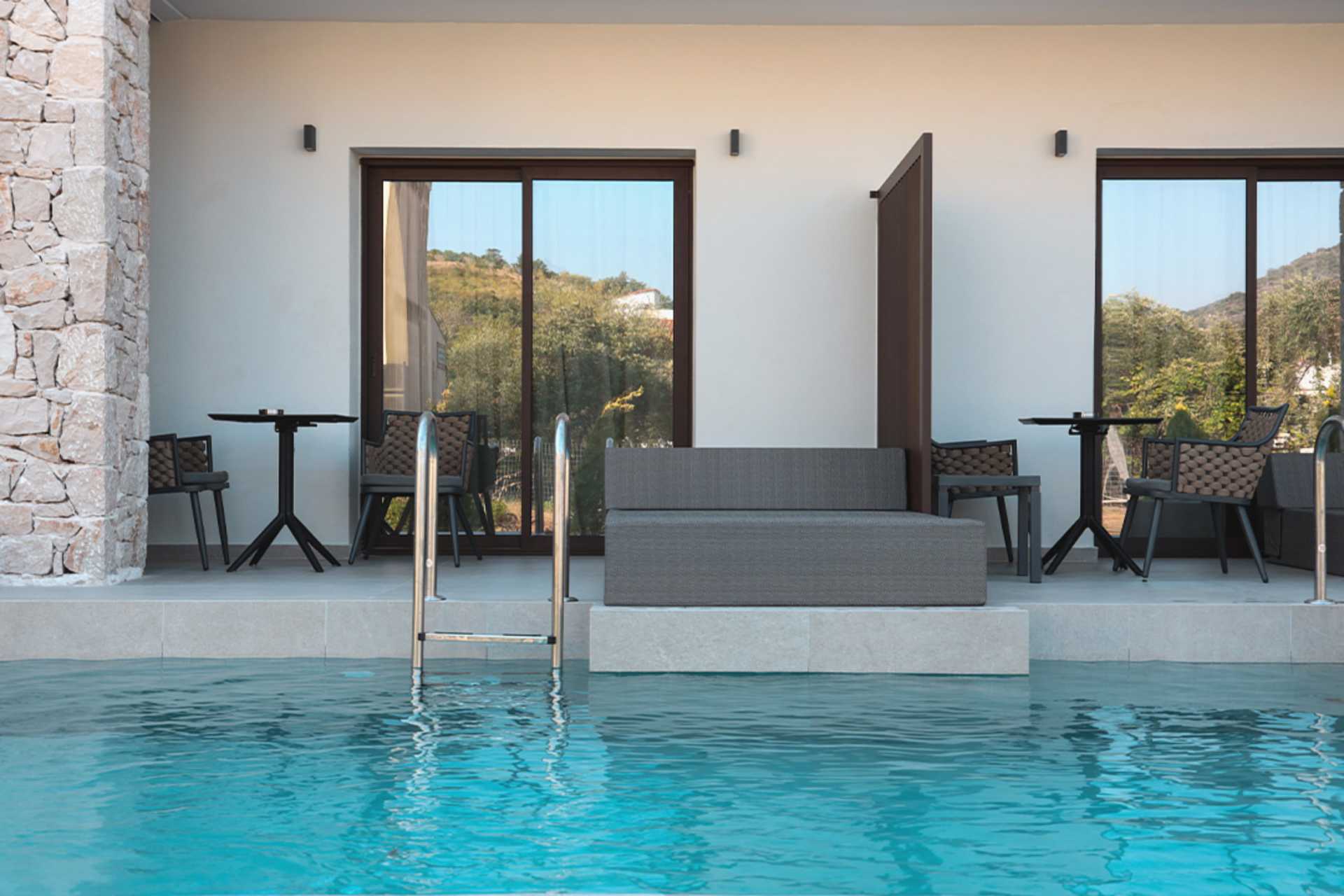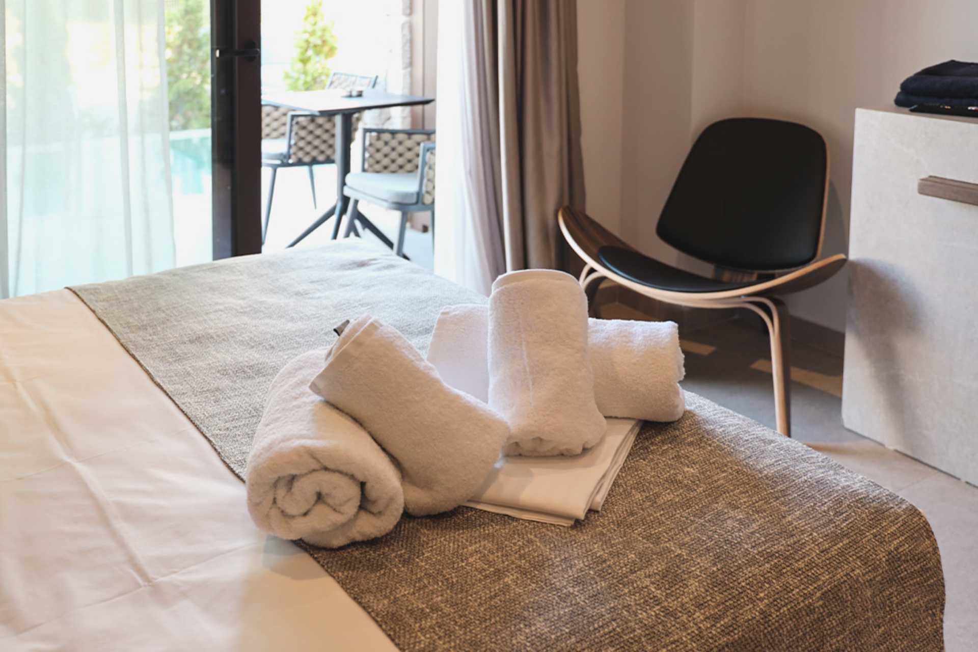 Dobbeltrom med utgang til fellesbasseng fra terrassen. En dobbeltseng. Wifi, luftkondisjonering og safe inkludert. Vannkoker samt kaffe og te. Kaffemaskin. Minibar med brus, vann og snacks ved ankomst er inkludert. TV. Hårføner. Badekåper og tøfler. Dusj og wc. Rengjøring 7 ggr/uke.