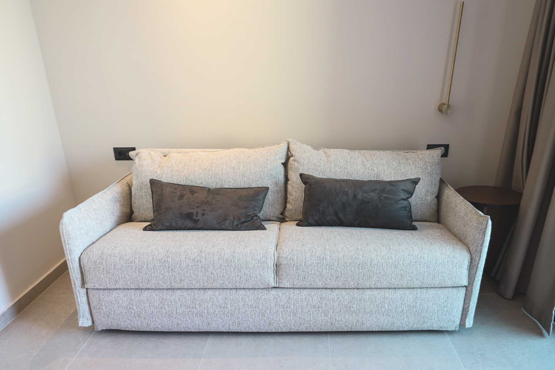 Familierom i etasje med balkong og utsikt over bassenget. Det er åpent mellom etasjene. I første etasje er det en stue med sovesofa, og en trapp opp er det en dobbeltseng. Wifi, luftkondisjonering og safe inkludert. Minibar med brus, vann og snacks er inkludert ved ankomst. Vannkoker samt kaffe og te. Kaffemaskin. Kokeplater. TV. Badekåper og tøfler. Hårføner. Dusj og wc. Rengjøring 7 ggr/uke.