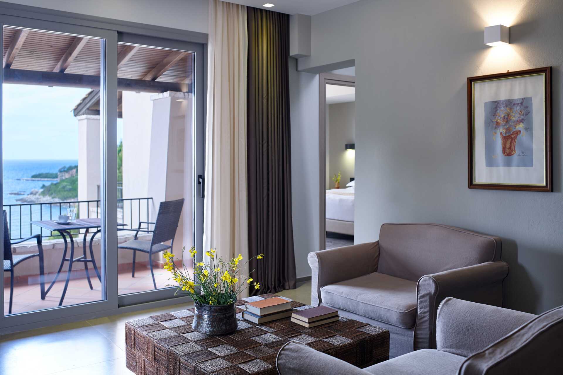 Suite med balkong eller terrasse og havutsikt. Suiten består av et soverom og en stue med sofaer, bord og lenestoler. En dobbeltseng eller to enkeltsenger. Mulig med ekstrasenger i oppredbare lenestoler. Wifi, luftkondisjonering og safe inkludert. Kjøleskap. Vannkoker samt kaffe og te. Kaffetrakter. Kaffemaskin med kapsler. TV. Strykejern og strykebrett. Badekåper og tøfler Hårføner. Dusj og wc. Rengjøring 7 ggr/uke.