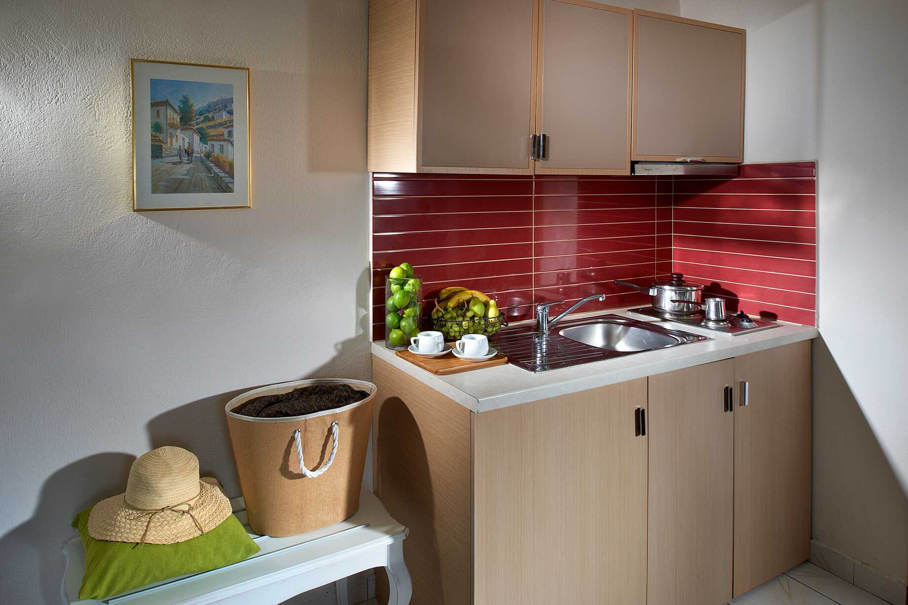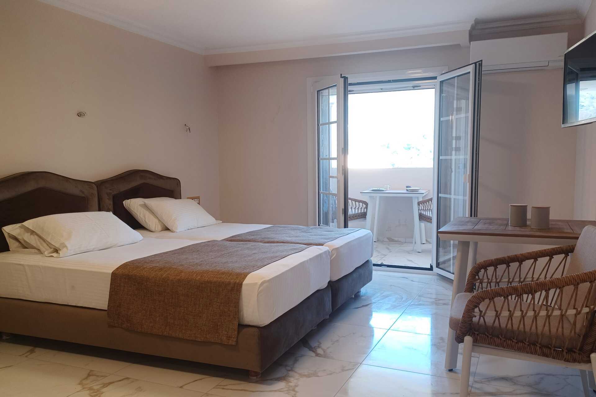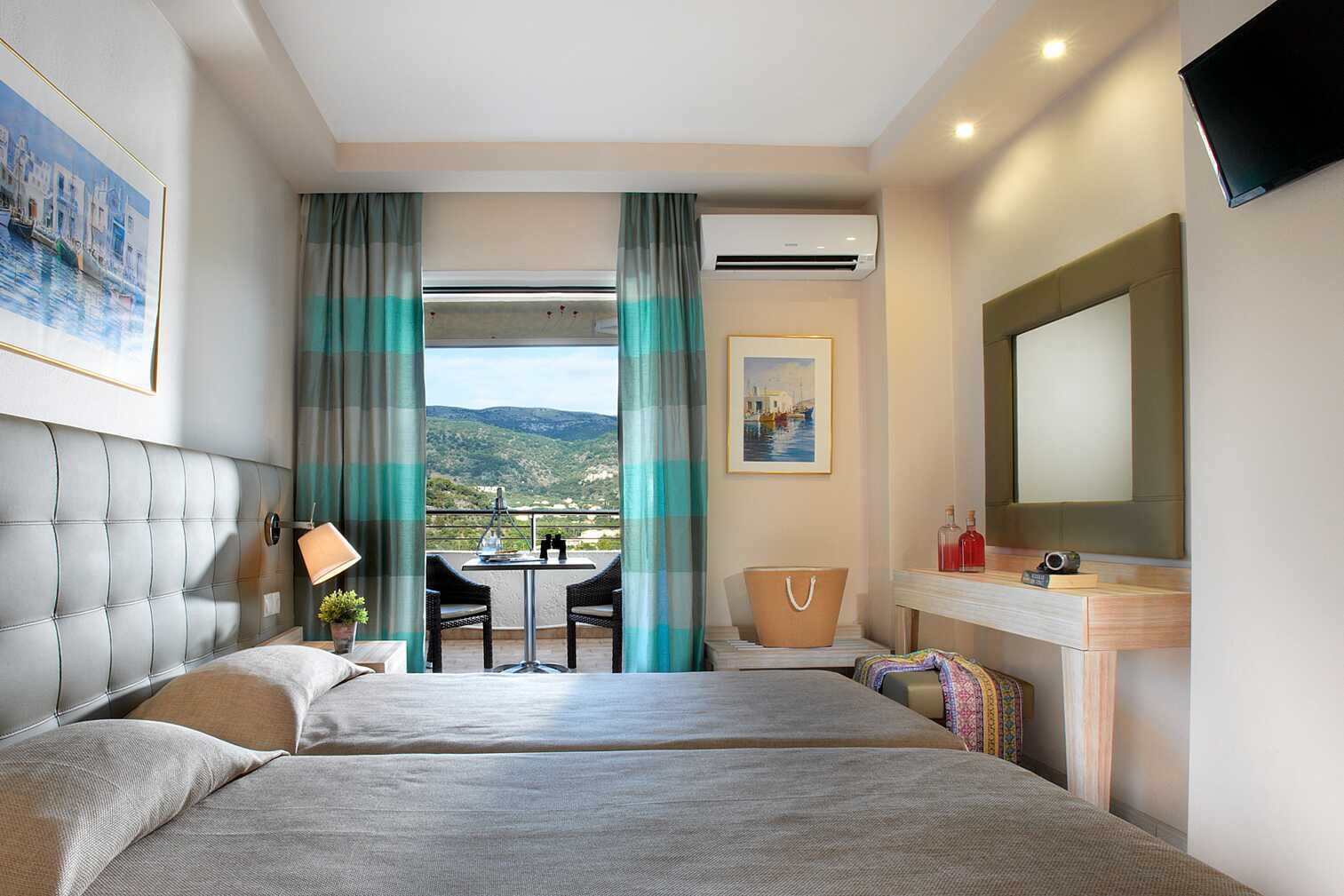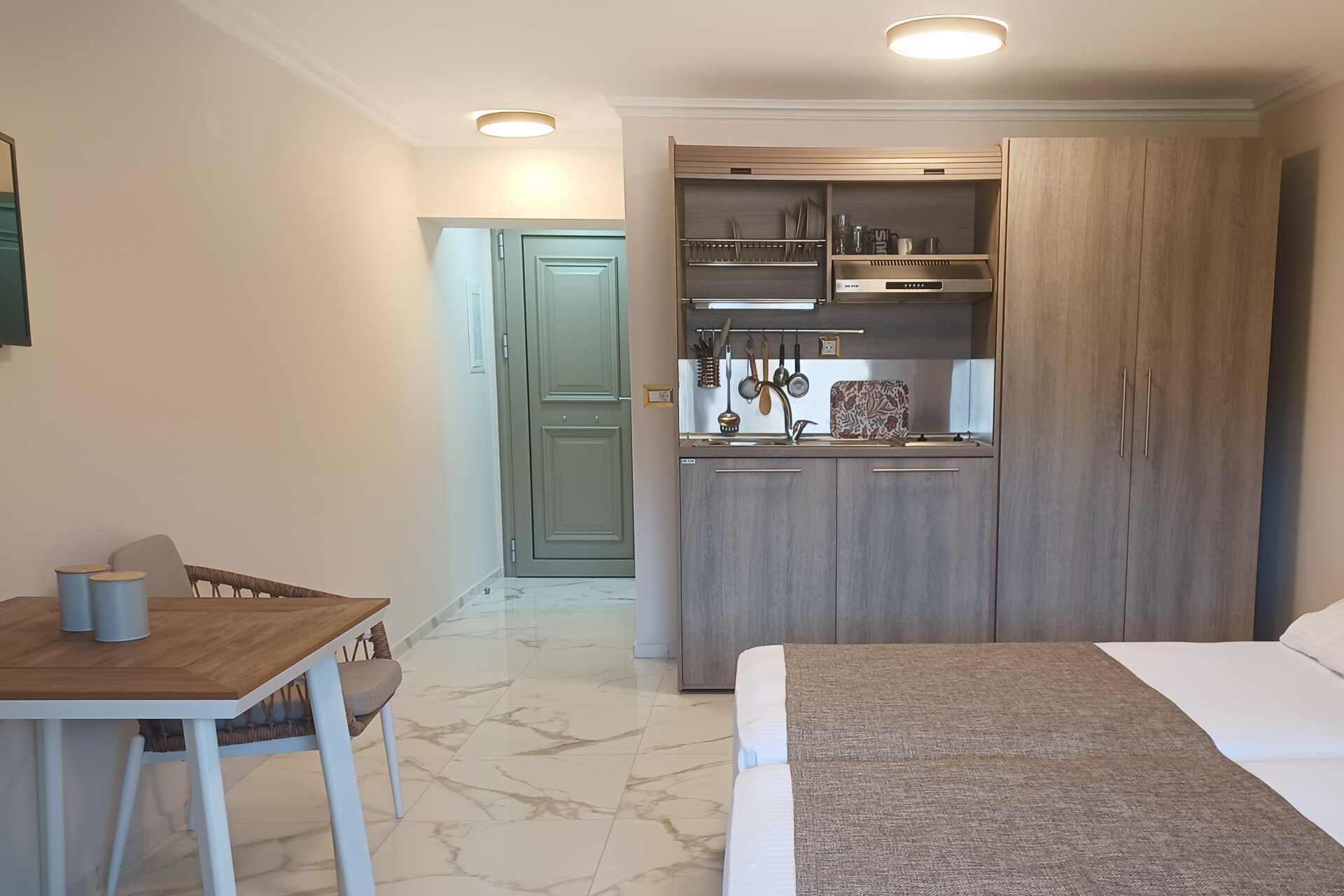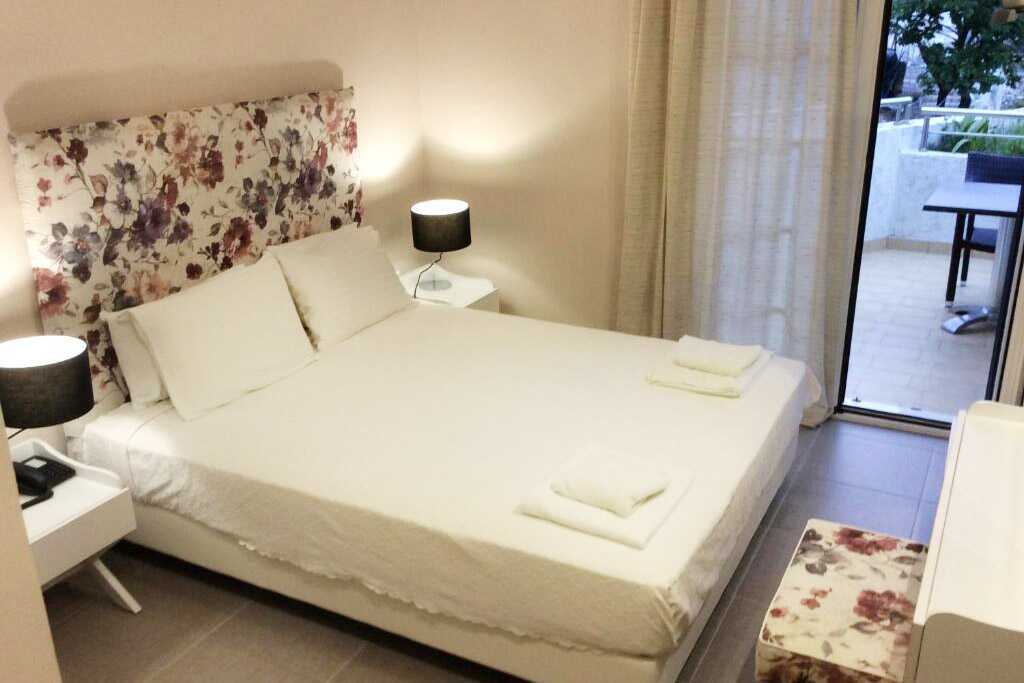 Toromsleilighet med balkong. Noen med havutsikt og noen med begrenset havutsikt. Et soverom og en stue med minikjøkken. En dobbeltseng. Mulig med ekstraseng i sovesofa. Minikjøkken med kokeplater, kaffetrakter, vannkoker, kjøleskap og enkelt kjøkkenutstyr. Wifi og luftkondisjonering er inkludert. Safe mot avgift. TV. Hårføner. Dusj og wc. Rengjøring 6 ggr/uke. Barn under 2 år regnes inn i maksantallet i rommet. Planløsning og interiørdesign kan variere mellom leilighetene.