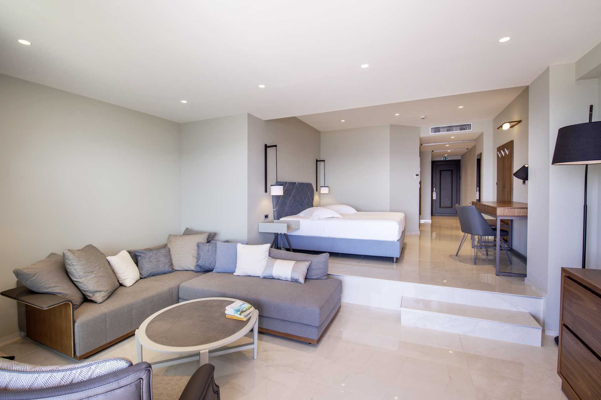 Suite med balkong og havutsikt eller begrenset havutsikt. En dobbeltseng eller to enkeltsenger. Mulig med ekstraseng i enkeltseng. Wifi, luftkondisjonering og safe inkludert. Minibar. TV. Badekåper og tøfler. Badekar og wc, hårføner. Rengjøring 7 ggr/uke.