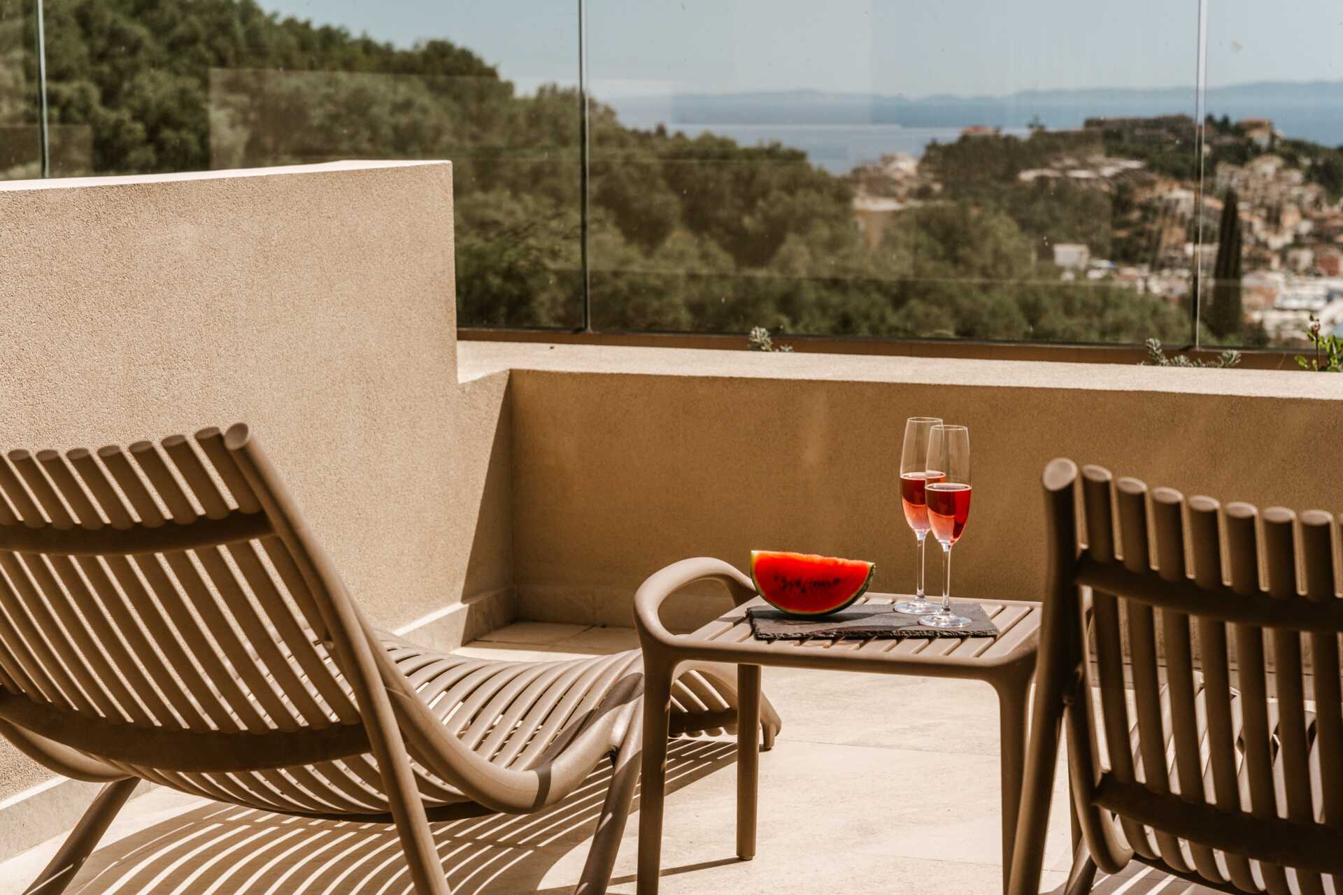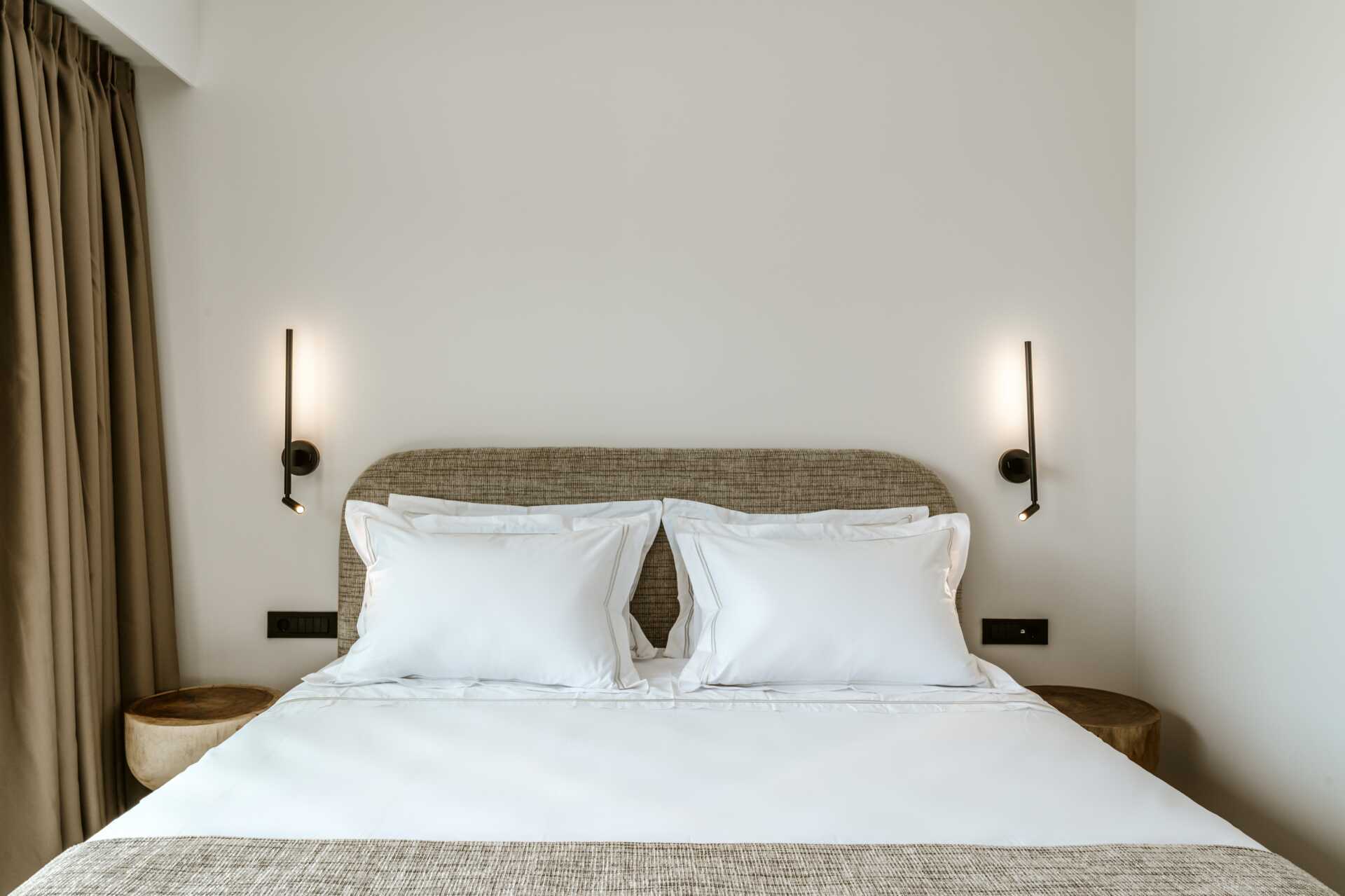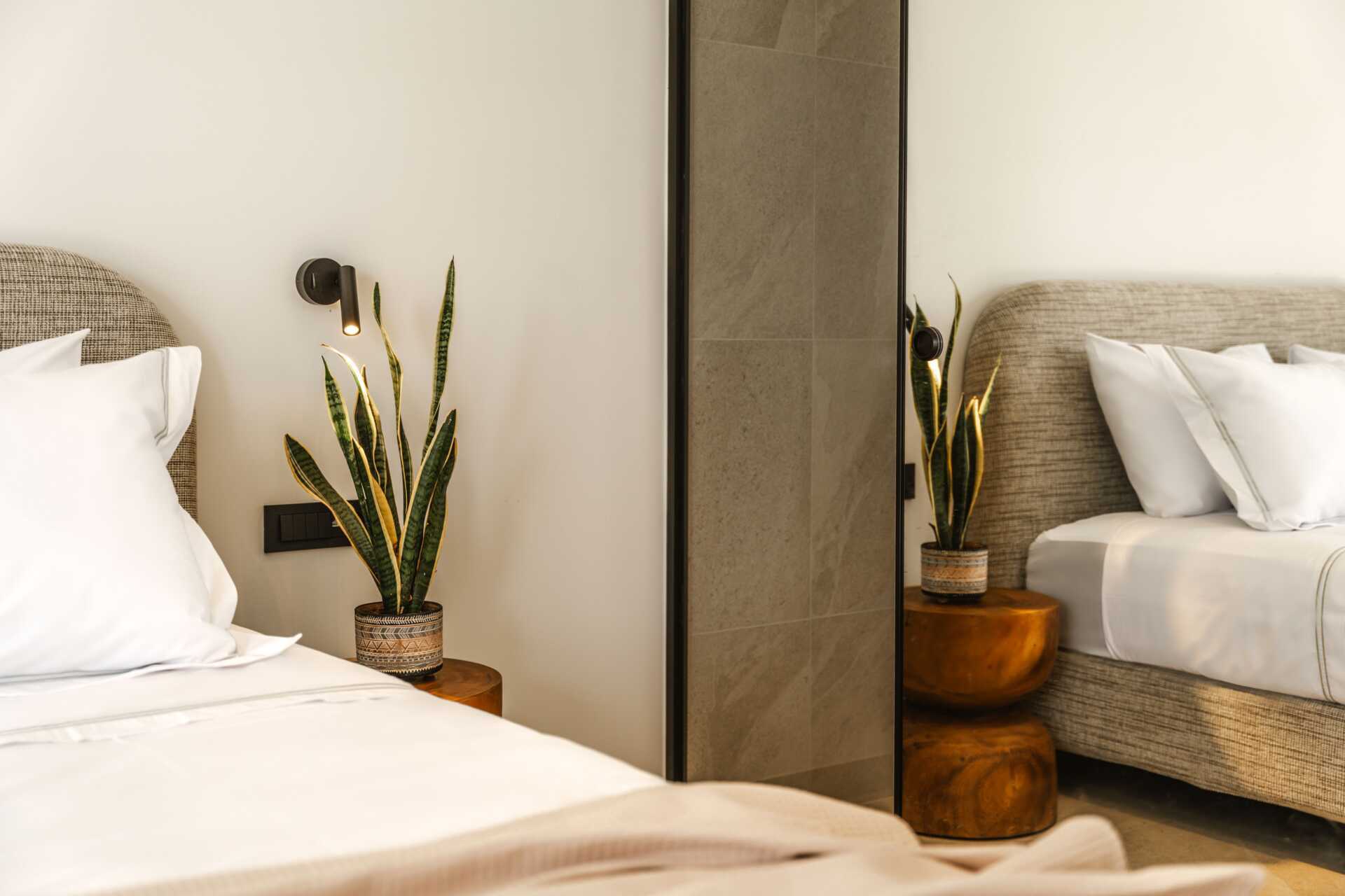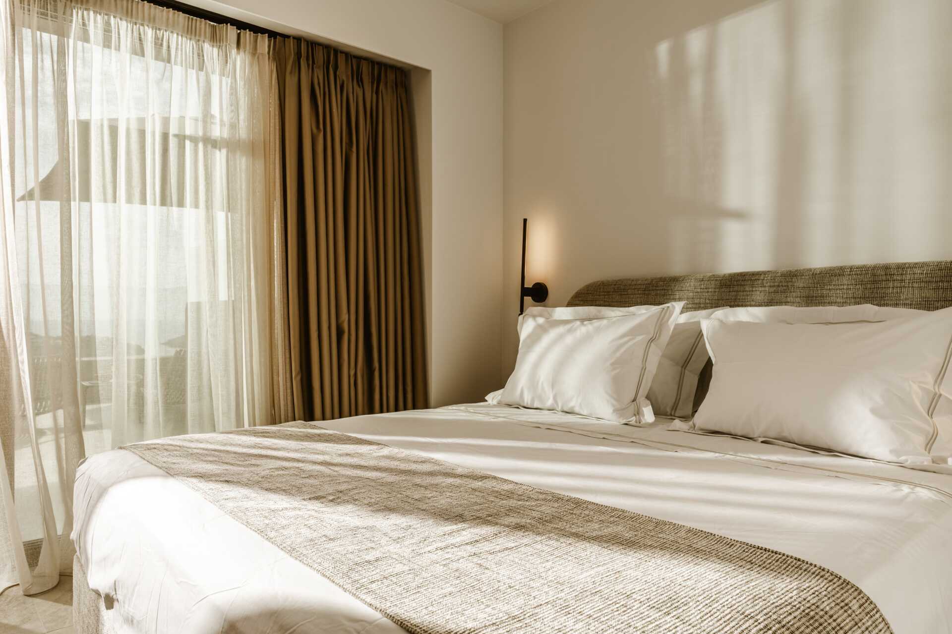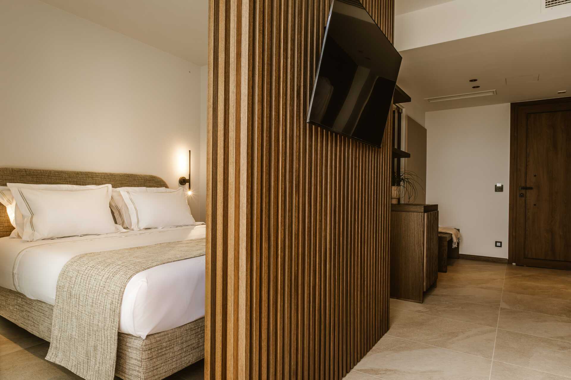 Dobbeltrom med terrasse i første etasje og privat basseng med havutsikt. En dobbeltseng. Wifi, luftkondisjonering og safe inkludert. Minibar. Vannkoker og te. TV med internasjonale kanaler. Hårføner. Bad med dusj og wc. Rengjøring 6 ggr/uke.