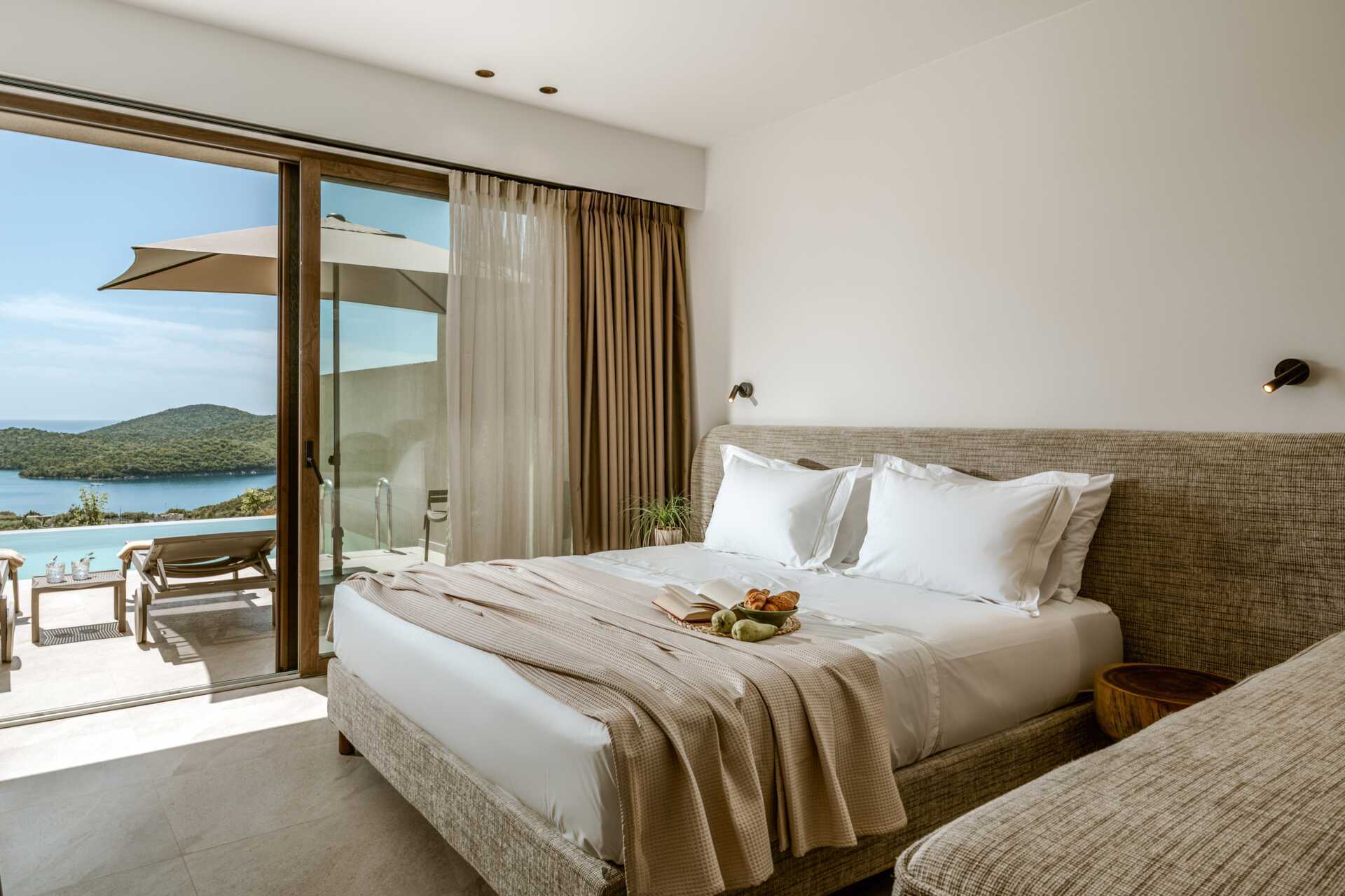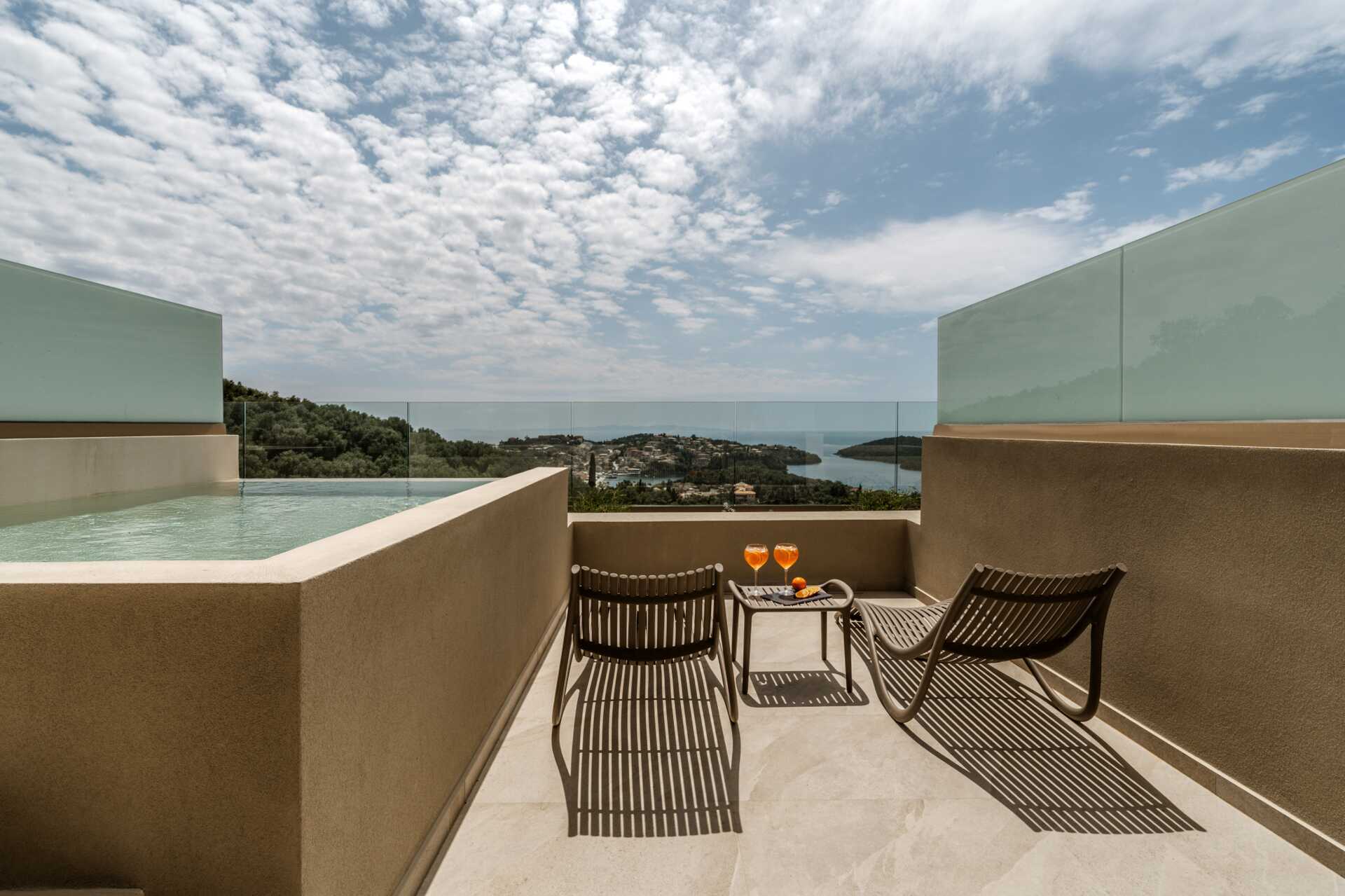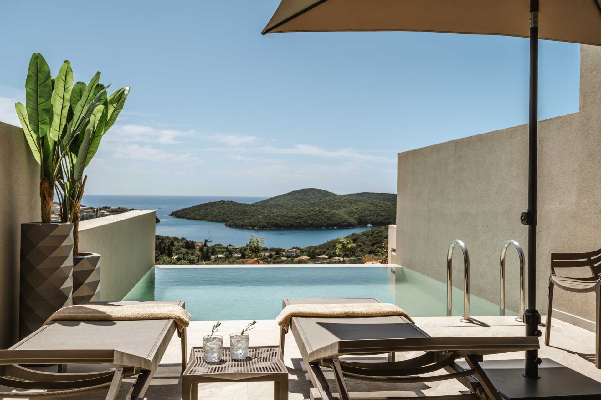 Juniorsuite med en plunge pool og havutsikt fra markterrassen. En dobbeltseng. Mulig med en ekstra enkeltseng. Wifi, luftkondisjonering og safe inkludert. Minibar. Vannkoker og te. TV. Hårføner. Bad med dusj og wc. Rengjøring 6 ggr/uke.