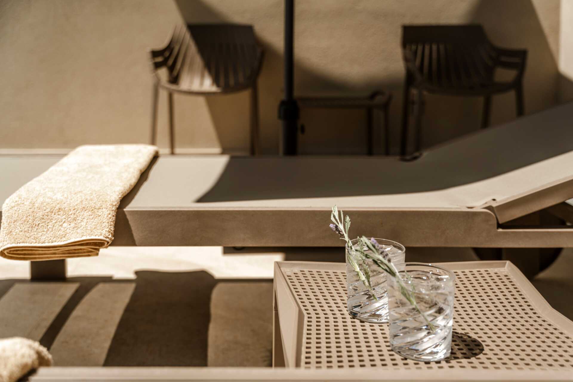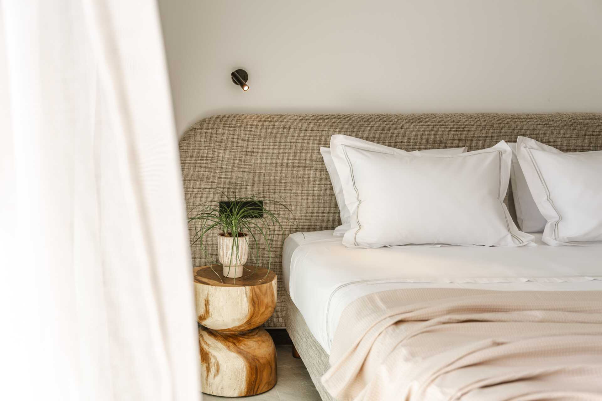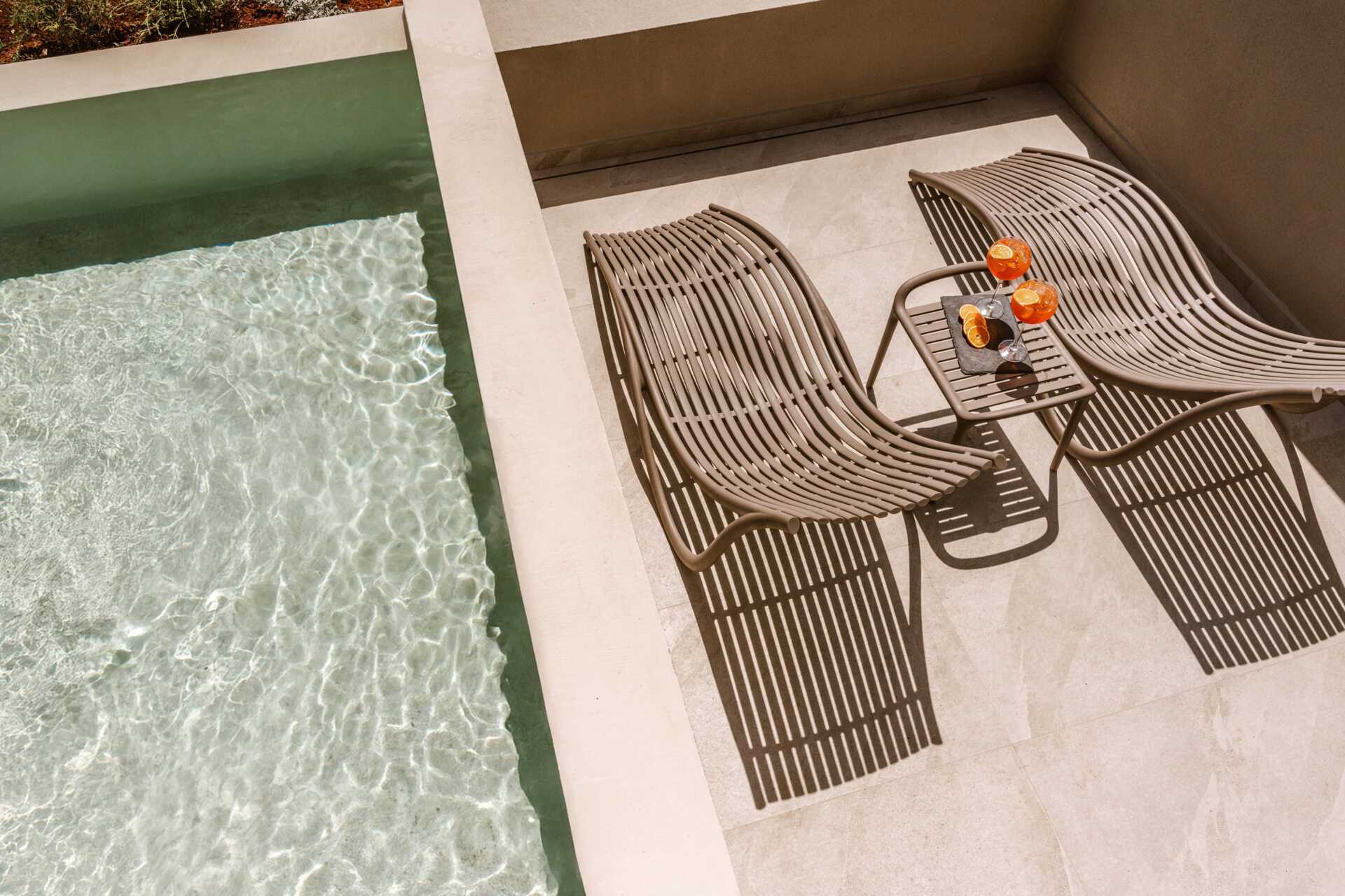 Juniorsuite med en plunge pool og havutsikt fra markterrassen. En dobbeltseng. Mulig med en ekstra enkeltseng. Wifi, luftkondisjonering og safe inkludert. Minibar. Vannkoker og te. TV. Hårføner. Bad med dusj og wc. Rengjøring 6 ggr/uke.