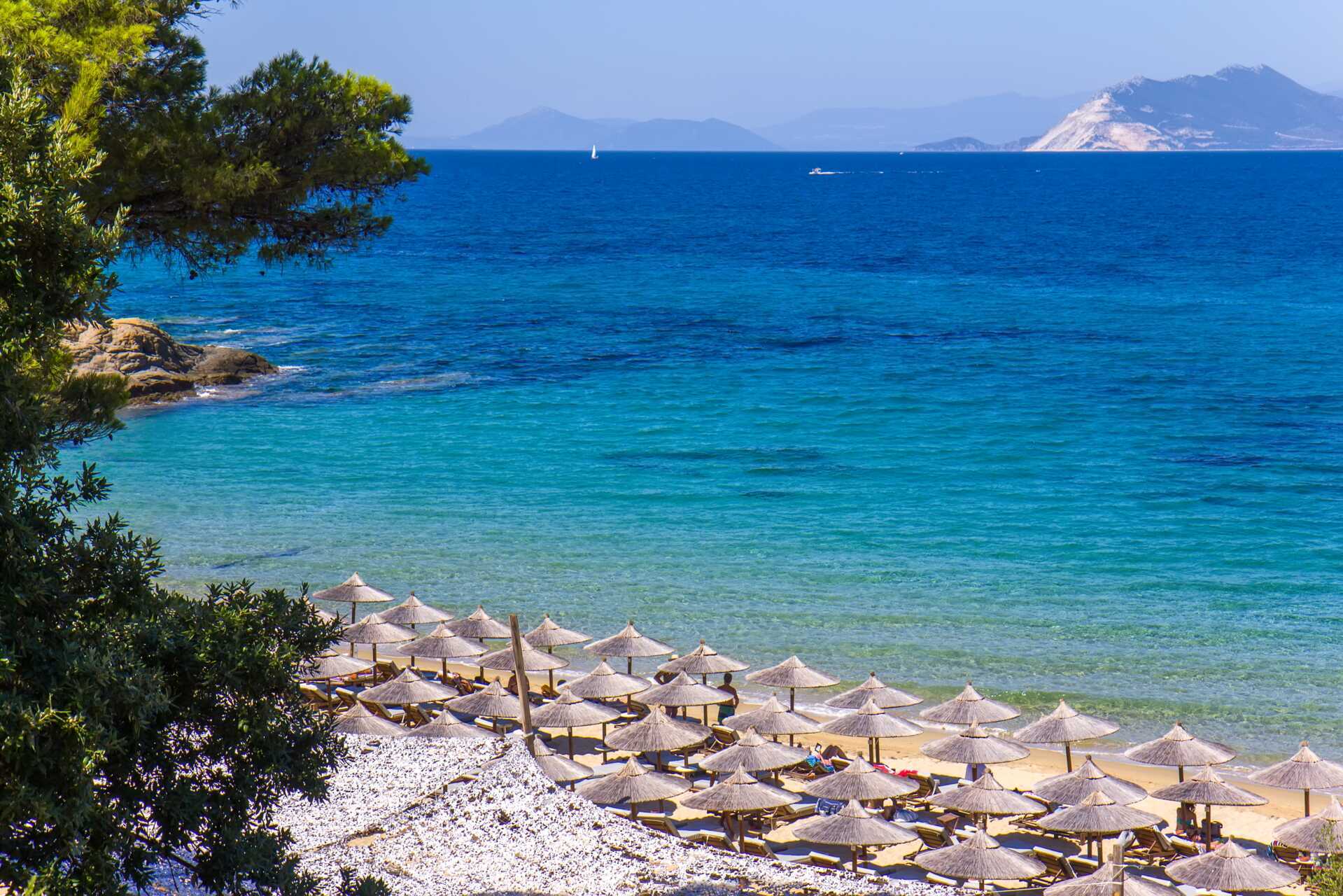 Langs den sørlige kysten ligger en rekke sandstrender, som lett nås med lokale busser eller taxier. Nesten alle strendene er omkranset av grøntområder, noe som gir en behagelig kjølighet. På mange av dem er det også enkle måltider og på de større kan du drive med morsomme vannsporter av alle slag. Best av alt er Koukounaries på sørvestkysten, regnet som en av Europas beste strender, med nydelig sand omgitt av furutrær. Hvis du ønsker å komme deg til den mer øde nordkysten, kan du bli med en fiskebåt, kaiki, til strender med steiner og grotter.