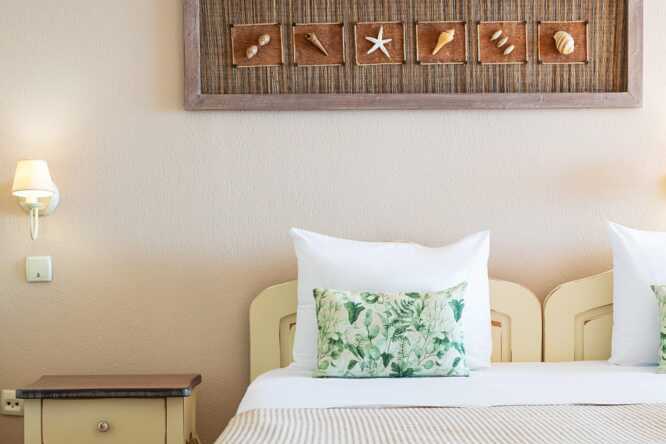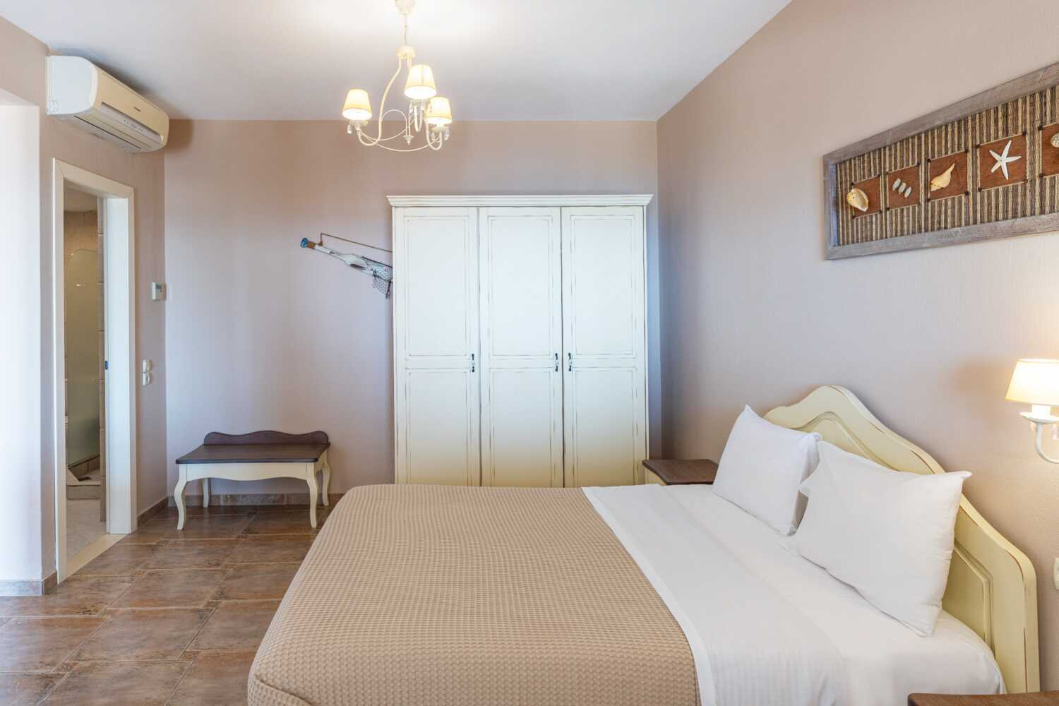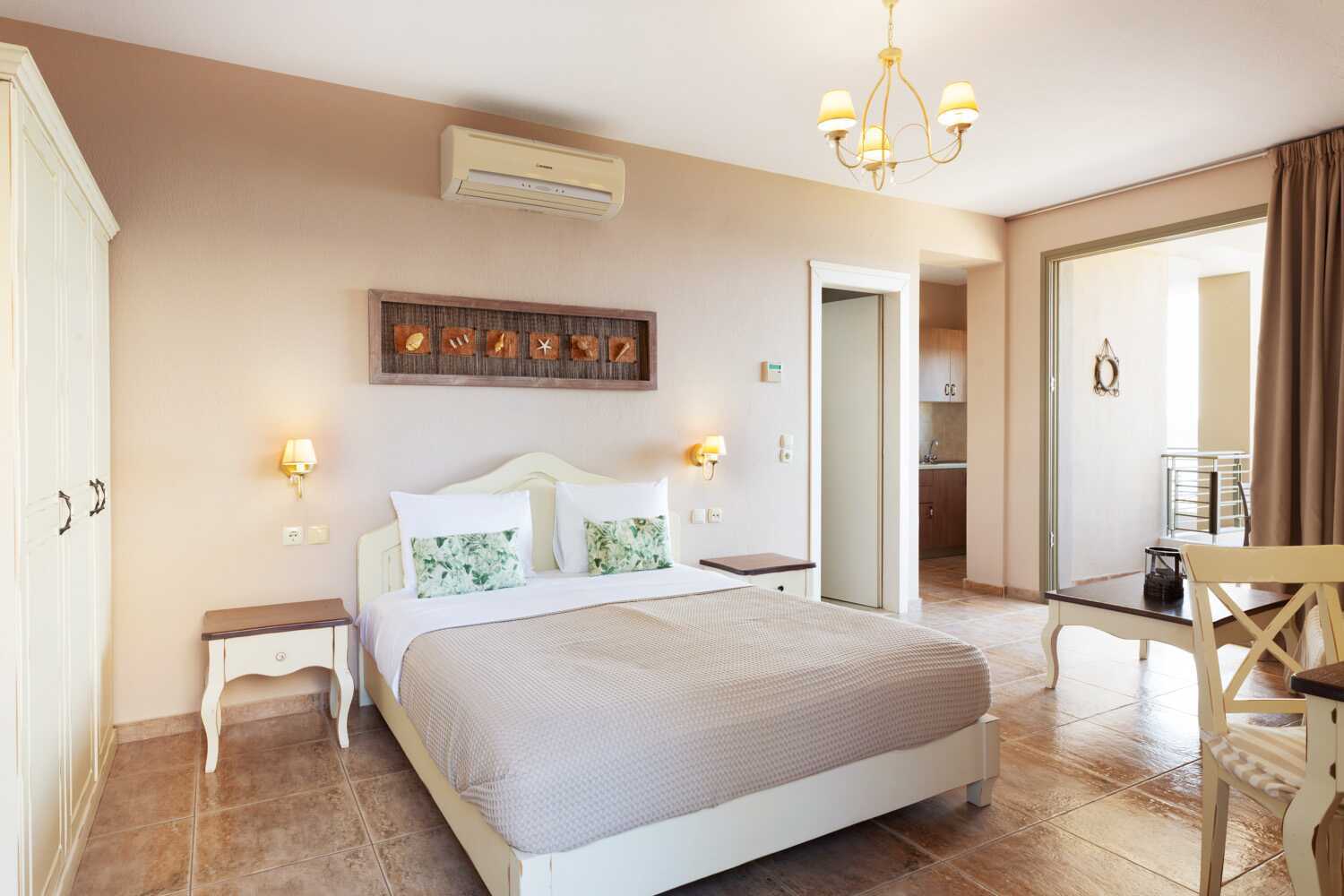 Ettromsleilighet med balkong og havutsikt eller markbalkong etasje og begrenset havutsikt. Kombinert soverom og minikjøkken. En dobbeltseng. Mulig med ekstraseng i sovesofa. Minikjøkken med kokeplater, kjøleskap, vannkoker, kaffetrakter, brødrister og enkelt kjøkkenutstyr. Wifi, luftkondisjonering og safe inkludert. TV med lokale kanaler. Hårføner. Bad med dusj og wc. Rengjøring 6 ggr/uke.