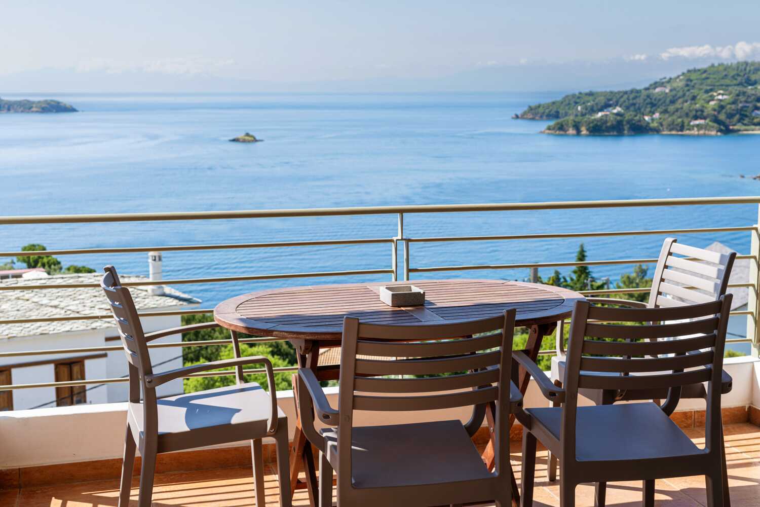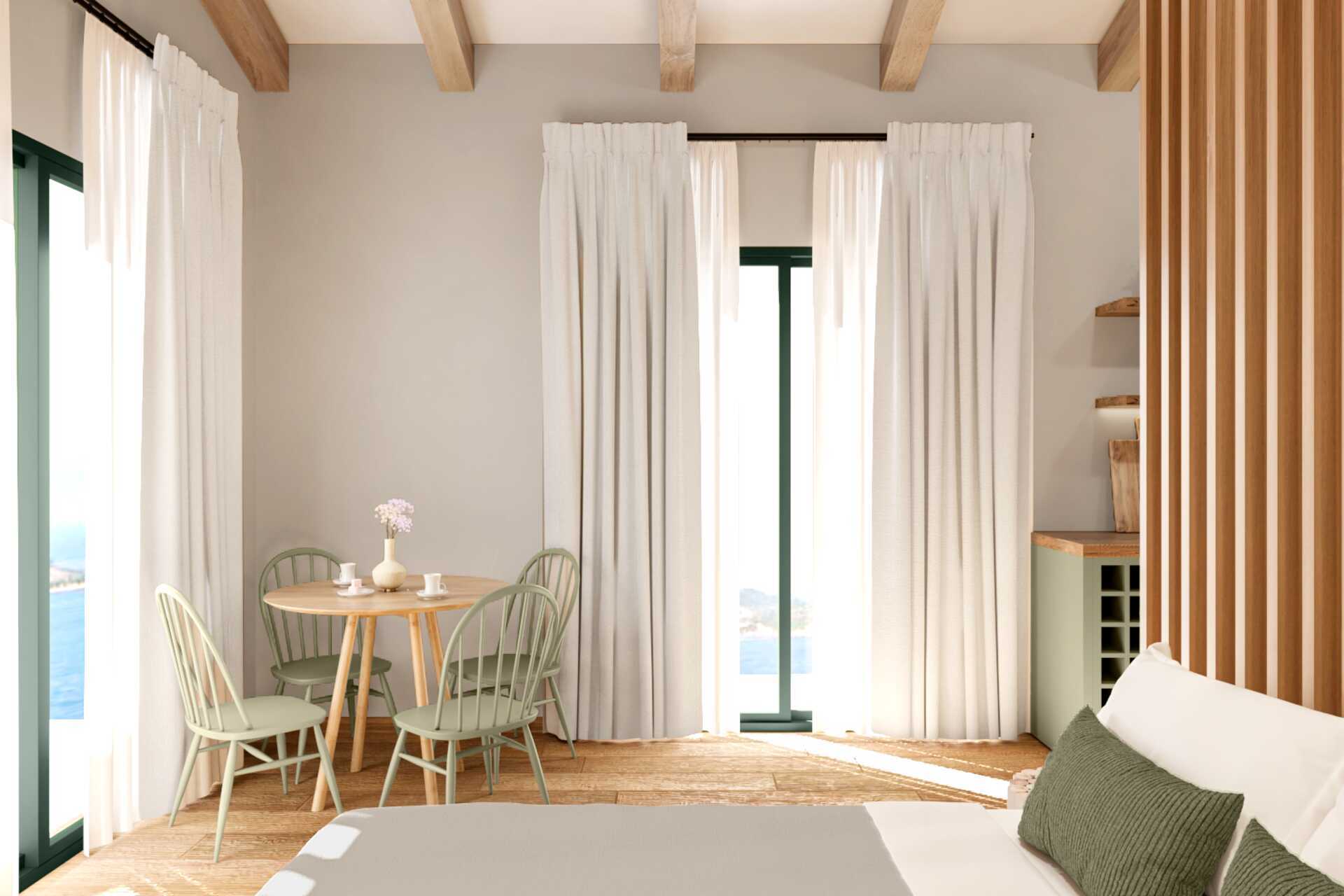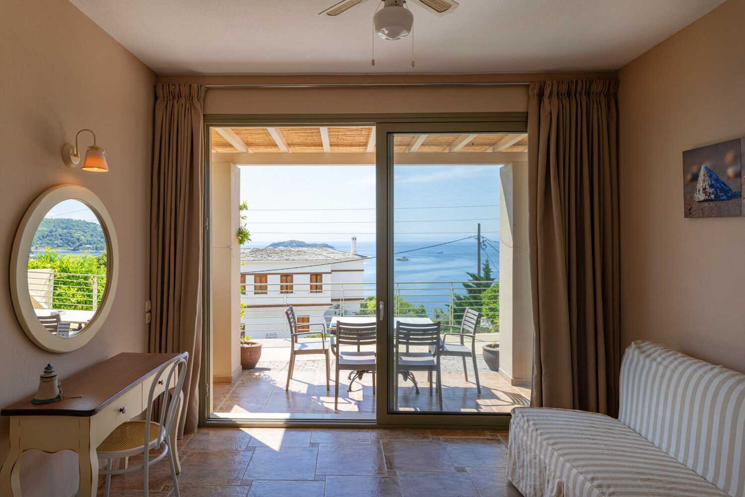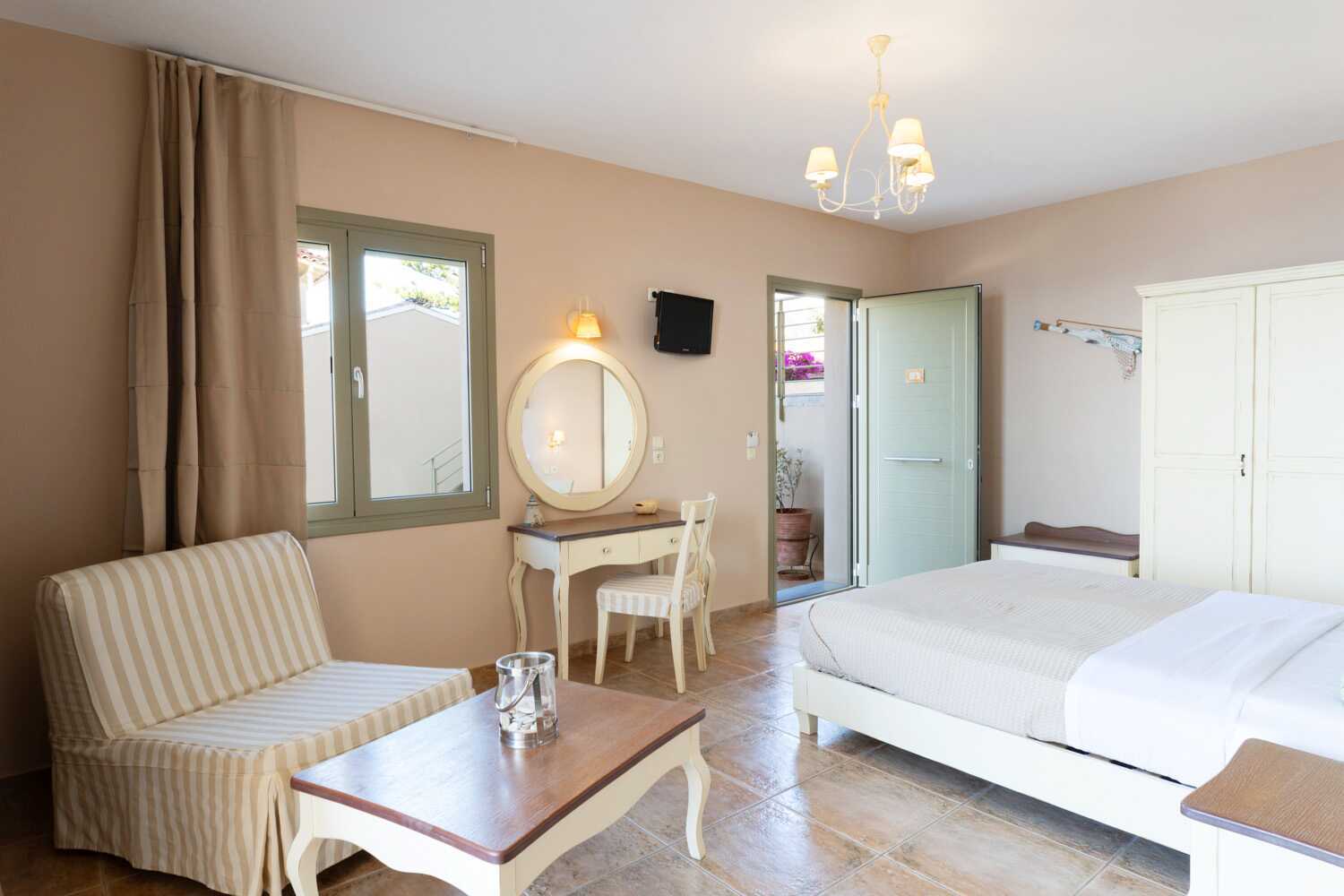 Toromsleilighet med markterrasse og havutsikt. Et soverom og stue med minikjøkken. En dobbeltseng. Mulig med ekstrasenger i sovesofa. Minikjøkken med kokeplater, kjøleskap, vannkoker, kaffetrakter, brødrister og enkelt kjøkkenutstyr. Wifi, luftkondisjonering og safe inkludert. TV med lokale kanaler. Hårføner. Bad med dusj og wc. Rengjøring 6 ggr/uke.