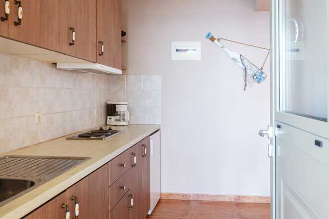 Renovert ettromsleilighet i etasje med balkong og havutsikt. I inngangsplanet er det en stue med dobbeltseng og et minikjøkken, og oppe er det en hems med to enkeltsenger. Minikjøkken med kokeplater, kjøleskap, vannkoker, kaffetrakter, brødrister og enkelt kjøkkenutstyr. Wifi, luftkondisjonering og safe inkludert. TV med lokale kanaler. Hårføner. Bad med dusj og wc. Rengjøring 6 ggr/uke.