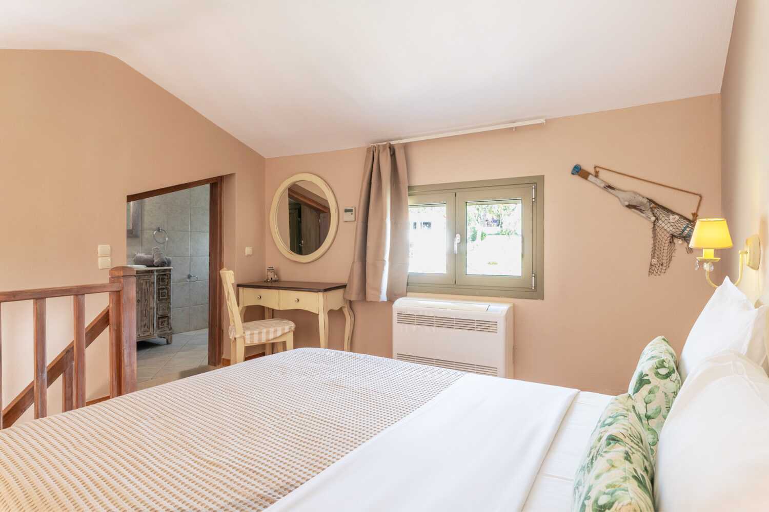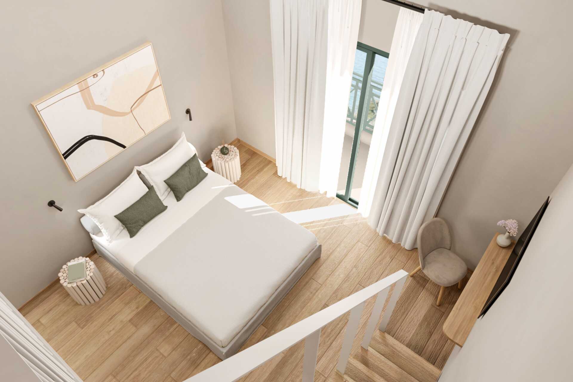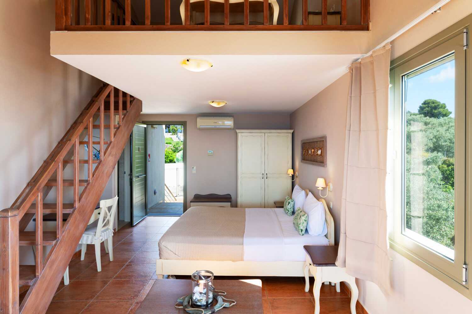 Ettromsleilighet i etasje med balkong og havutsikt. I inngangsplanet er det en stue med dobbeltseng og et minikjøkken, og oppe er det en hems med dobbeltseng. Minikjøkken med kokeplater, kjøleskap, vannkoker, kaffetrakter, brødrister og enkelt kjøkkenutstyr. Wifi, luftkondisjonering og safe inkludert. TV med lokale kanaler. Hårføner. To bad med dusj og wc. Rengjøring 6 ggr/uke.
