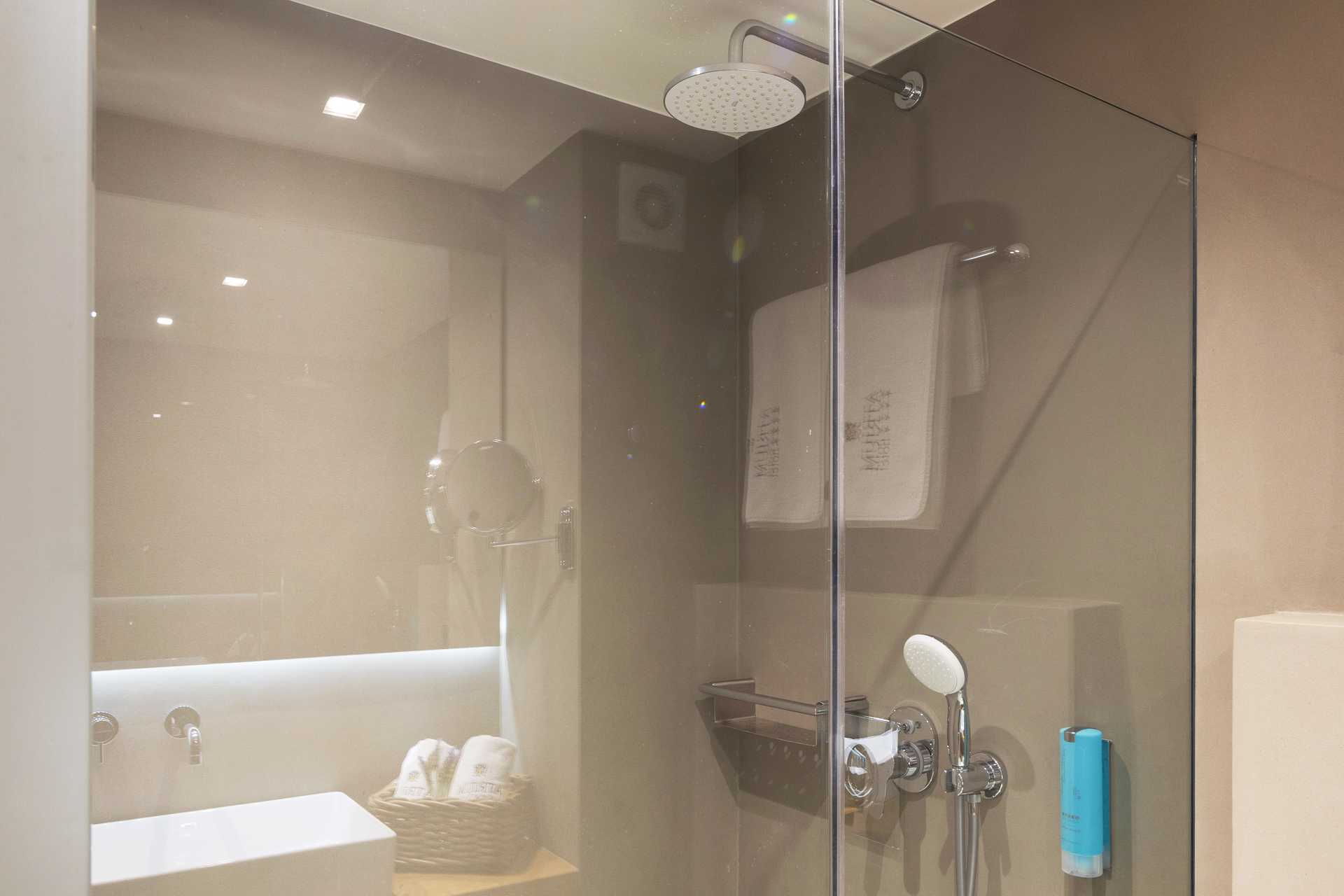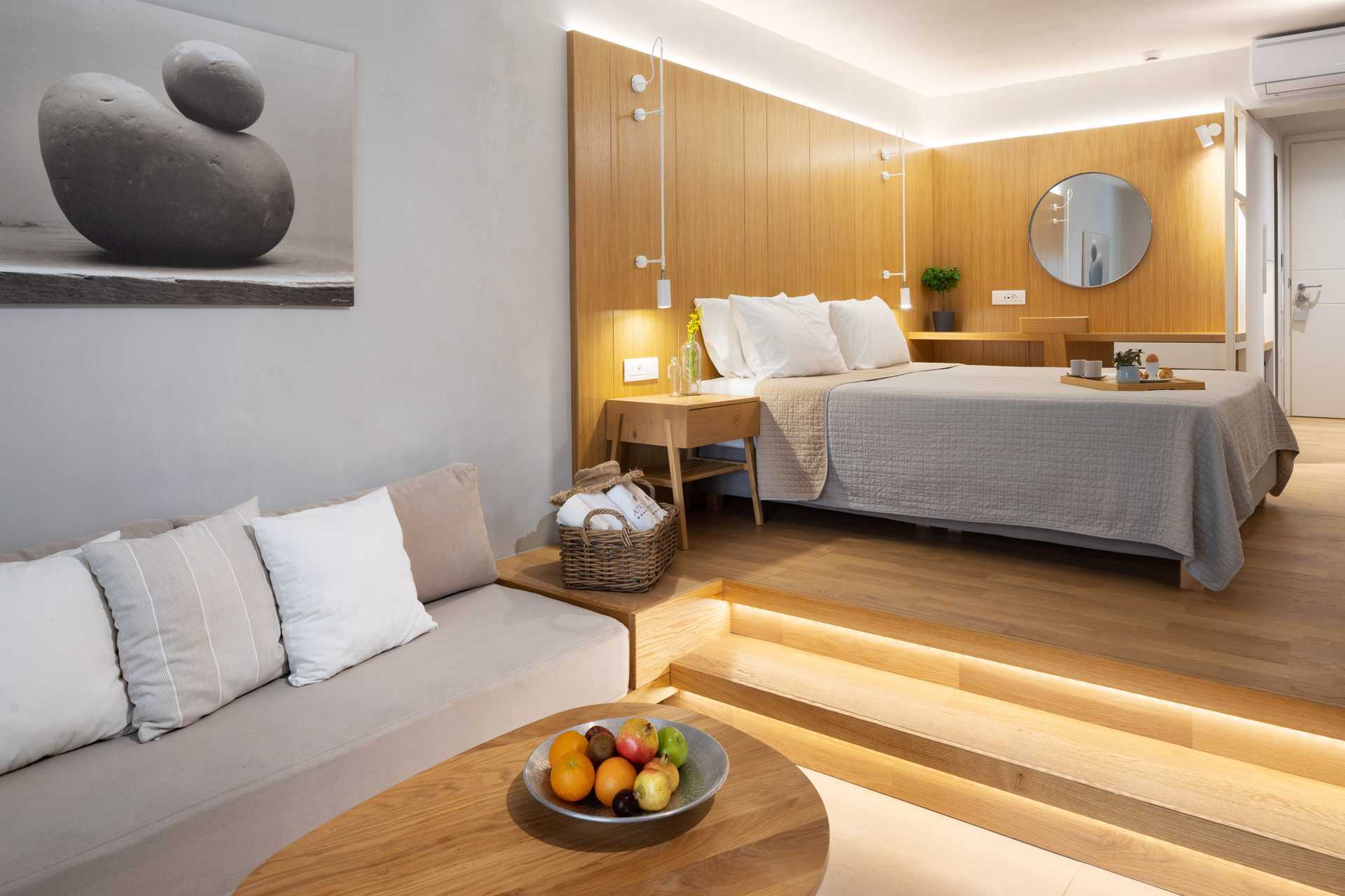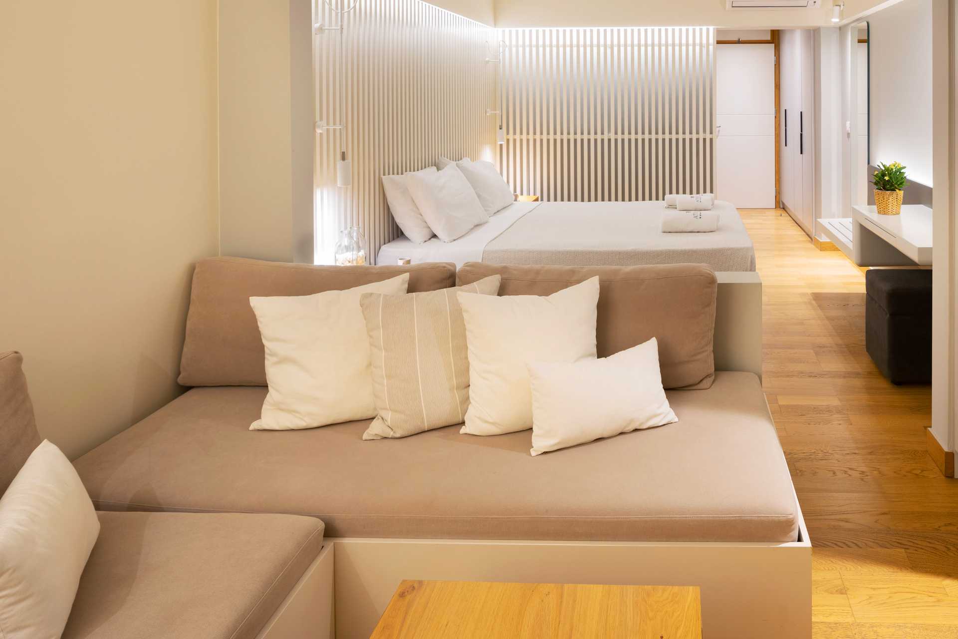 Juniorsuite med balkong eller terrasse. Juniorsuiten består av et soverom og en stue i åpen løsning med en liten nivåforskjell på to-tre trappetrinn. En dobbeltseng eller to enkeltsenger. Mulig med ekstraseng i én eller to innebygde sovesofaer. Wifi og safe er inkludert, samt luftkondisjonering i perioden 1. juni til 20. september. Kjøleskap. Vannkoker samt kaffe og te. TV. Hårføner. Baderom med dusj og wc. Rengjøring 7 ggr/uke.