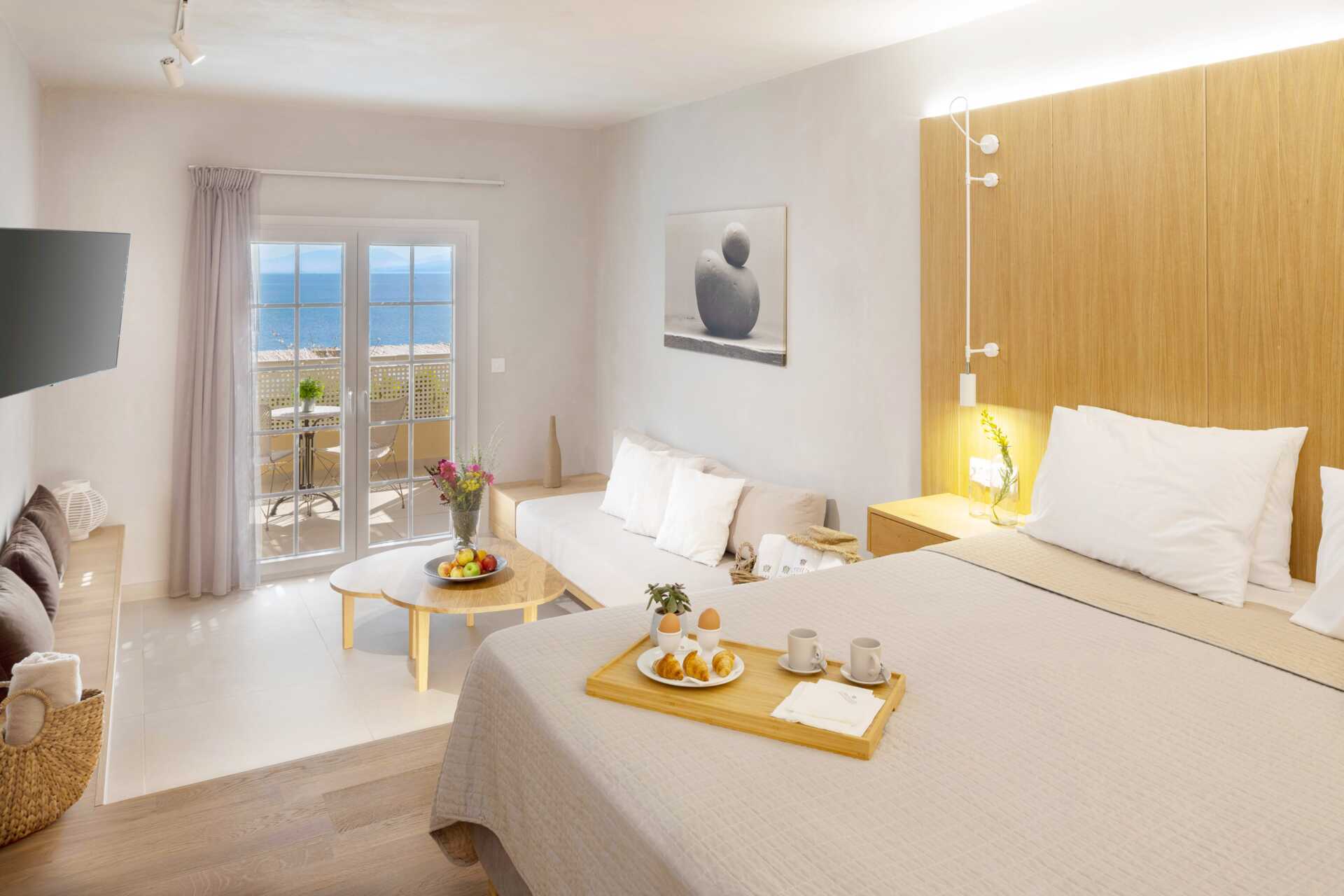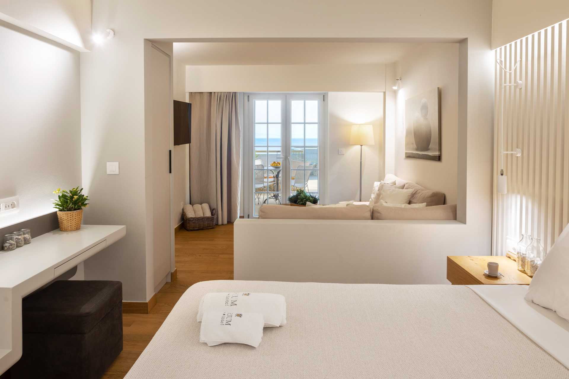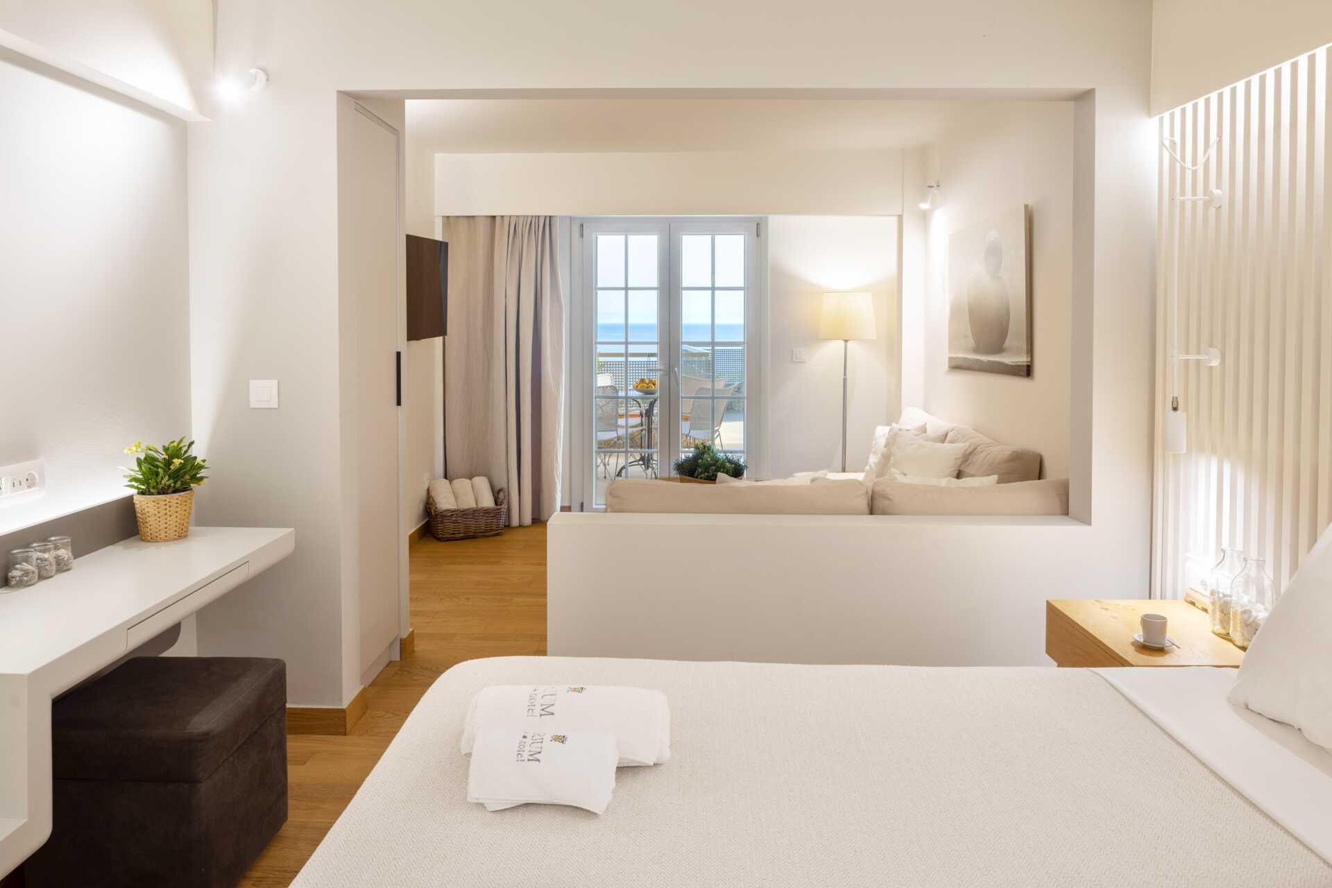 Juniorsuite deluxe med balkong eller terrasse med havutsikt. Juniorsuiten består av et soverom og en stue i åpen planløsning med en liten nivåforskjell på to-tre trappetrinn mellom delene. To enkeltsenger. Mulig med ekstraseng i én eller to veggmonterte sovesofaer. Wifi og safe er inkludert, samt luftkondisjonering fra 1. juni til 20. september. Kjøleskap. Vannkoker samt kaffe og te. TV. Hårføner. Baderom med dusj og wc. Rengjøring 7 ggr/uke.