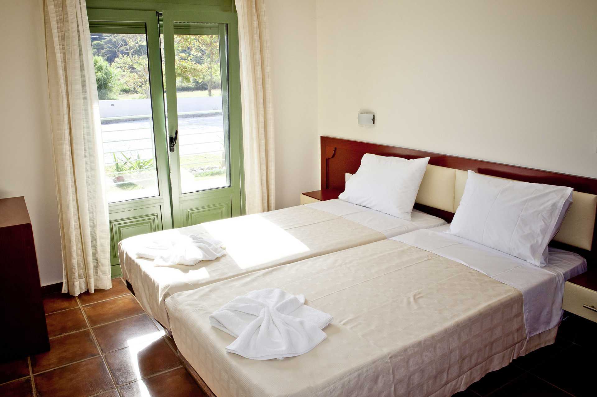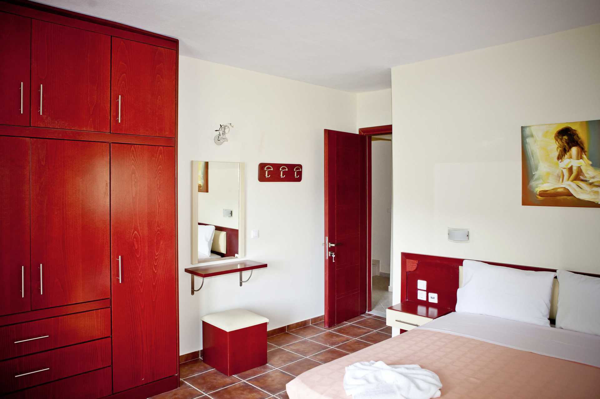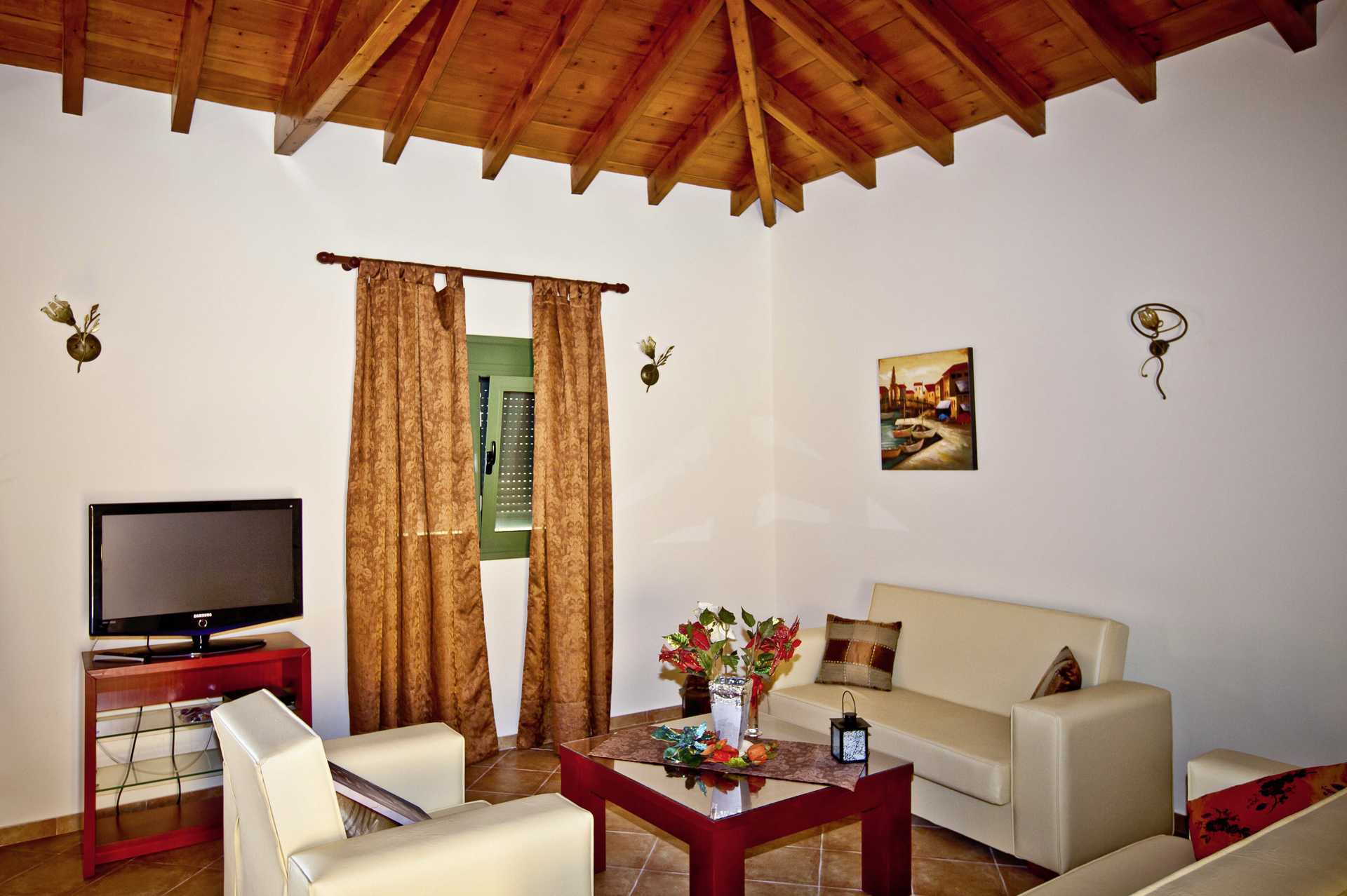 Treroms villa i to etasjer med eget basseng. Uteplassen har solsenger og parasoller. En trapp opp er det et kjøkken og stue i åpen løsning, en balkong og et bad med hårføner, vaskemaskin, dusj og wc. Kjøkkenet har komfyr, kaffetrakter, brødrister, vannkoker, kjøleskap med fryser og enkelt kjøkkenutstyr. I stuen er det en sovesofa for én person. TV med lokale kanaler. I første etasje er det to soverom, ett med dobbeltseng og ett med to enkeltsenger. Luftkondisjonering og wifi inkludert. Strykejern og strykebrett. Rengjøring 2 ggr/uke.