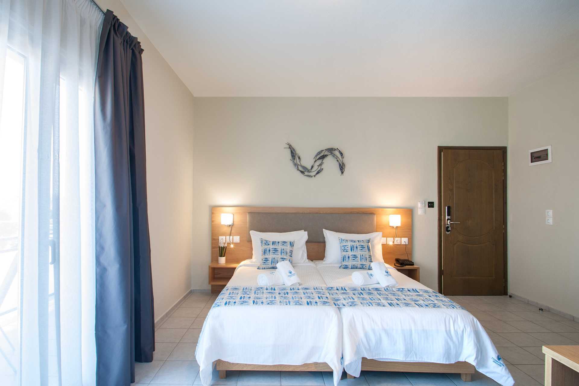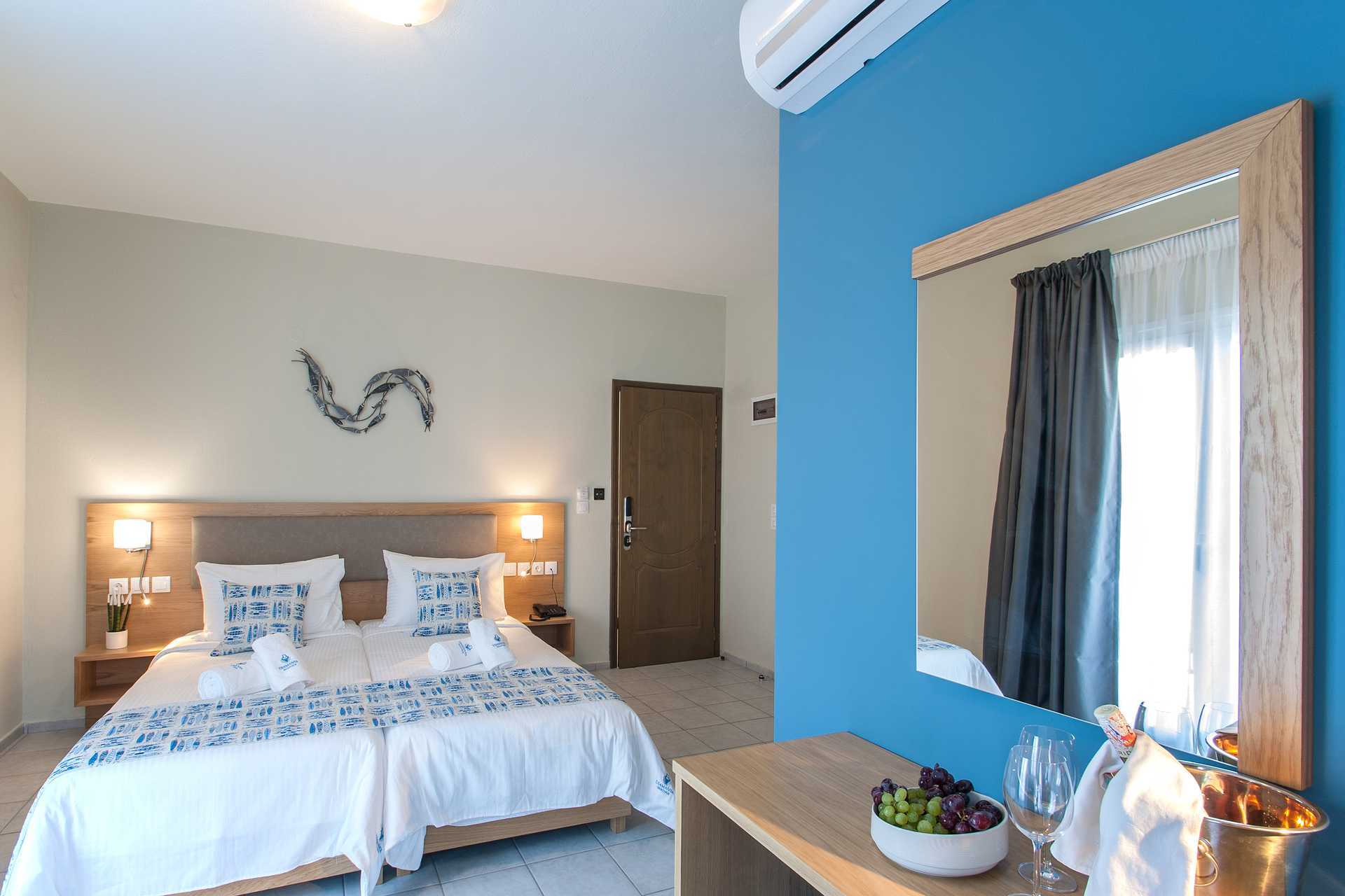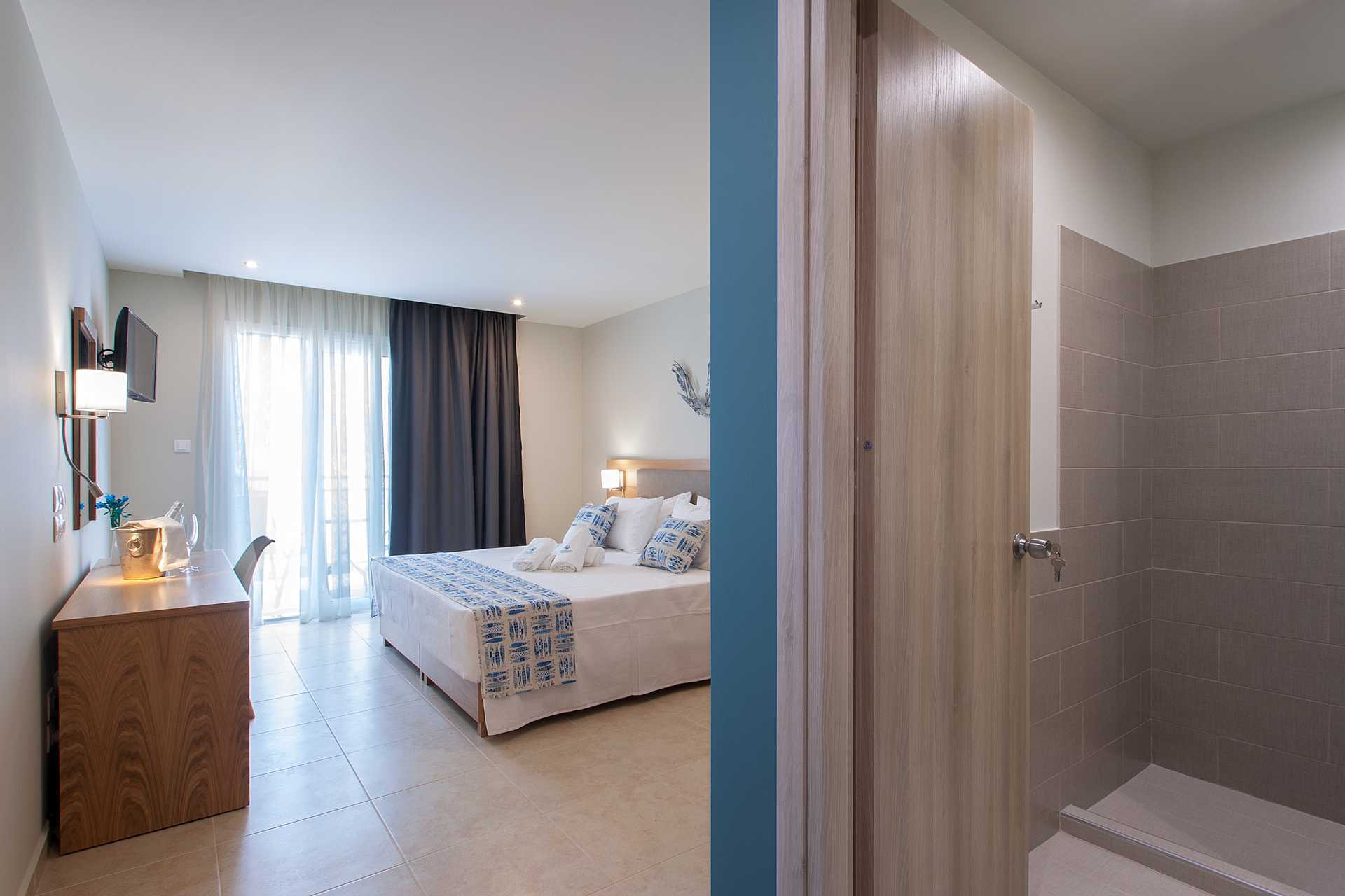 Deluxerom med balkong eller markbalkong med utsikt mot bassenget. En dobbeltseng eller to enkeltsenger. Wifi, luftkondisjonering og safe inkludert. Kjøleskap. TV. Hårføner. Baderom med dusj og wc. Rengjøring 6 ggr/uke.