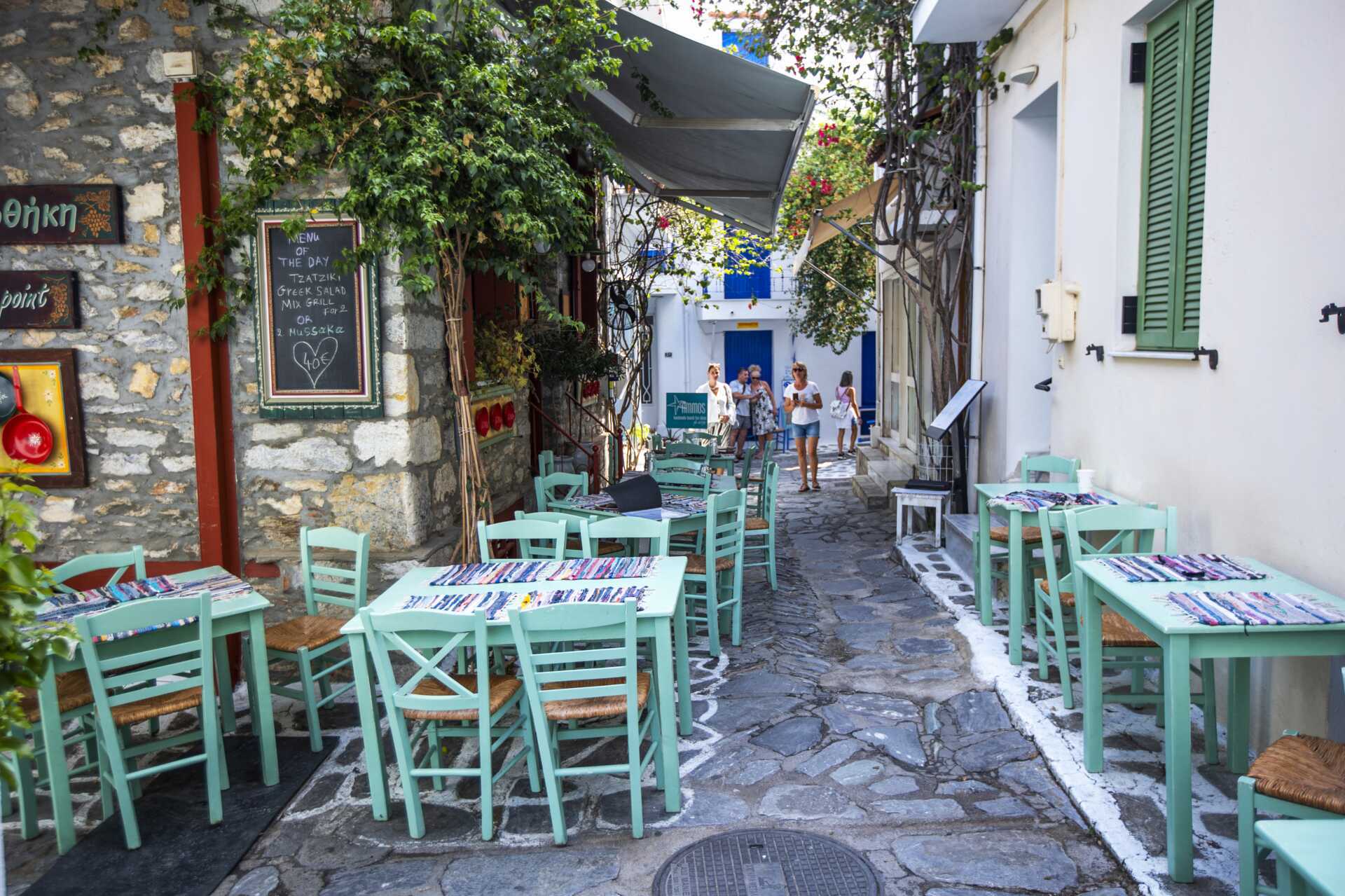 I byen Skiathos er det mange restauranter med alle tenkelige menyer, et pulserende natteliv og gode shoppingmuligheter. Byen er moderne og veldig populær blant oss skandinaver.