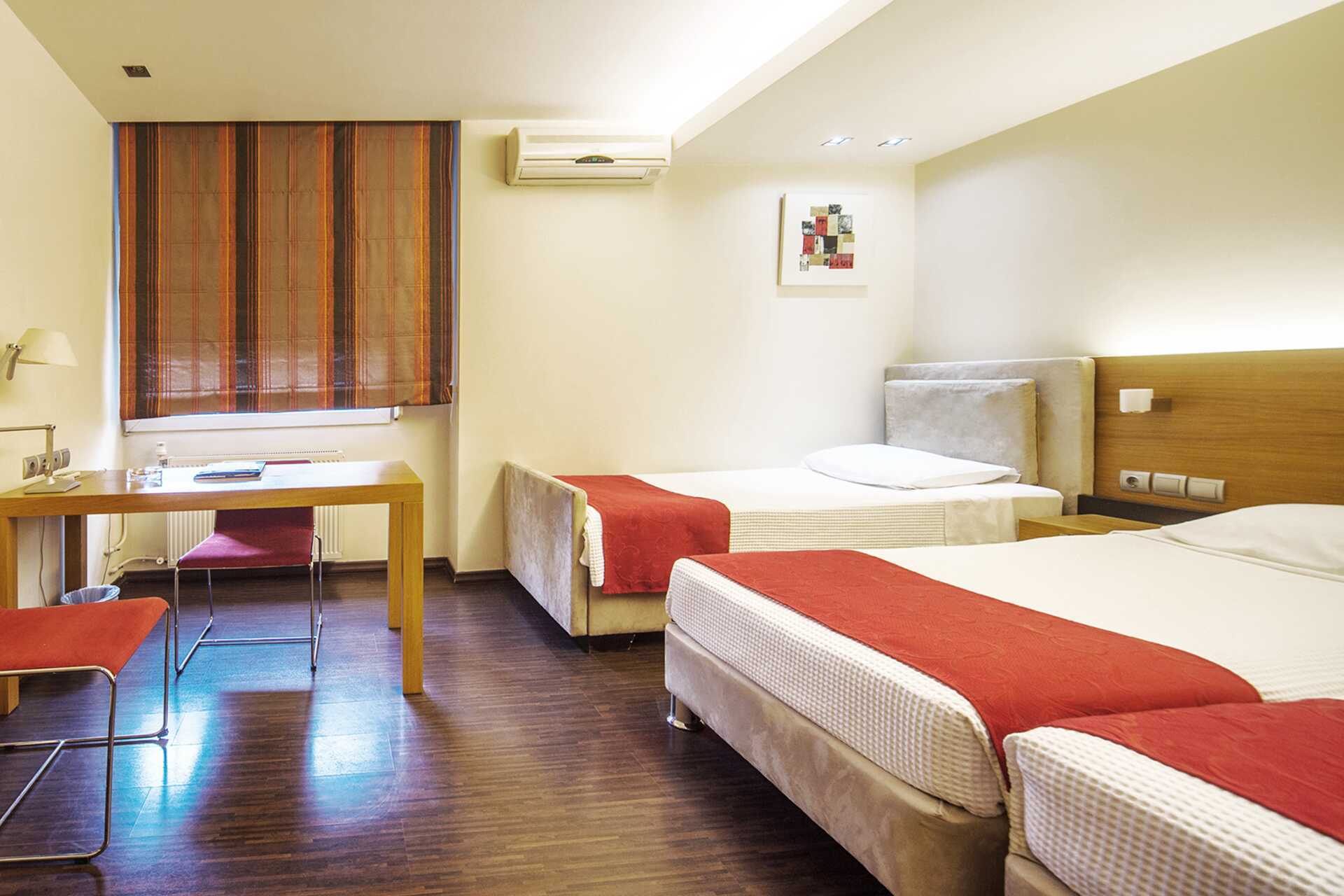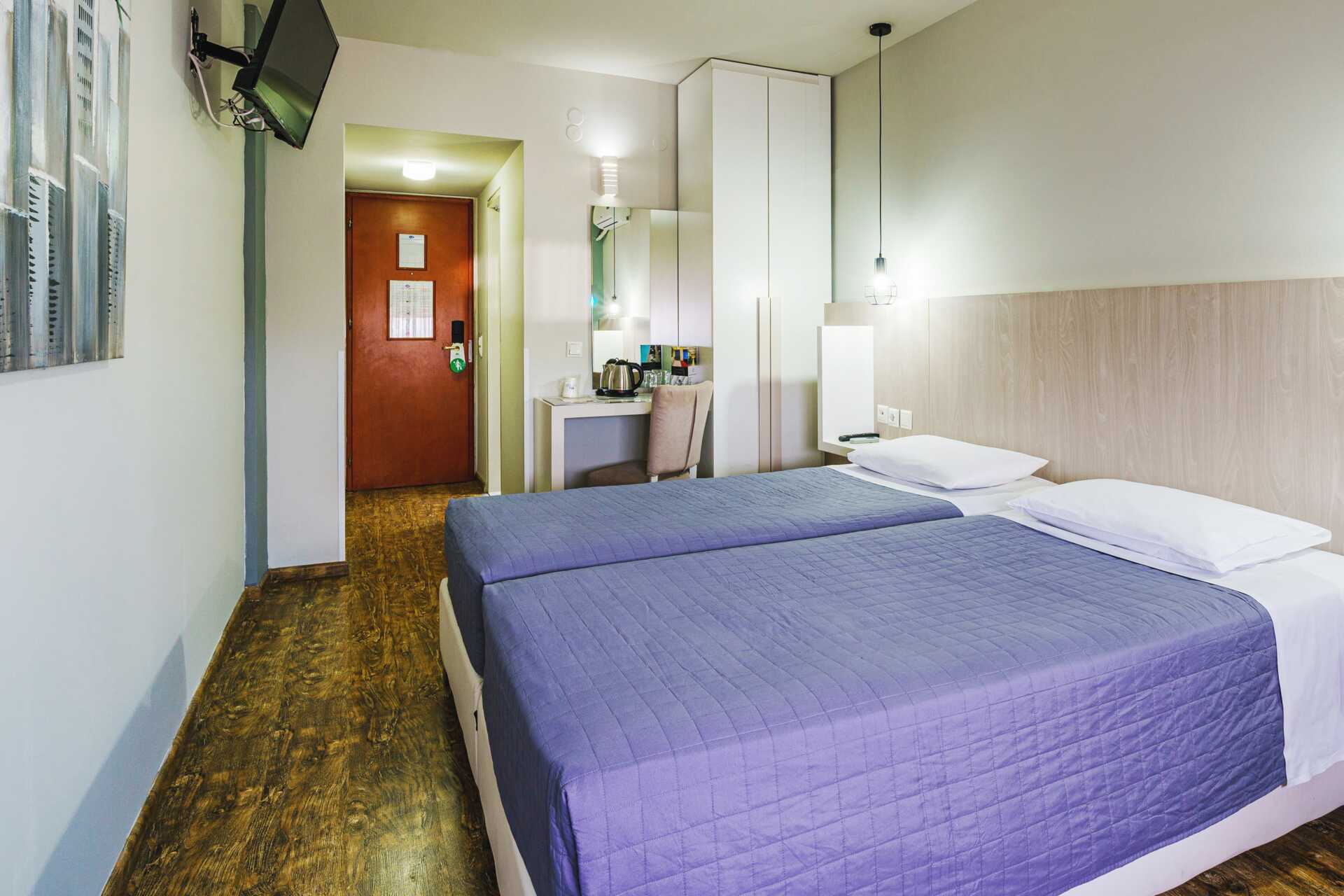 Dobbeltrom, uten uteplass. En dobbeltseng eller to enkeltsenger. Mulig med ekstraseng i sovesofa. Wifi, luftkondisjonering og safe inkludert. Kjøleskap. Vannkoker samt kaffe og te. TV. Tøfler. Hårføner. Badekar eller dusj samt wc. Rengjøring 6 ggr/uke.