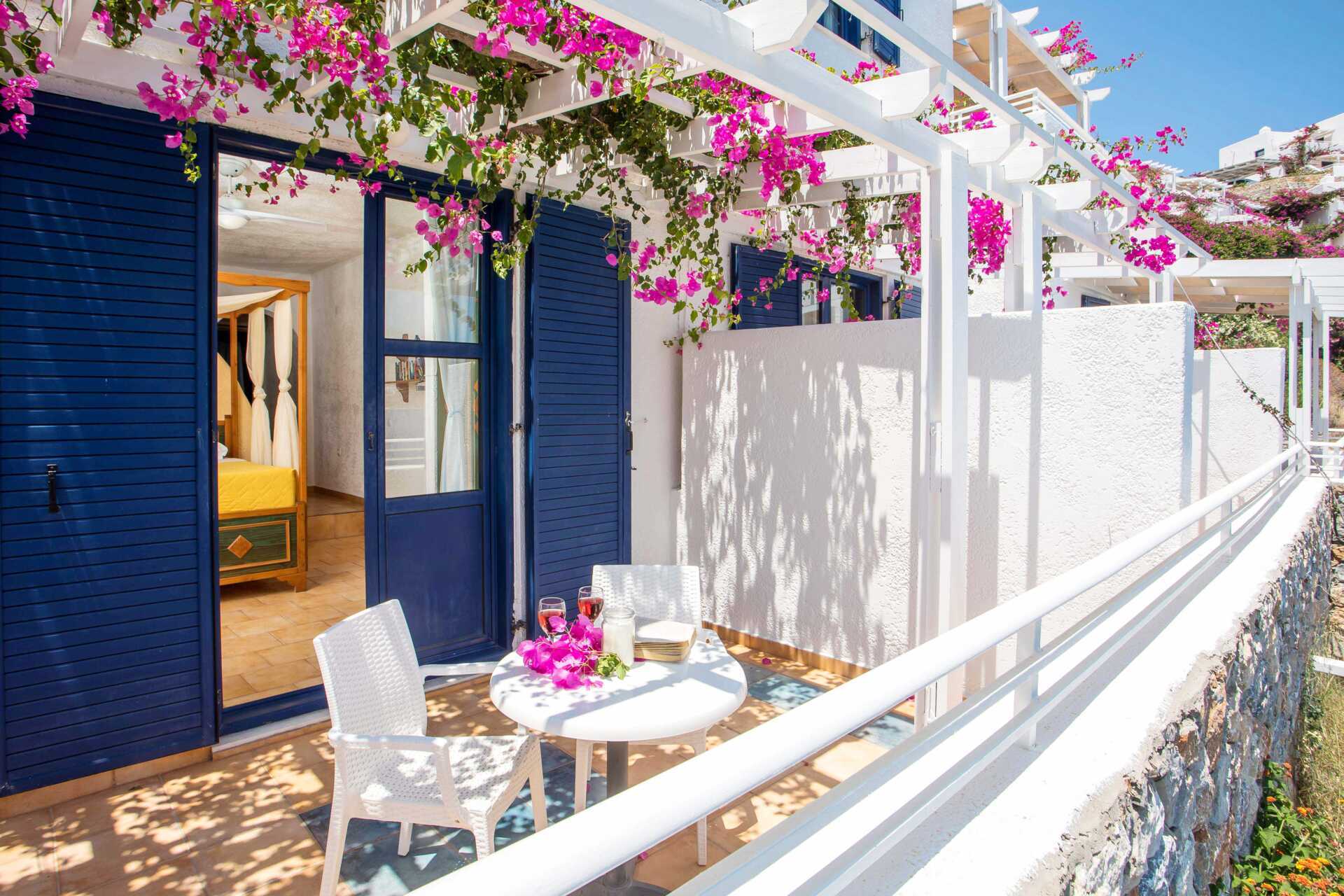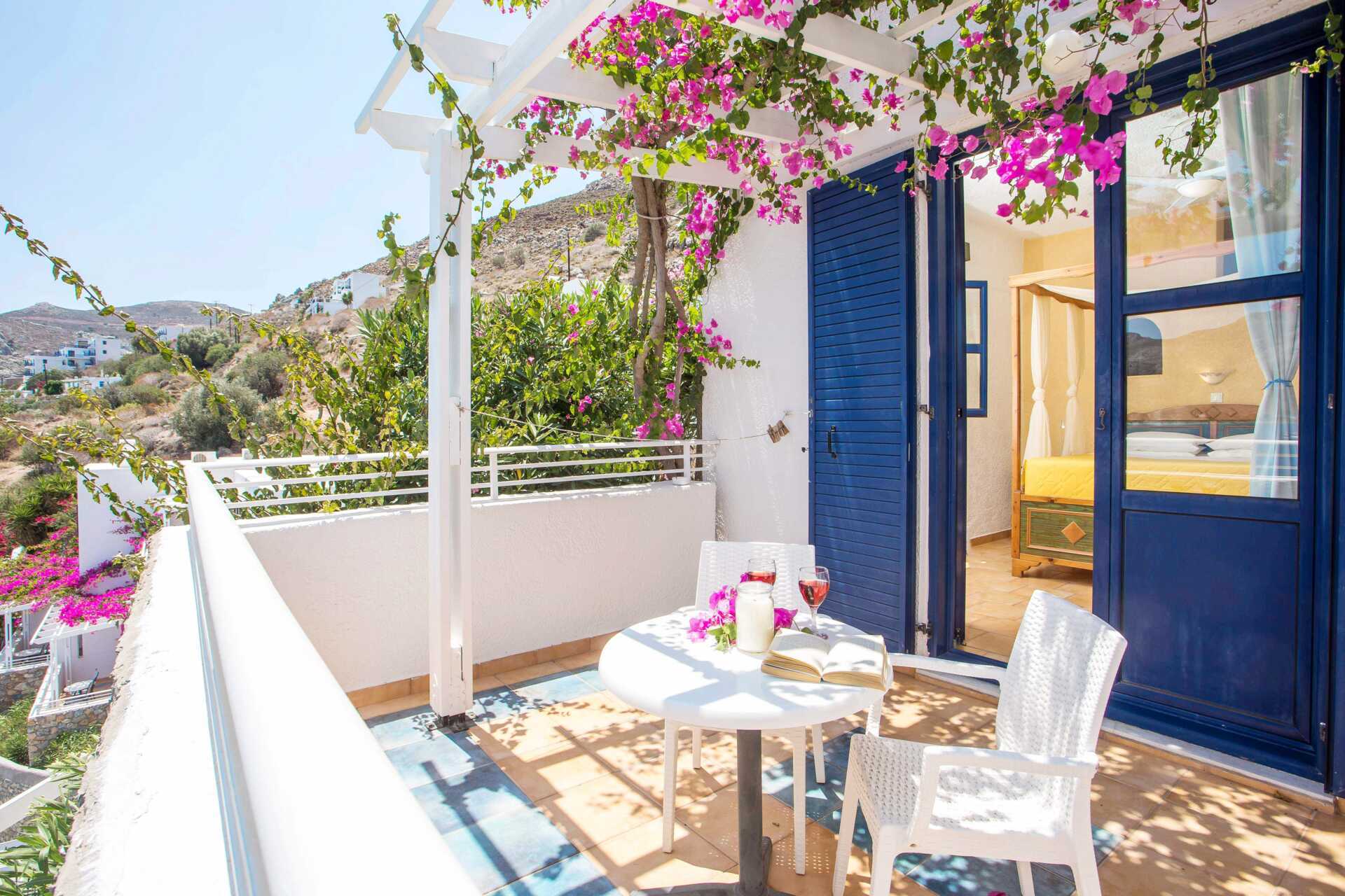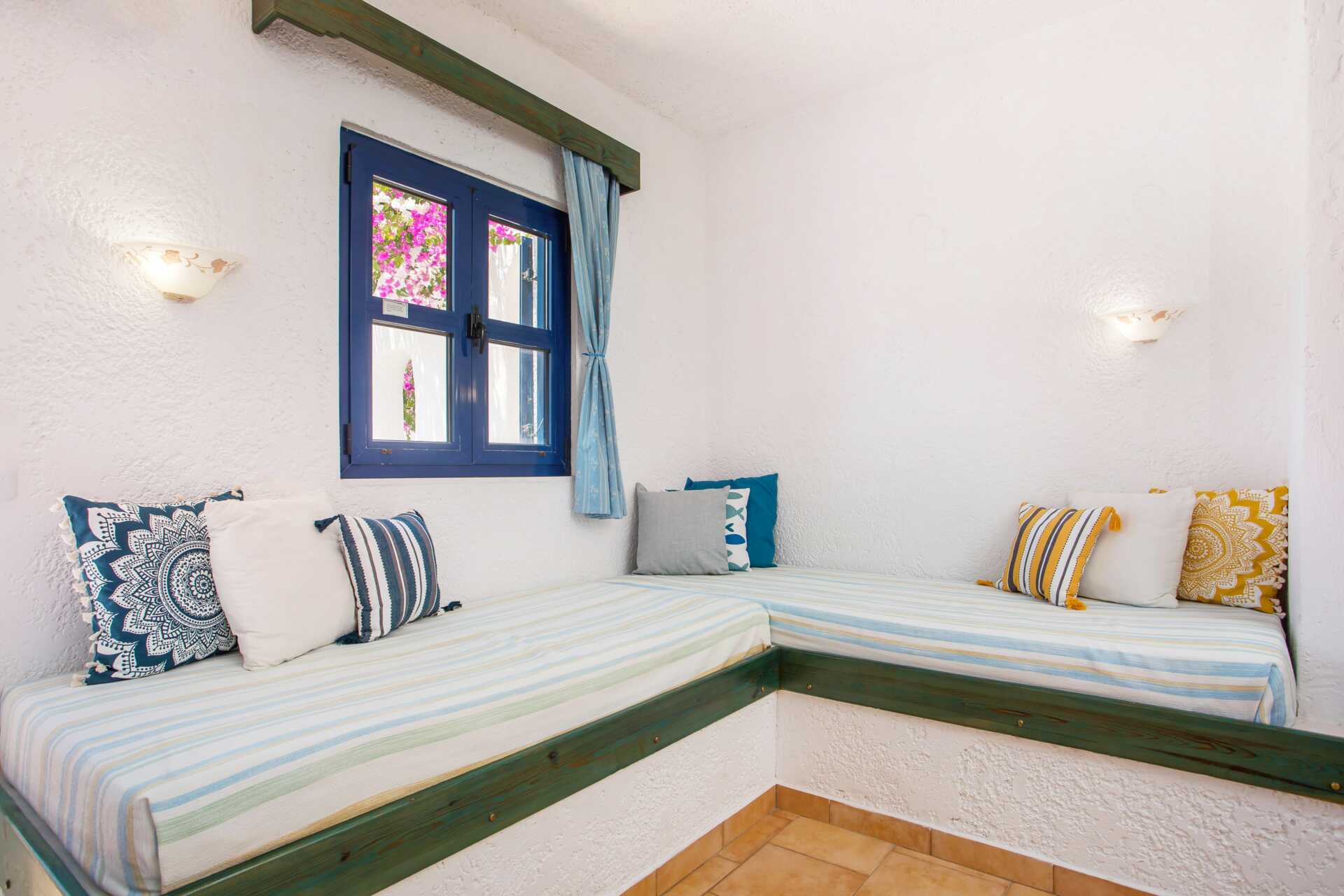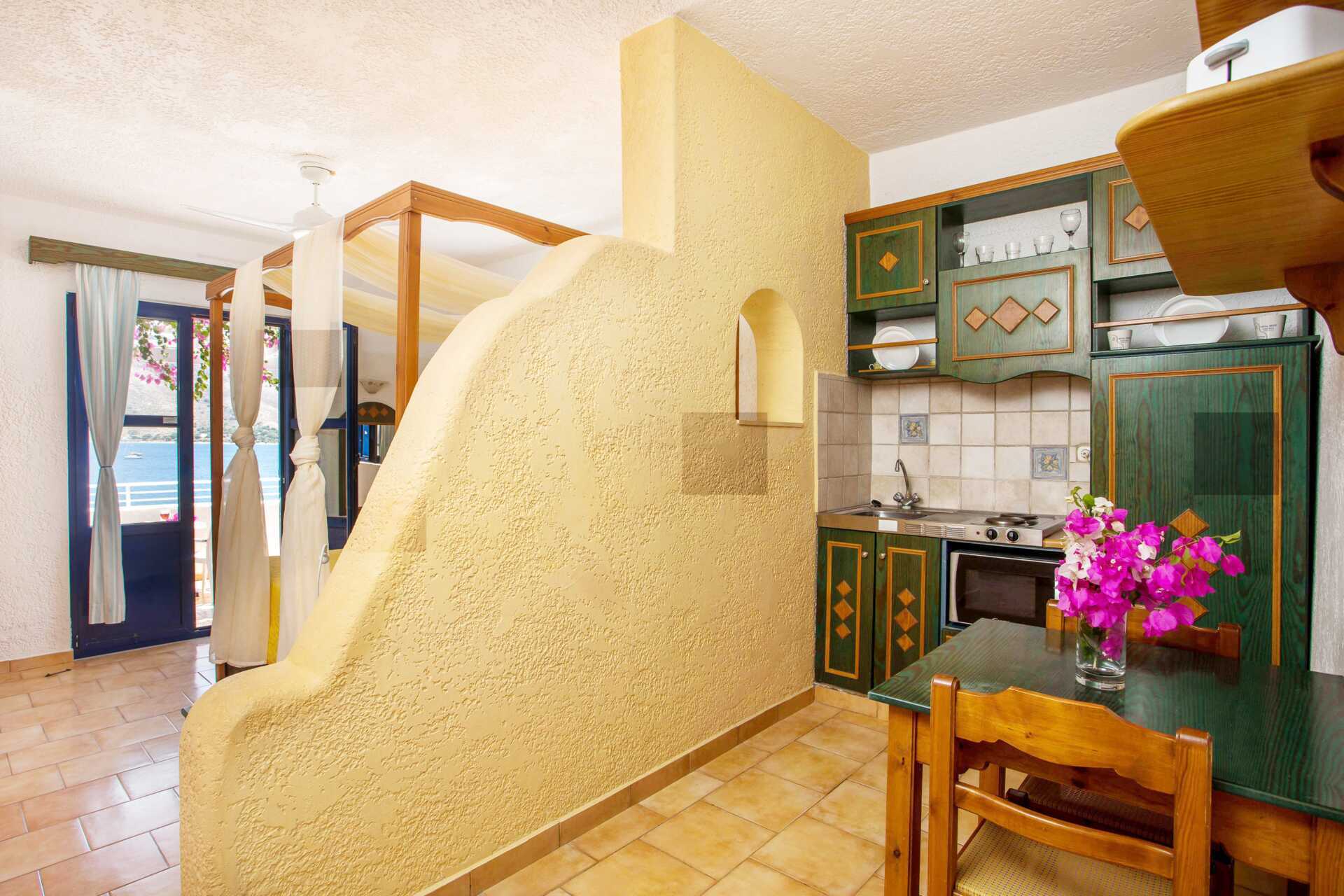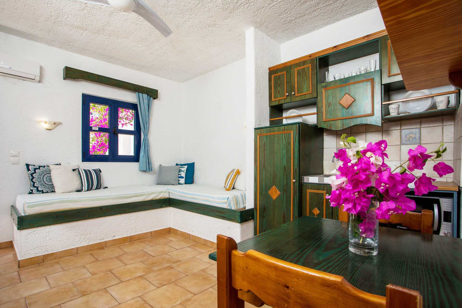 Toromsleilighet med balkong og havutsikt. Et soverom og en stue med minikjøkken. To enkeltsenger eller en dobbeltseng. Mulig med en ekstraseng i sovesofa. Minikjøkken med kjøleskap, mikrobølgeovn, brødrister, kaffepresse, vannkoker og enkel kjøkkenutstyr. Depositum og wifi inkludert. Sentralstyrt luftkondisjonering mot avgift (i noen leiligheter i begge rom, i noen kun i ett av rommene). TV. Hårføner. Dusj og wc. Rengjøring 3 ggr/uke.