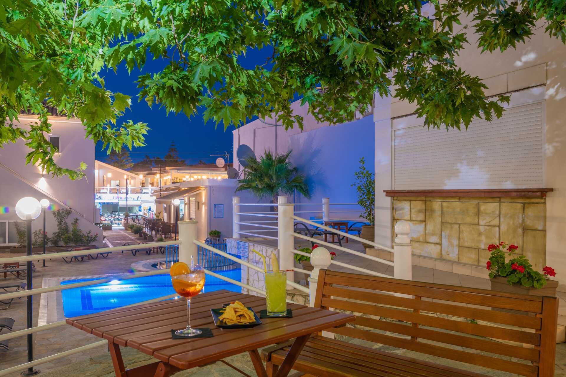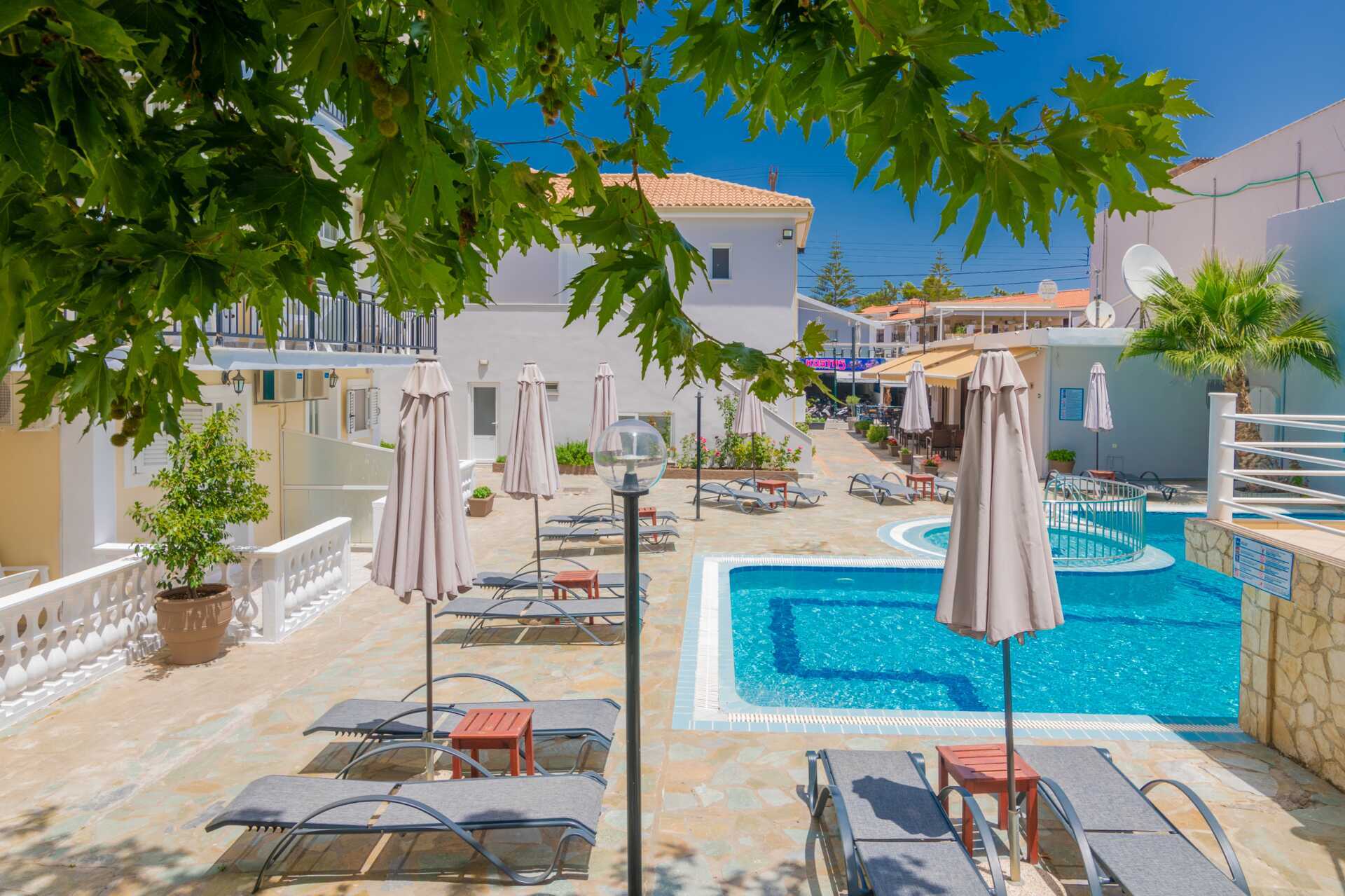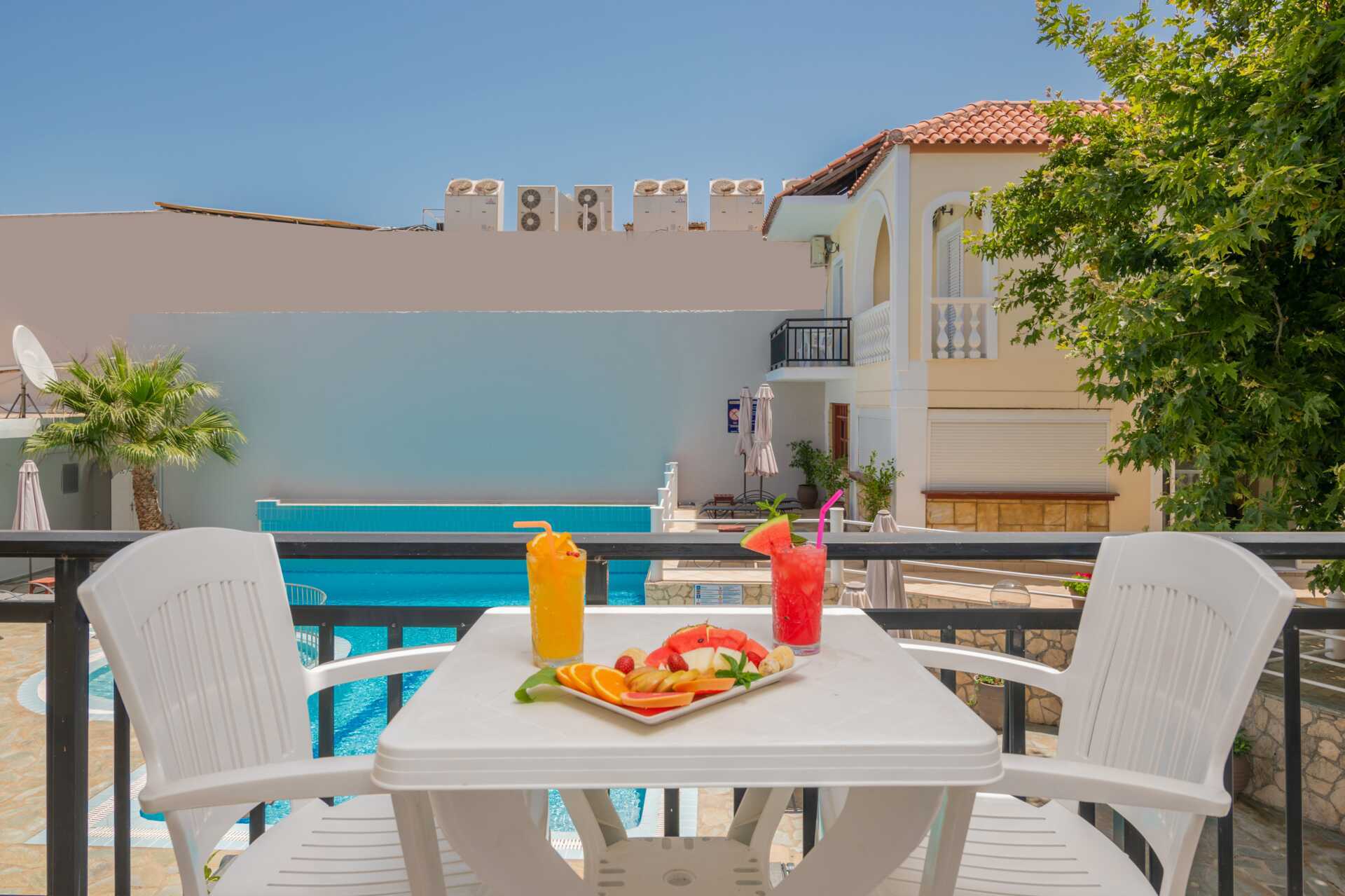 Dobbeltrom med balkong eller markbalkong, noen med utsikt over bassenget. To enkeltsenger. Mulig med ekstraseng i enkeltseng. Wifi og safe inkludert. Luftkondisjonering mot avgift. Kjøleskap. Dusj og wc. Rengjøring 7 ggr/uke.