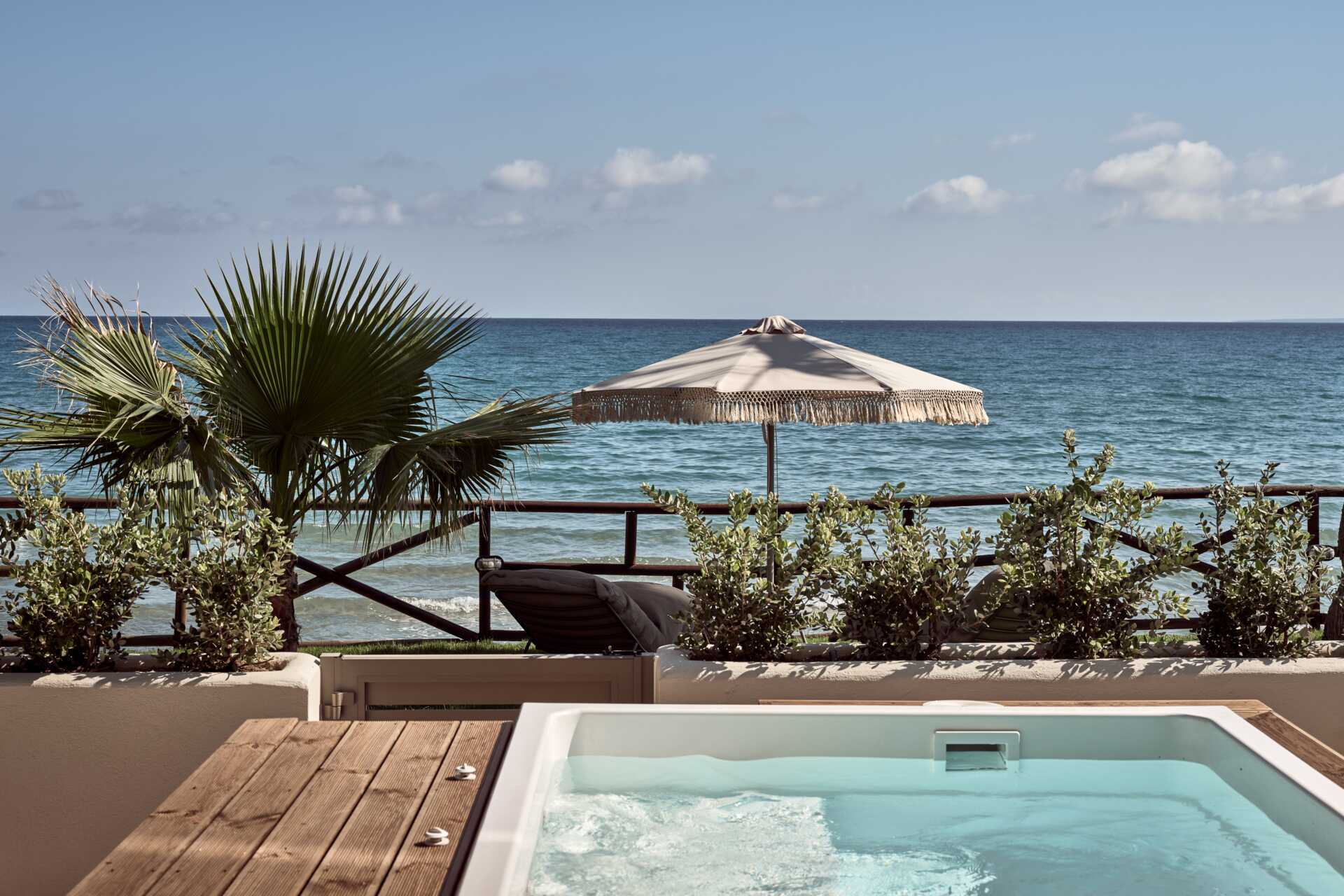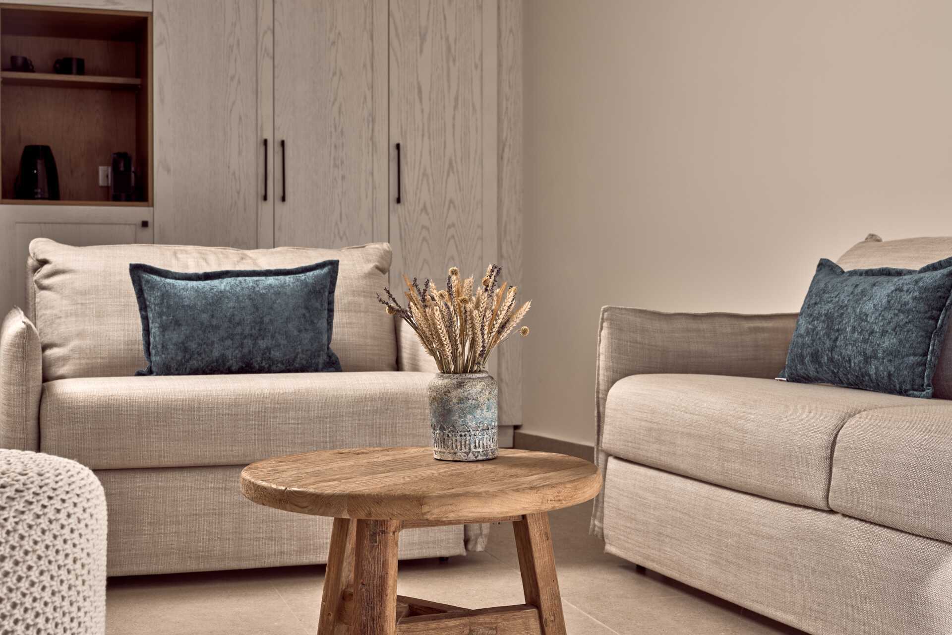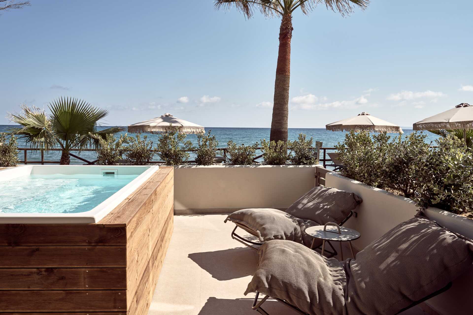Juniorsuite deluxe med jacuzzi og to komfortable lenestoler og en sofa på markterrasse. Soverom med dobbeltseng og stue med sovesofa og oppredbar lenestol. Wifi, luftkondisjonering og safe inkludert. Kjøleskap. Vannkoker samt kaffe og te. Nespresso kaffemaskin. TV. Tøfler. Hårføner. Baderom med dusj og wc. Rengjøring 7 ggr/uke.
