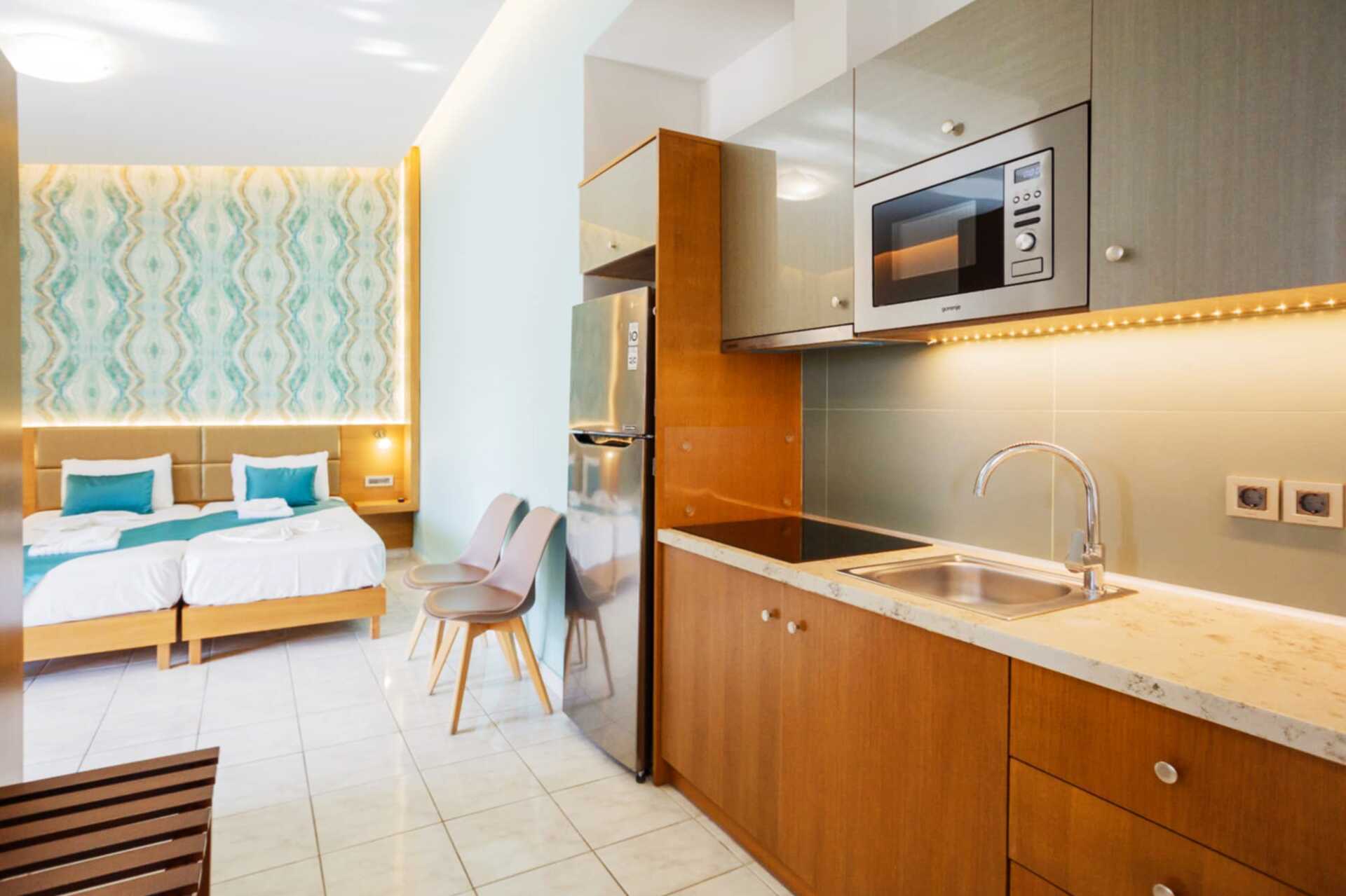 Ettromsleilighet med balkong eller markbalkong, noen uteplasser har bassengutsikt. Soverom kombinert med minikjøkken. To enkeltsenger. Mulighet med ekstraseng i sovesofa. Minikjøkken med mikrobølgeovn, vannkoker, kjøleskap, brødrister og enkelt kjøkkenutstyr. Wifi, safe og luftkondisjonering inkludert. Luftkondisjoneringen er sentralstyrt og slås på ved behov i perioden 12.5-29.9. TV med lokale kanaler. Hårføner. Dusj og wc. Rengjøring 6 ggr/uke.