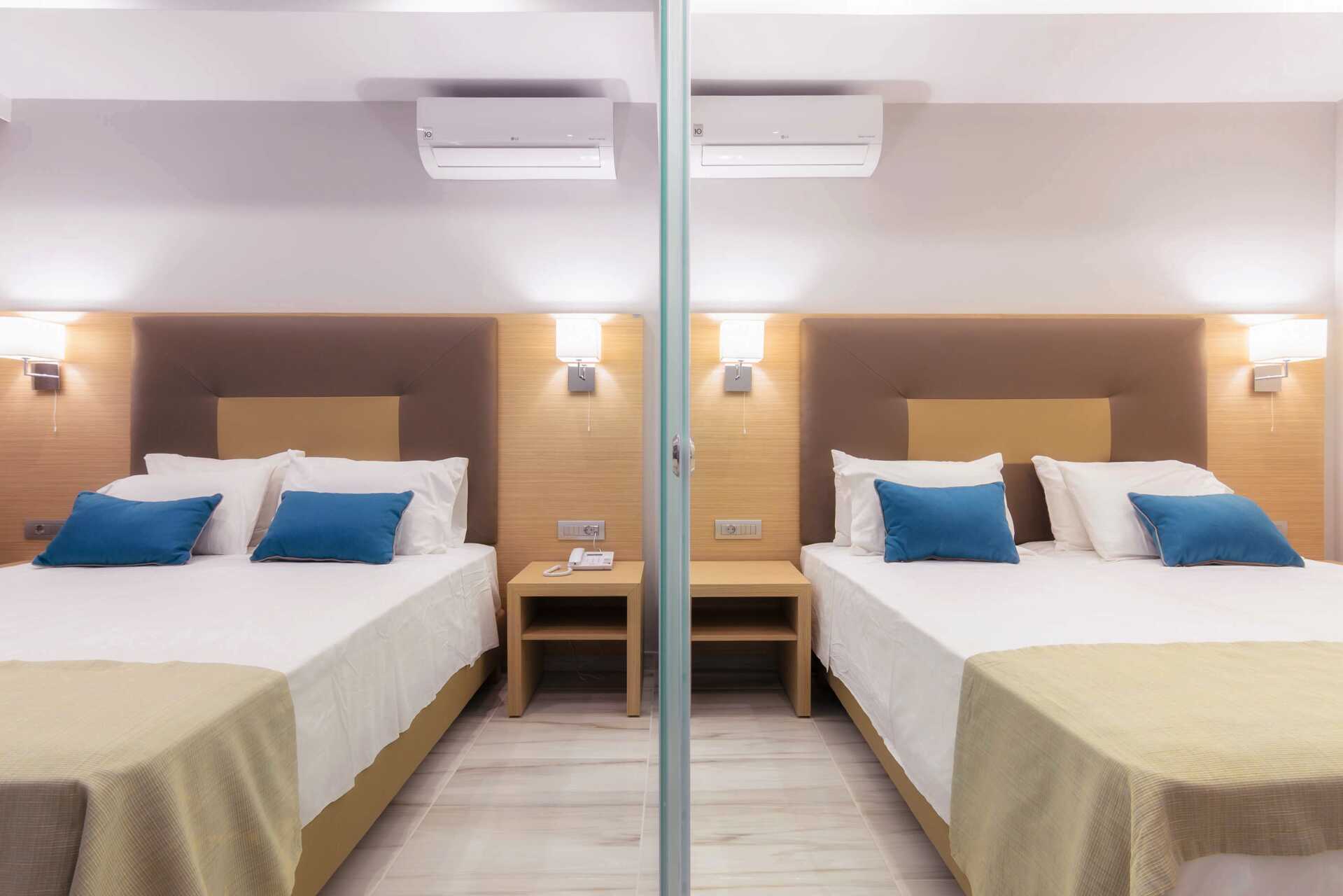 Familierom med 2 ord. senger med balkong eller terrasse. Familierommet består av to soverom med skyvedør mellom. En dobbeltseng og to enkeltsenger. Wifi, luftkondisjonering og safe inkludert. Kjøleskap. TV. Badekåper og tøfler. Hårføner. Baderom med dusj og wc. Rengjøring 7 ggr/uke.