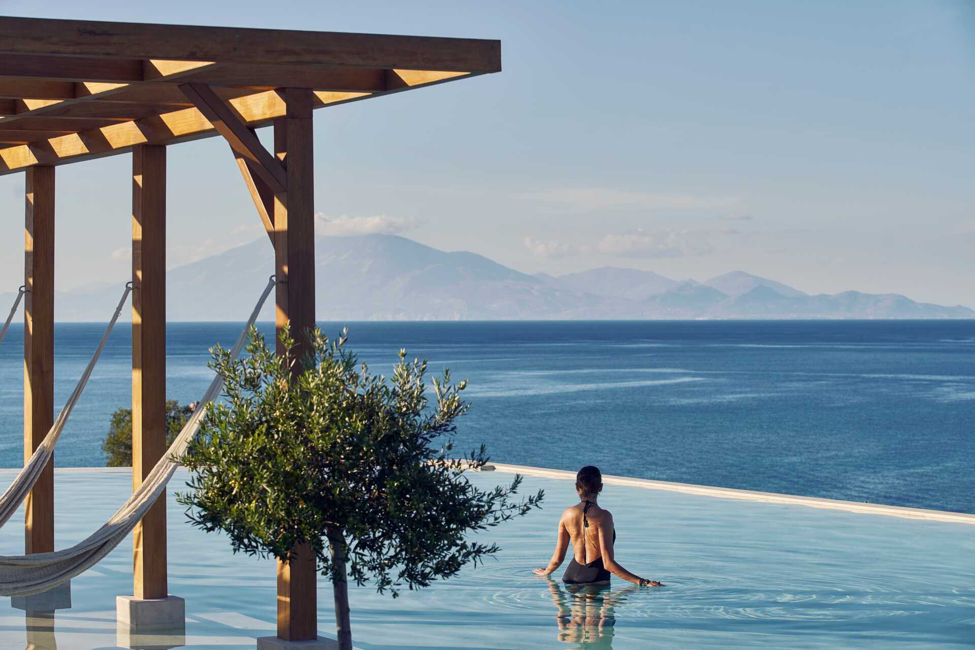Suite med uteplass og eget basseng, noen med havutsikt. På uteplassen er det et basseng på cirka 20 kvm, bord og stoler samt solsenger og parasoll. En dobbeltseng. Mulig med ekstrasenger i sovesofa. Wifi, luftkondisjonering og safe inkludert. Minibar. Vannkoker samt kaffe og te. Bluetooth høyttaler. TV. Badekåper og tøfler Hårføner. Bad med to servanter, badekar, separat dusj og wc. Rengjøring 7 ggr/uke.