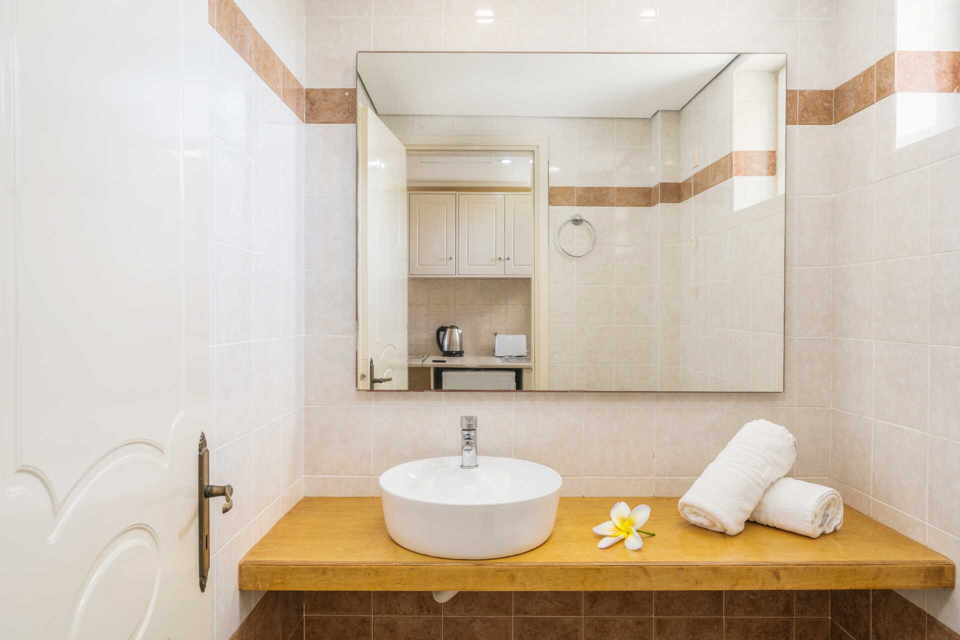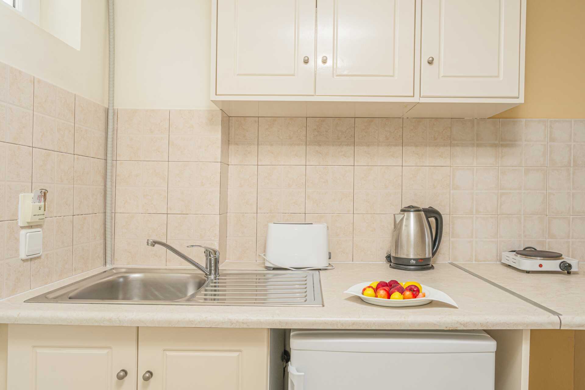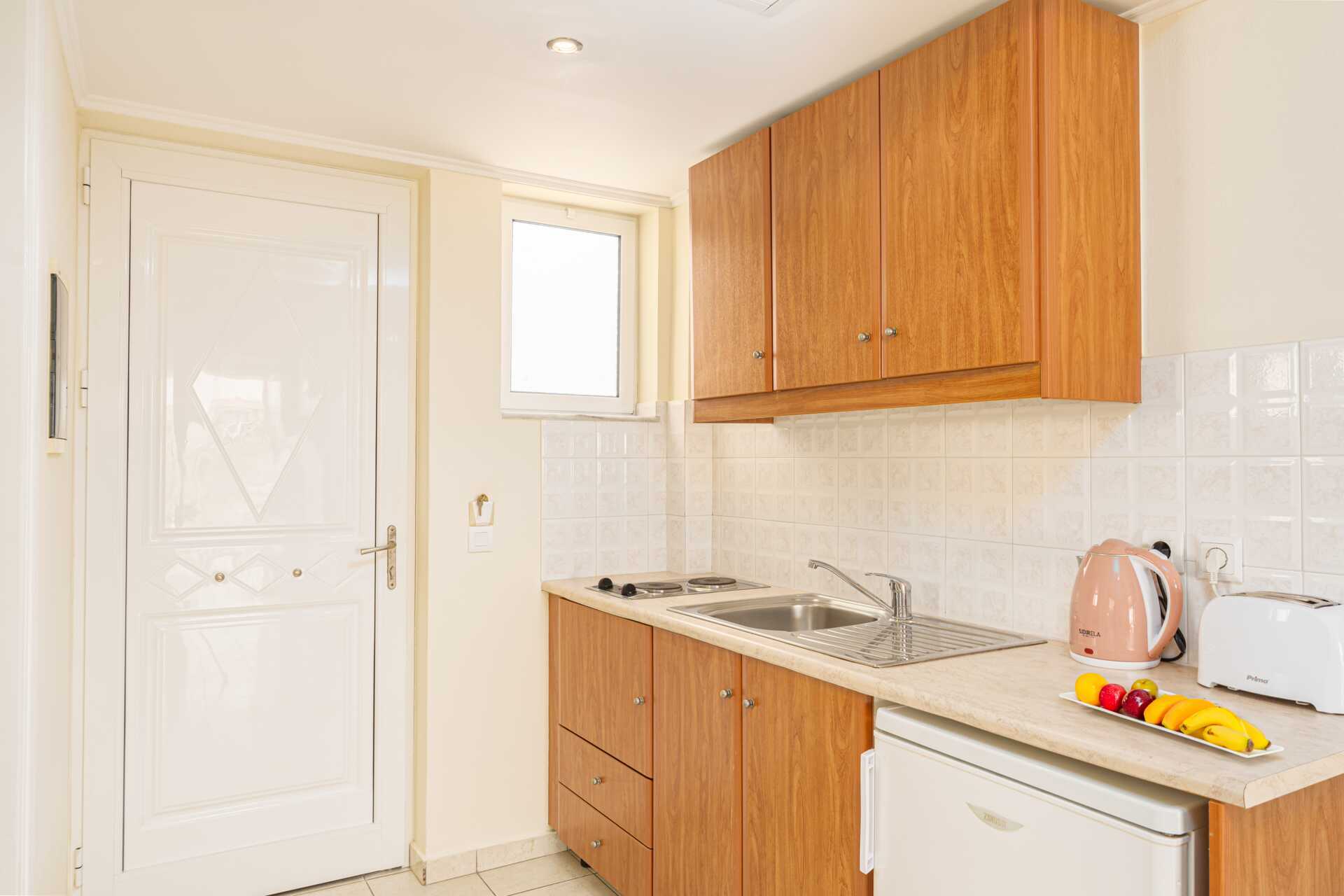 Toromsleilighet med markbalkong. Et soverom og stue med minikjøkken. En dobbeltseng eller to enkeltsenger. Mulig med ekstrasenger i to enkeltsenger. Minikjøkken med kjøleskap, kokeplater, vannkoker, brødrister og enkelt kjøkkenutstyr. Wifi, luftkondisjonering og safe inkludert. Hårføner. Bad med dusj og wc. Rengjøring 6 ggr/uke.