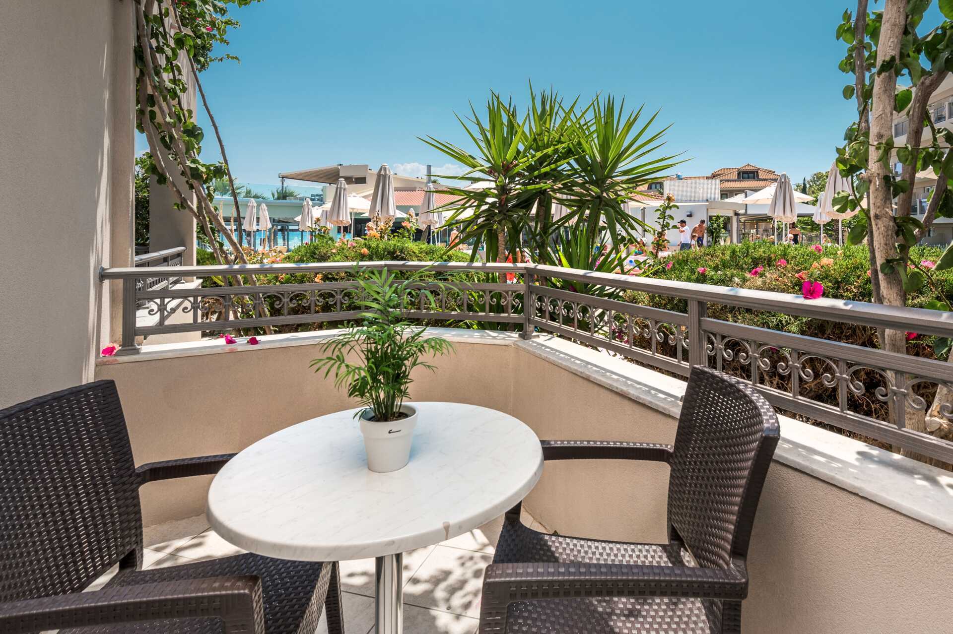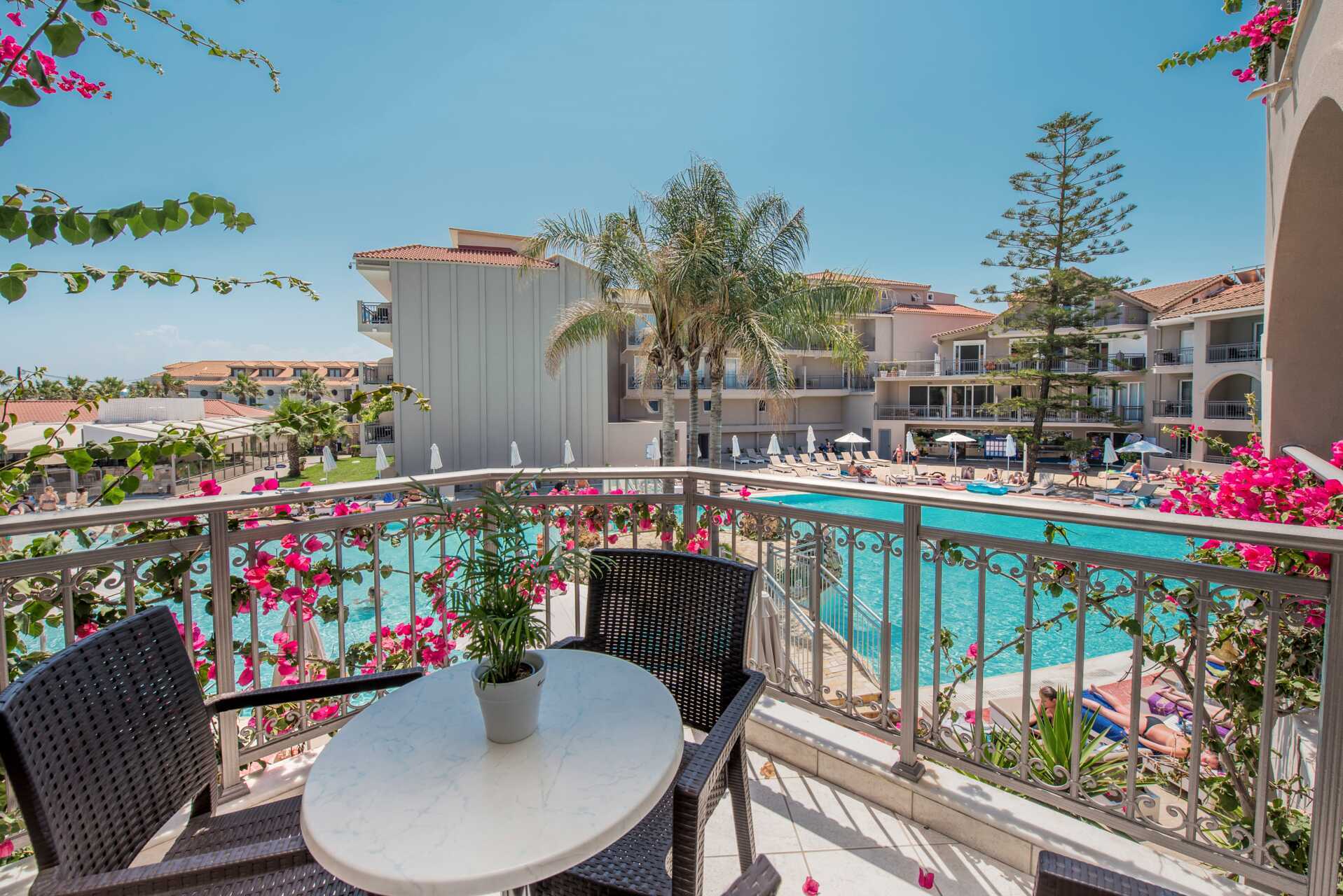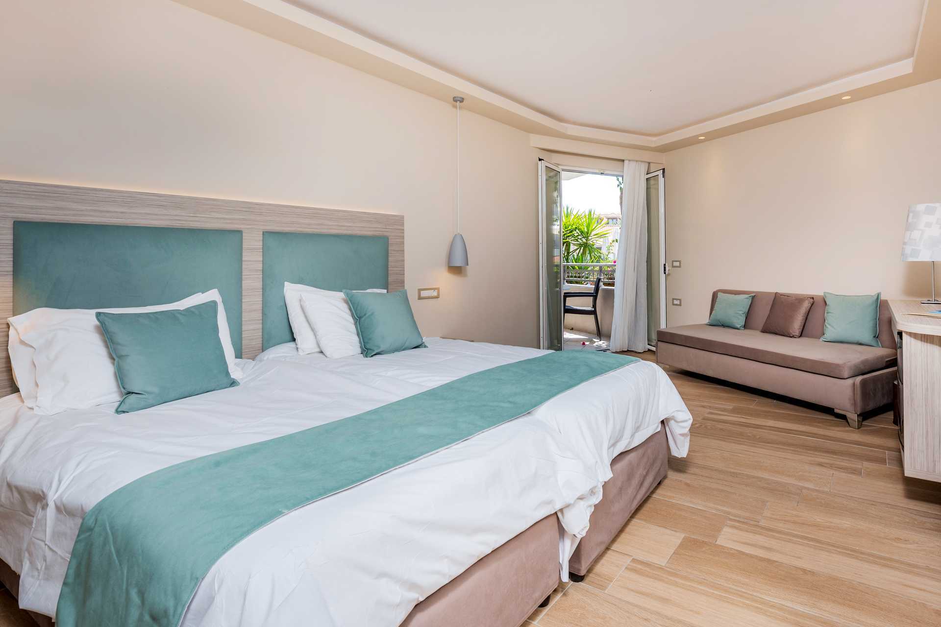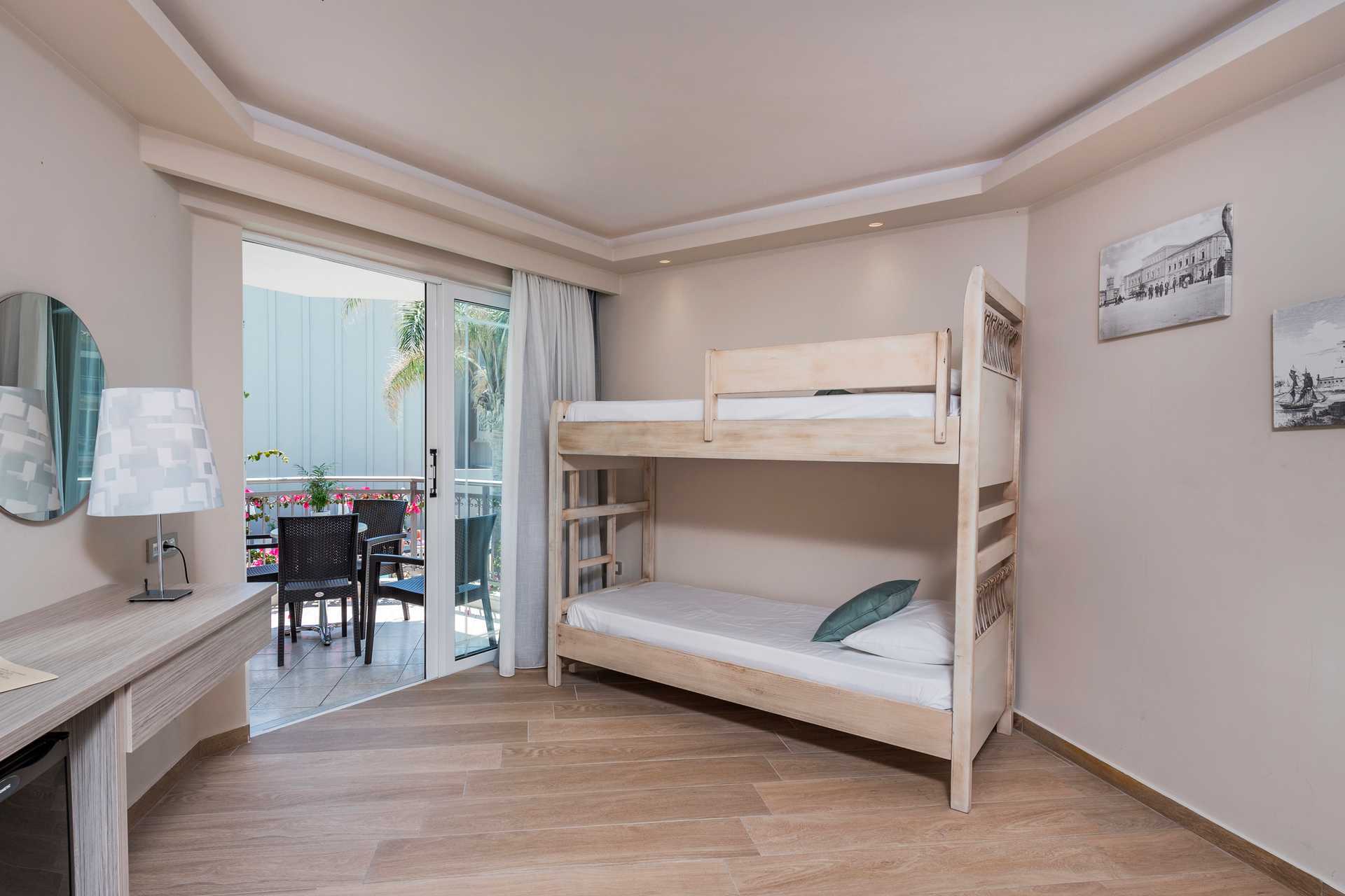Familierom med balkong eller markbalkong og utsikt over bassenget. To enkeltsenger. Mulighet for ekstra senger i en køyeseng som er 190 cm lang. Kjøleskap. Vannkoker samt kaffe og te. Wifi, luftkondisjonering og safe inkludert. TV med internasjonale kanaler. Hårføner. Bad med dusj og wc. Rengjøring 6 ggr/uke.