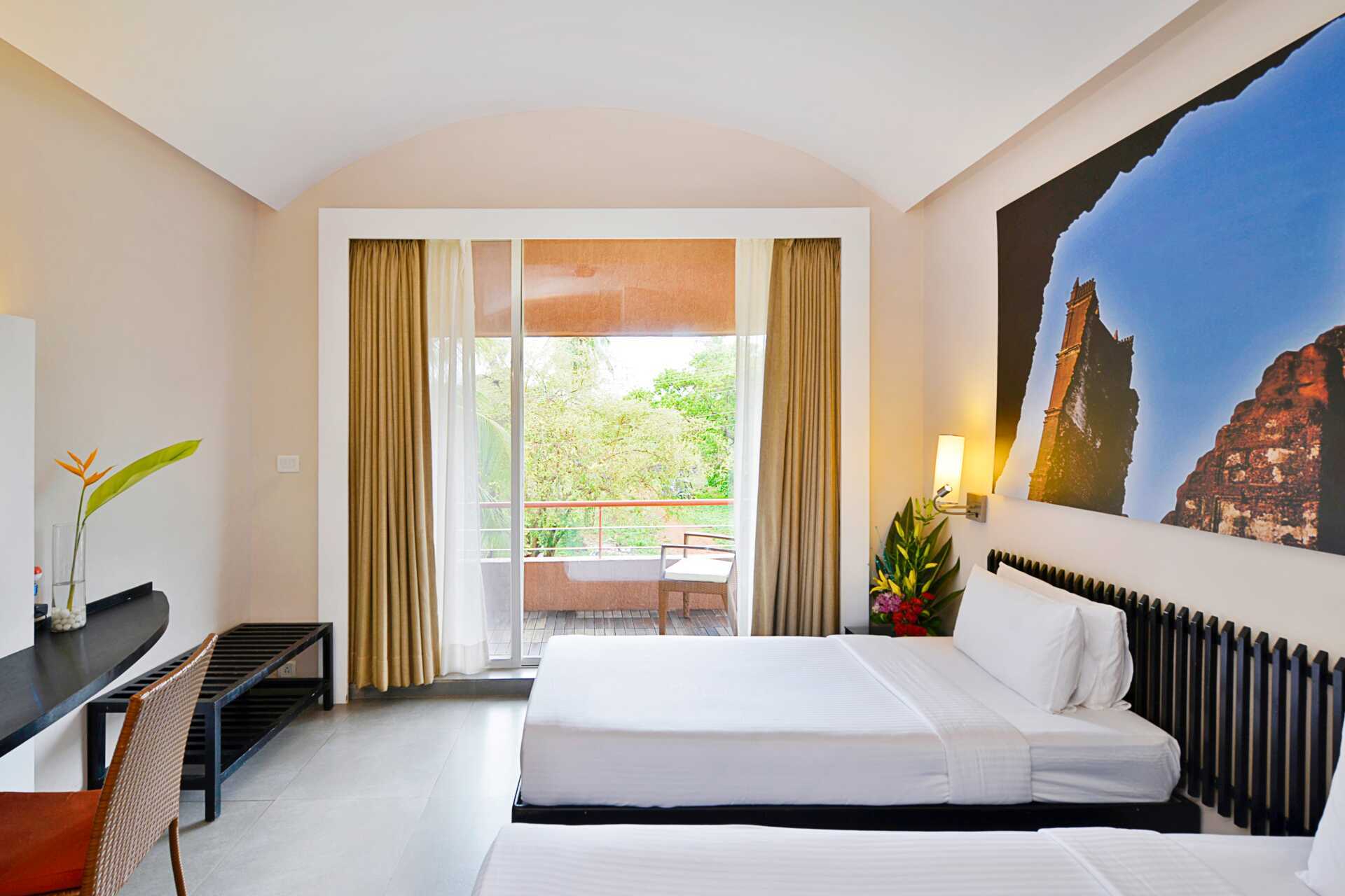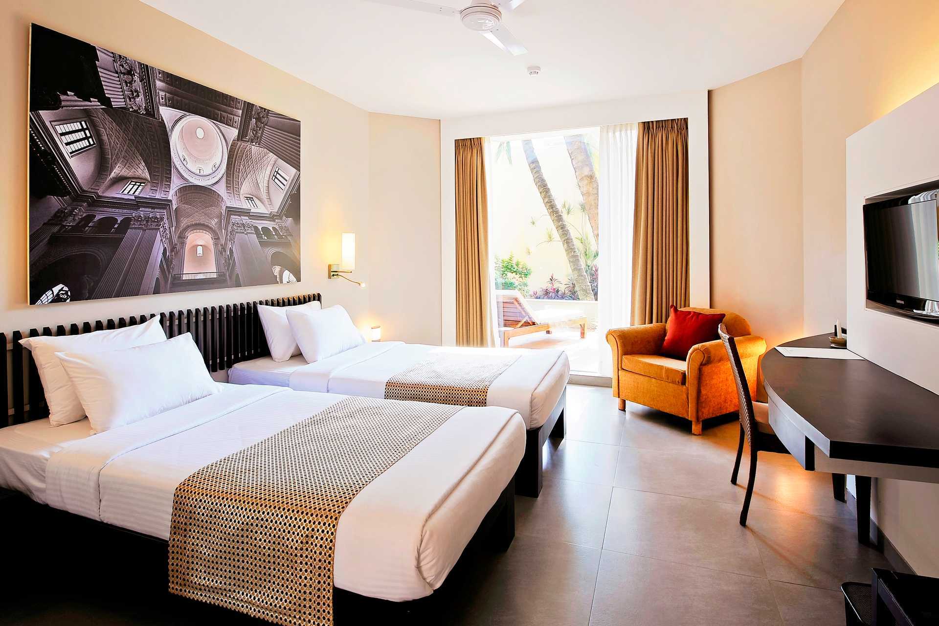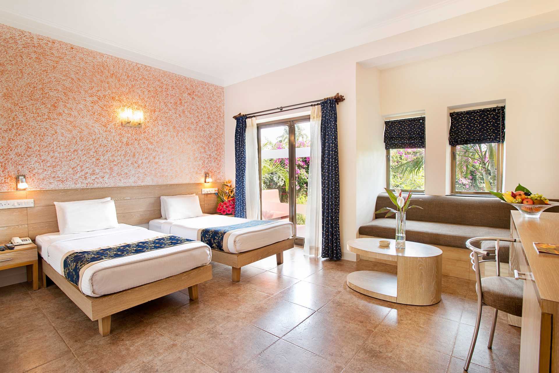 Deluxerom med delt uteplass. En dobbeltseng eller to enkeltsenger. Mulig med ekstraseng i enkeltseng eller i ordinære senger. Sofagruppe. Wifi, luftkondisjonering og safe inkludert. Minibaren inkluderer en flaske vann – andre drikker og snacks mot avgift. Vannkoker. TV. Hårføner. Baderom med dusj og wc. Rengjøring 7 ggr/uke. Barn under 2 år regnes inn i maksantallet i rommet.