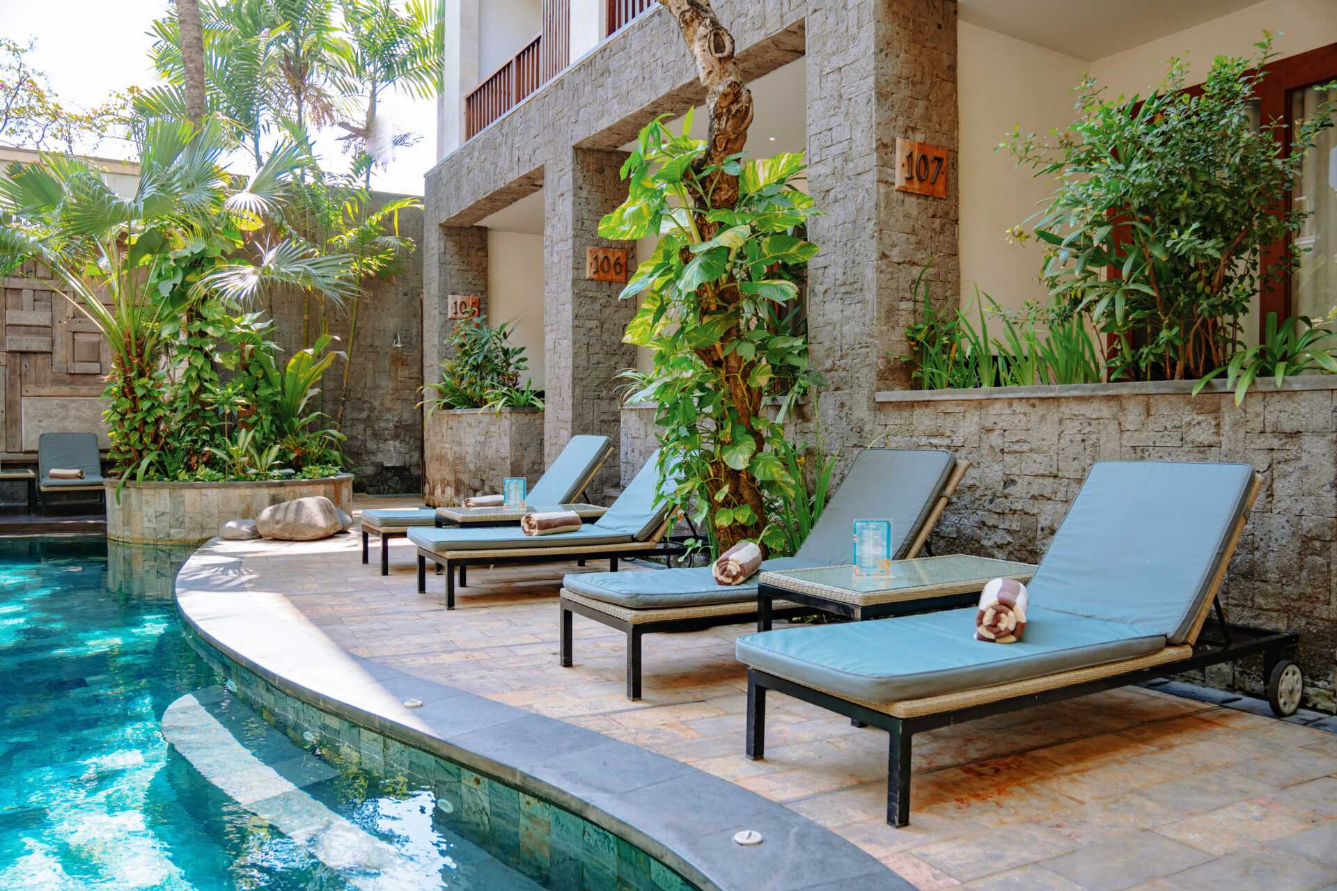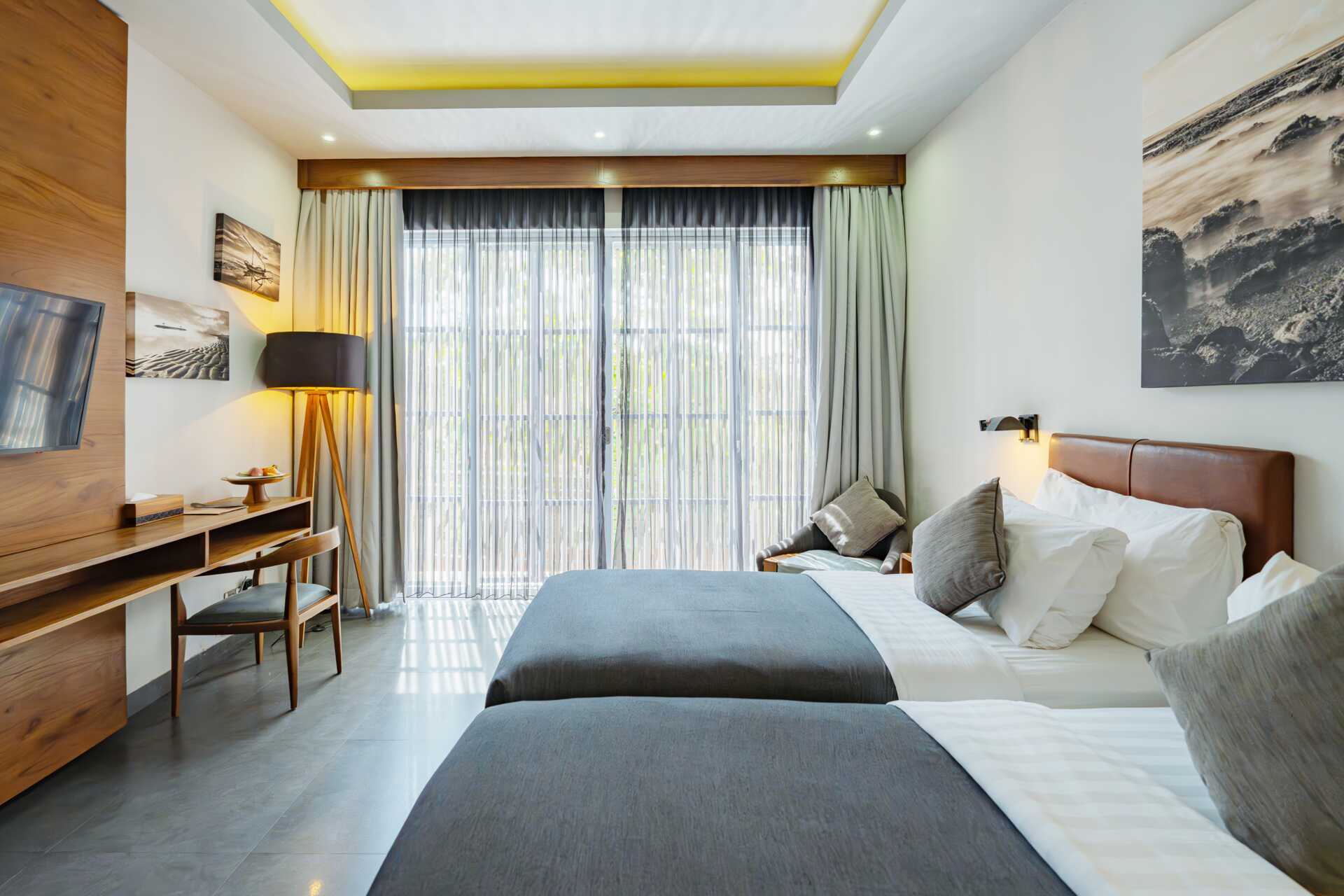 Deluxerom med balkong eller terrasse og bassengutsikt. En dobbeltseng eller to enkeltsenger. Mulig med ekstraseng for en tredje person. Wifi, luftkondisjonering og safe er inkludert. Vannkoker samt kaffe og te. TV. Hårføner. Dusj og wc. Rengjøring 7 ggr/uke.