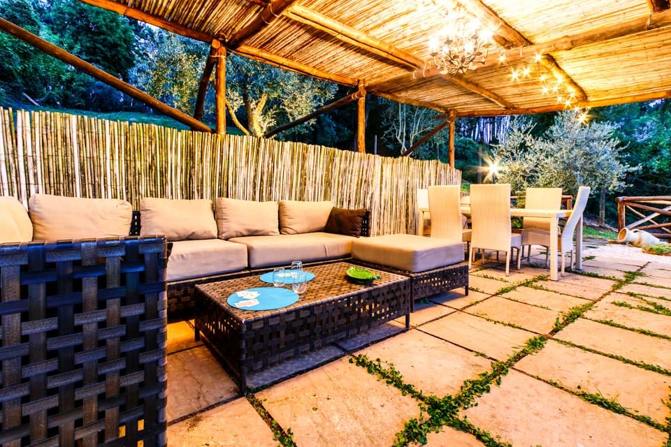 Overbygd terrasse, Komfortabel sittegruppe, Utendørs spiseplass, Åpen terrasse, Solsenger, Hagemøbler, Plen, Mursteinsgrill