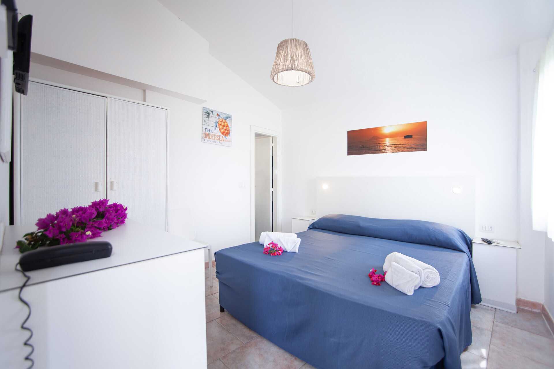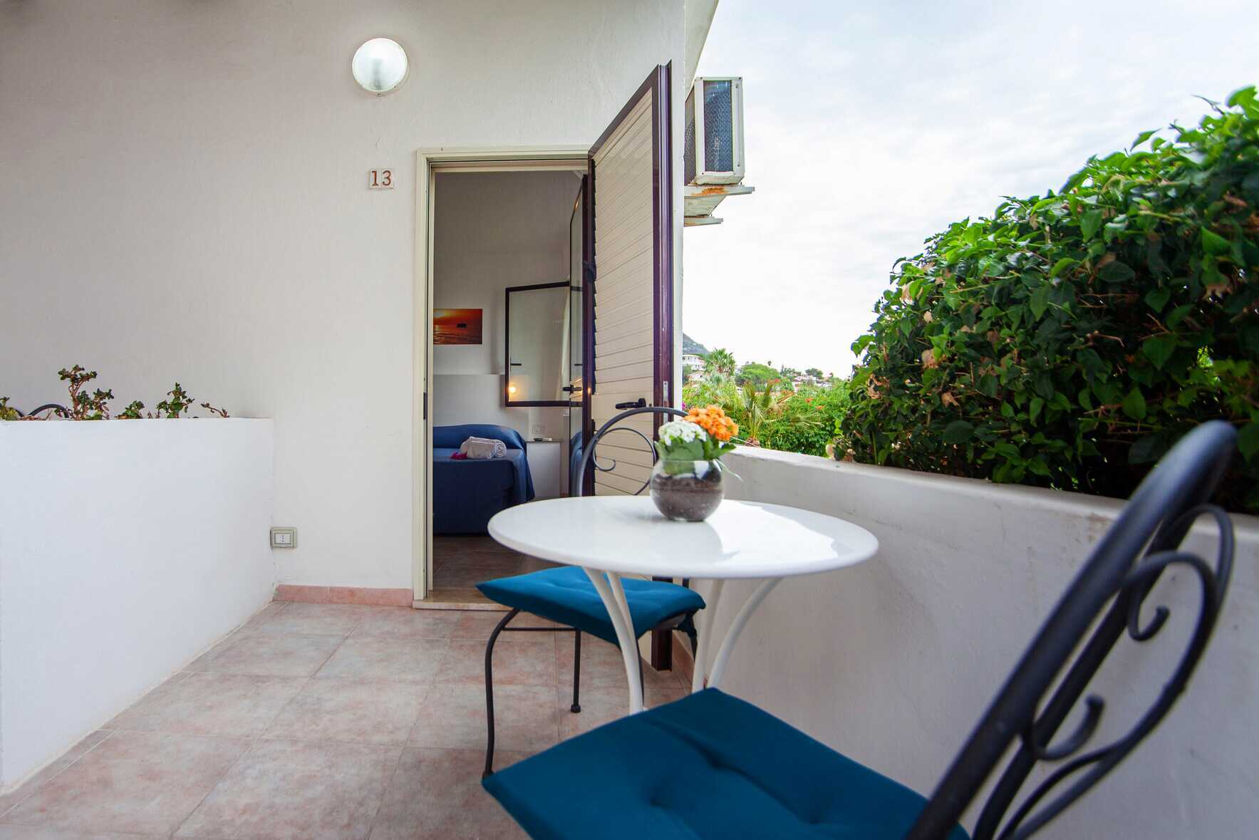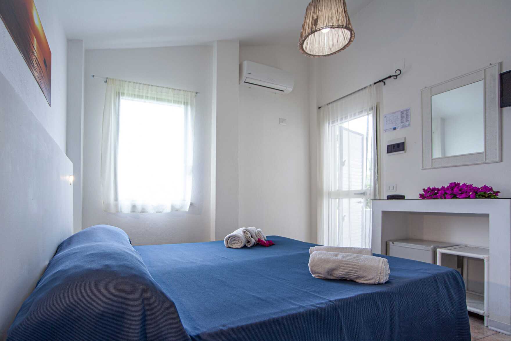 Dobbeltrom med balkong eller terrasse. En dobbeltseng eller to enkeltsenger. Wifi, luftkondisjonering og safe inkludert. Lite kjøleskap. TV med lokale kanaler. Hårføner. Bad med dusj og wc. Rengjøring 7 ggr/uke.