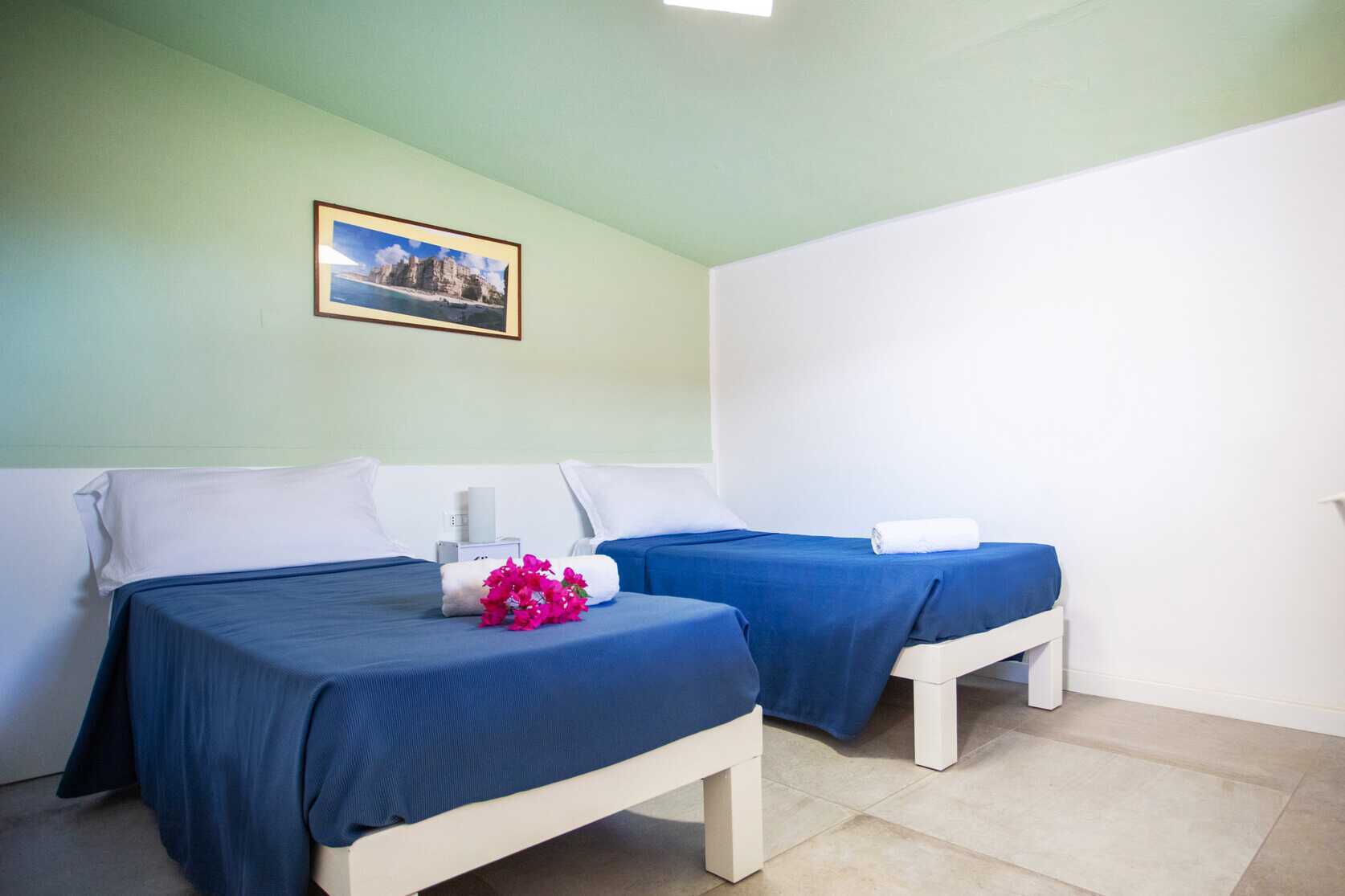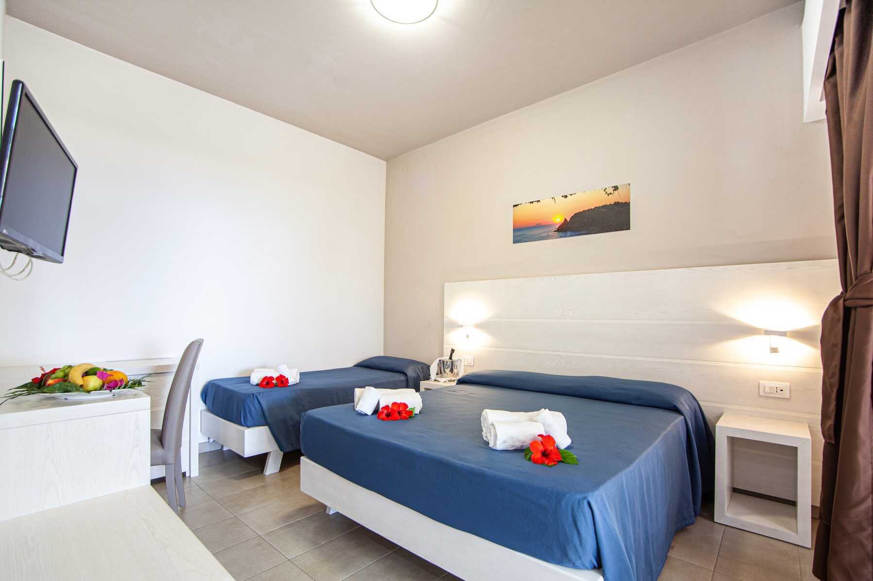 Familierom med balkong eller terrasse. Familierommet består av to soverom. Et soverom med en dobbeltseng og et soverom med to enkeltsenger. Mulig med ekstraseng. Wifi, luftkondisjonering og safe inkludert. Lite kjøleskap. TV med lokale kanaler. Hårføner. Bad med dusj og wc. Rengjøring 7 ggr/uke.