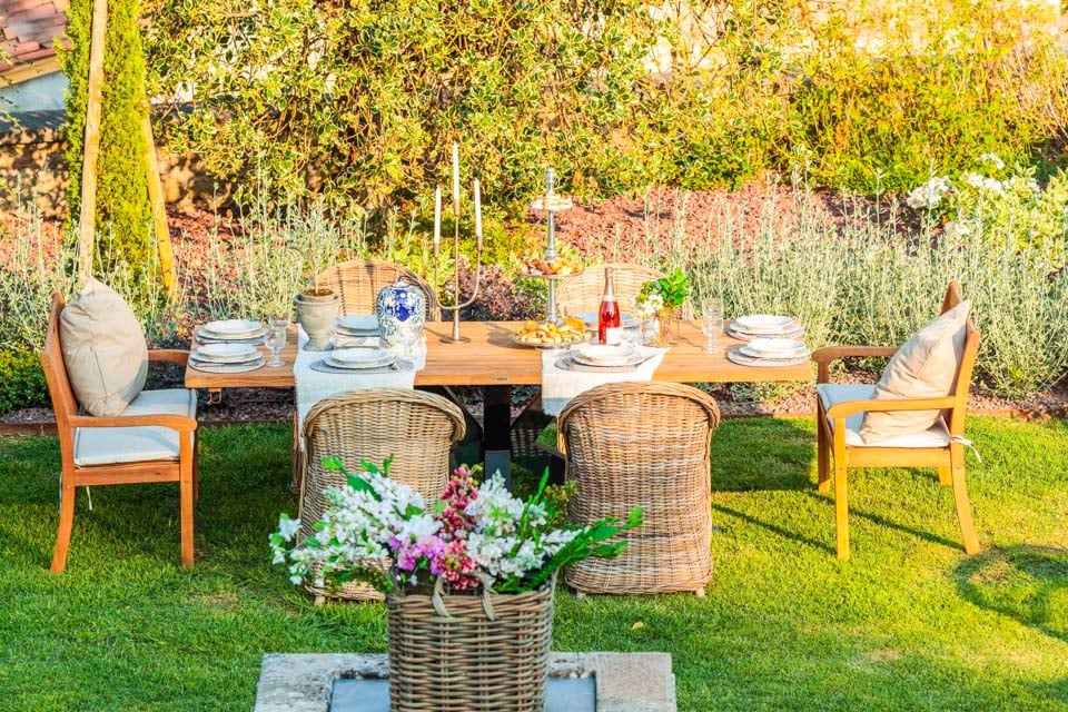 Åpen terrasse, komfortabel sittegruppe, utendørs servering, solsenger, parasoll, utendørs dagseng, moden hage, gassgrill