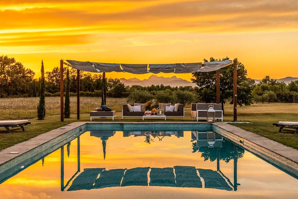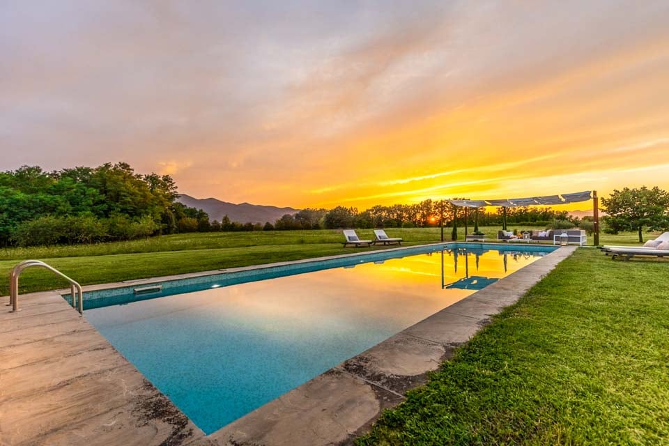 Midt på den frodige plenen som strekker seg rundt ferieparadiset ditt ligger ditt helt eget private basseng, det perfekte stedet å la bekymringene dine bli vasket bort mens du nyter den nydelige solen. Enten du flyter på overflaten på en gummibåt, tar en rolig svømmetur eller bare plasker med dine kjære, vil ettermiddagstimene fly forbi! Få mest mulig ut av solen under hele oppholdet, selv når du ikke tar en dukkert i vannet. Solsengene ved bassengkanten er det ideelle stedet å slappe av under den klare, knallblå himmelen, med en bok i hånden eller med en forfriskende drink. Når du først har fått på deg solbrillene, er det lett å gi slipp på alle hverdagens stress! Med en enorm hage (1,4 hektar!) er det så mye plass til å slappe av og nyte den fantastiske utsikten over de fjerne fjellene, et virkelig ærefryktinngytende syn fra morgen til kveld.