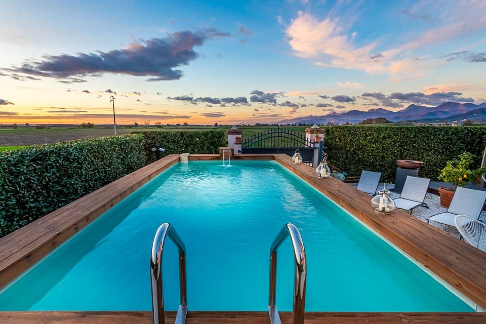 Vær oppmerksom på at bassenget krever både trinn- og stigetilgang. Utvendige trapper fører opp til bassenget med en stige for adkomst.