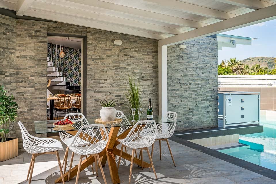 Hjertet i villaen er den åpne stuen og kjøkkenet – et lyst og sosialt rom designet for enkel livsstil. Selv om det ikke er noen stekeovn, finner du en stor koketopp, mikrobølgeovn og kjøleskap med fryser klar for dine kulinariske kreasjoner. Klimaanlegget holder interiøret kjølig, mens velværerommet inviterer deg til å slappe av med boblebad, badstue og et ekstra dusjrom.