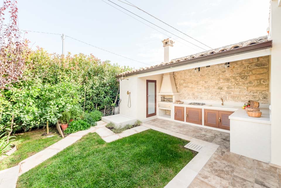 Overbygd terrasse, Murbygd grill, Koketopp, Komfortabel sittegruppe, Utendørs spiseplass, Åpen terrasse, Solsenger, Modne hager