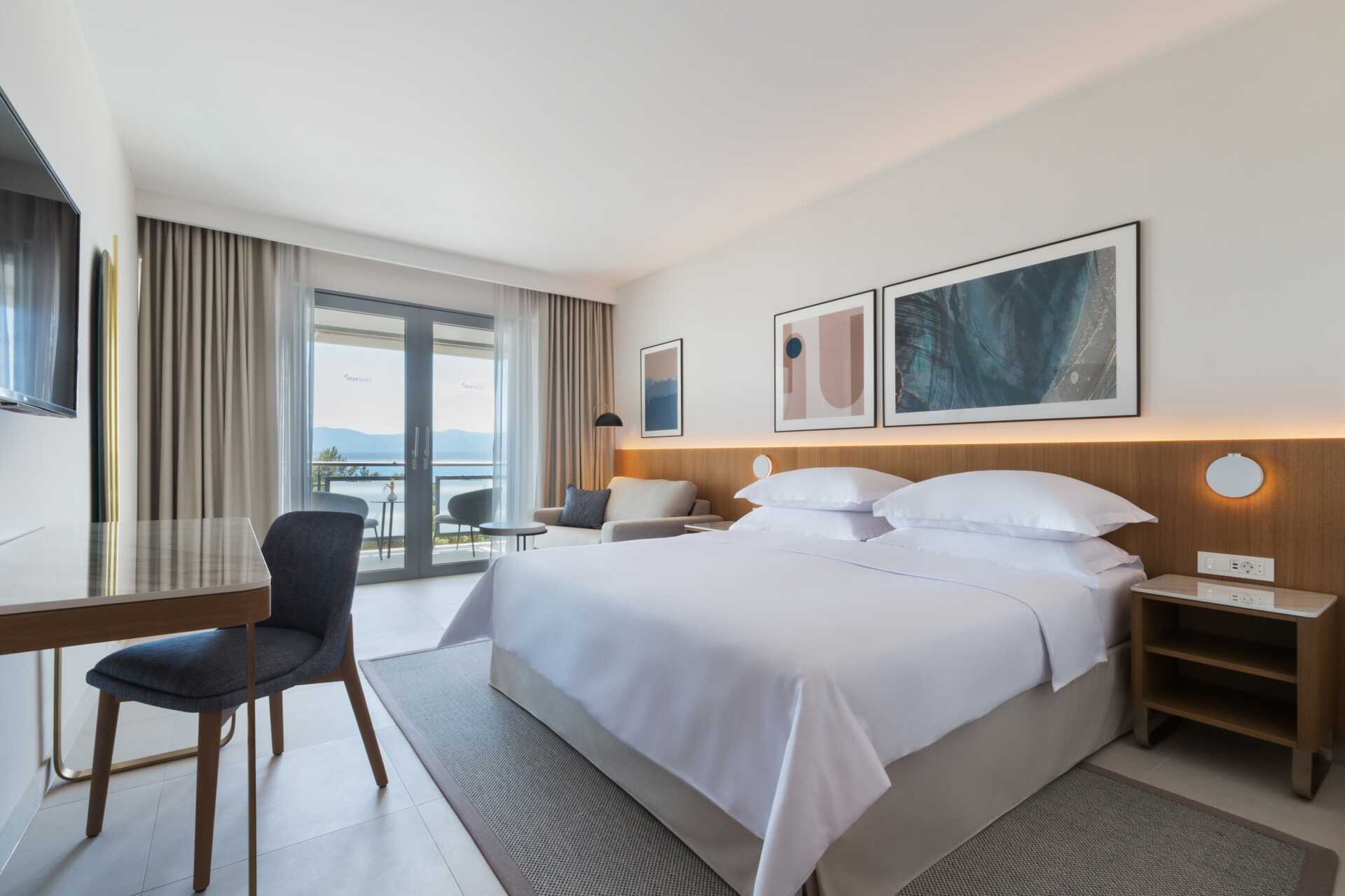 Større dobbeltrom med balkong og havutsikt. En dobbeltseng eller to enkeltsenger. Mulig med ekstraseng i sovesofa. Wifi, luftkondisjonering og safe er inkludert. Minibar. TV. Badekåper. Hårføner. Dusj og wc. Rengjøring 7 ggr/uke.