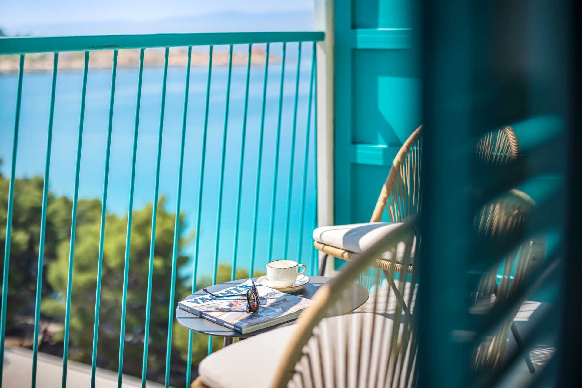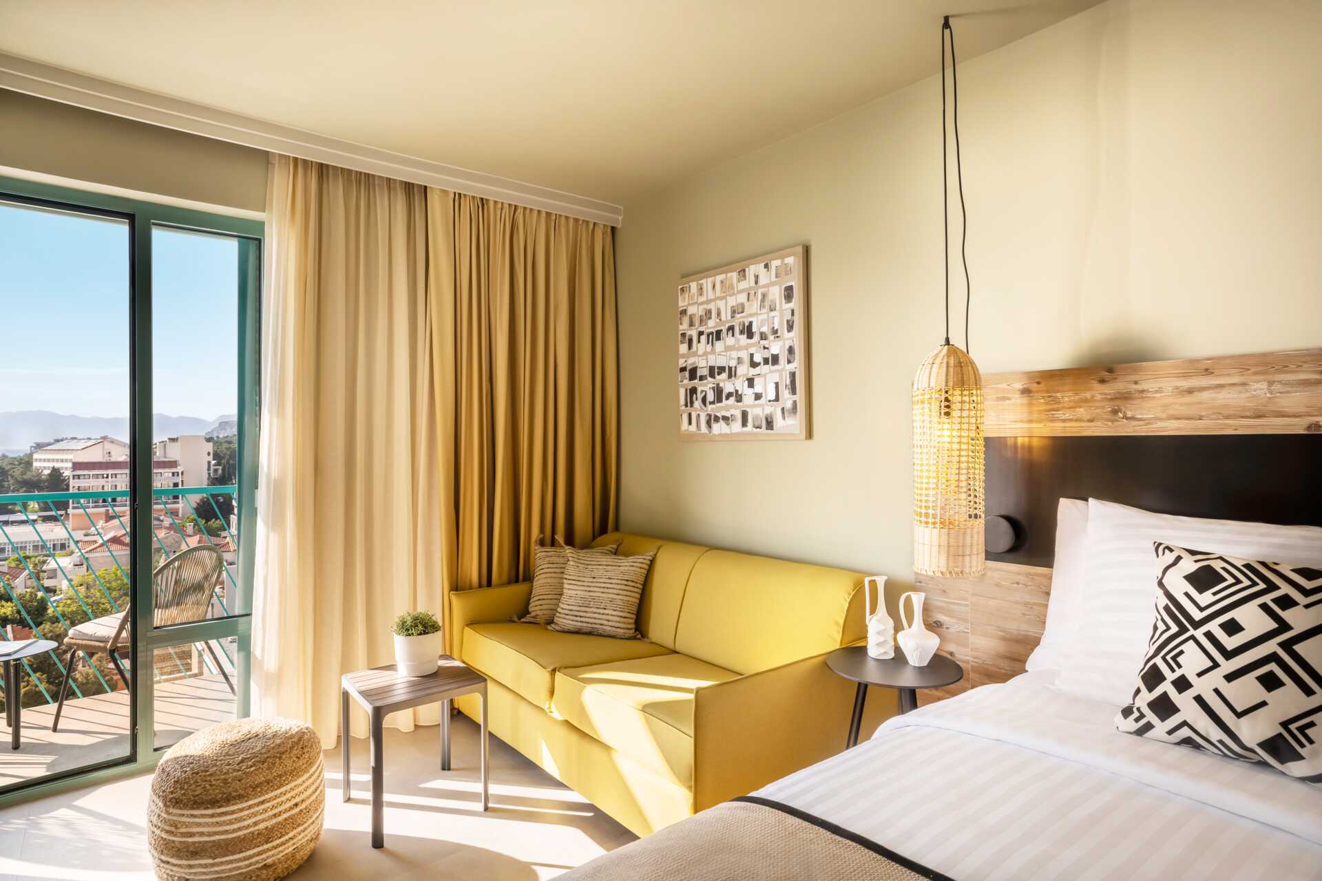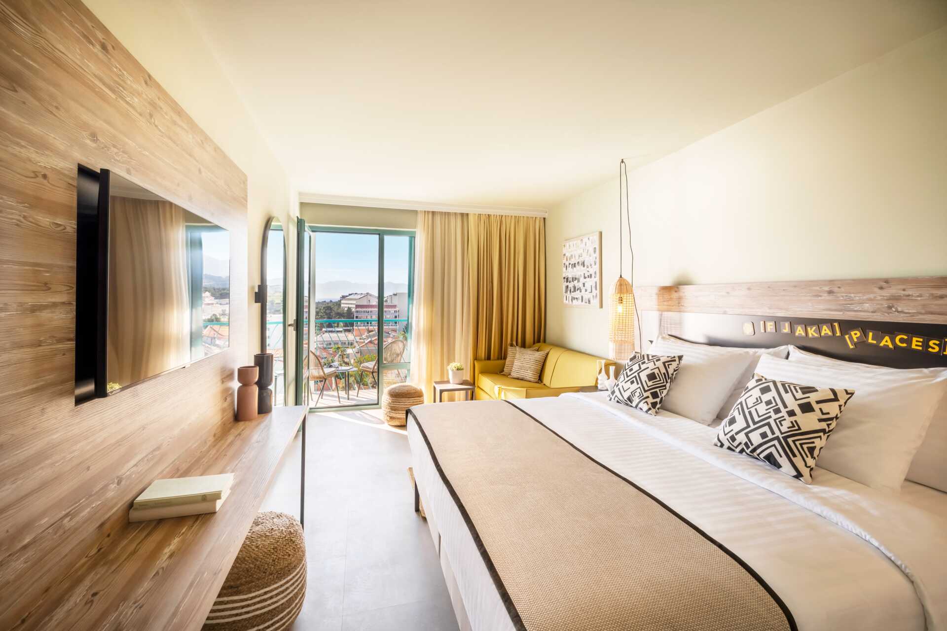 Større dobbeltrom med balkong og begrenset havutsikt. En dobbeltseng eller to enkeltsenger. Mulig med ekstraseng i enkeltseng eller i sovesofa. Wifi, luftkondisjonering og safe inkludert. TV. Kjøleskap. Hårføner. Baderom med dusj og wc. Rengjøring 7 ggr/uke.