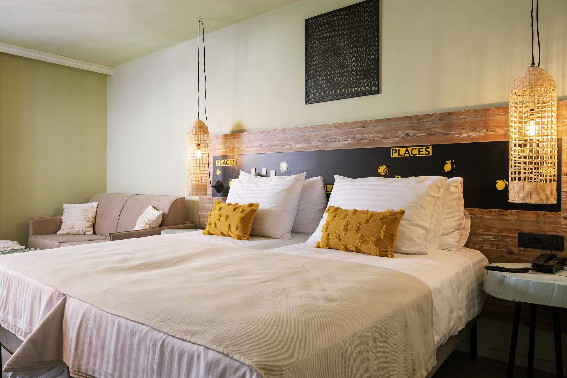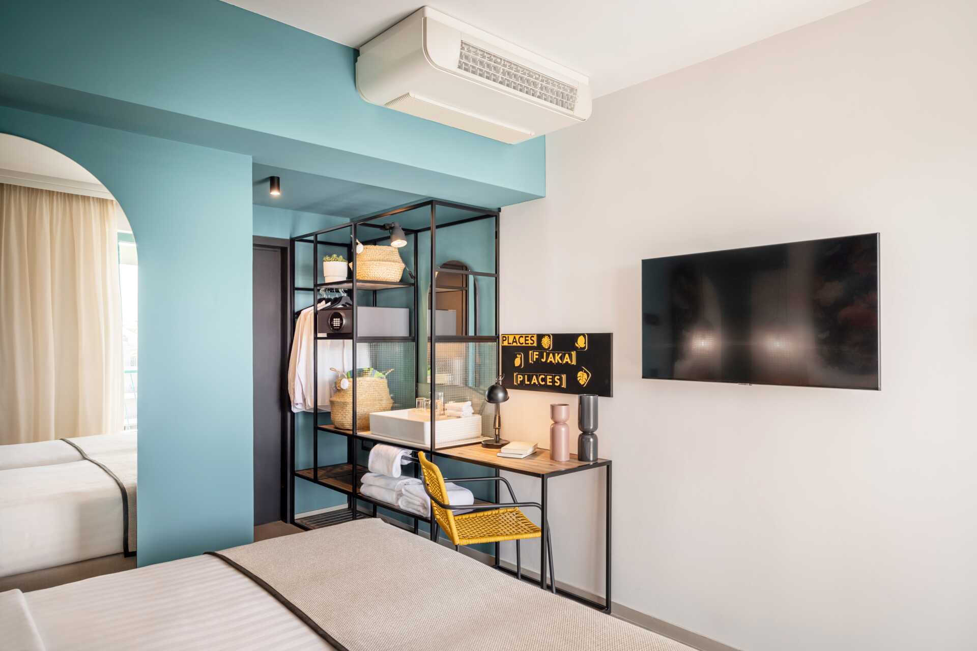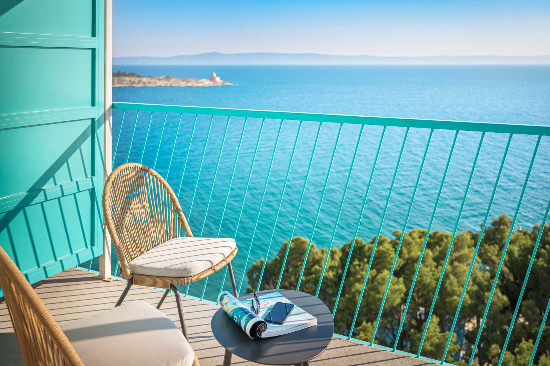 Større dobbeltrom med balkong og begrenset havutsikt. En dobbeltseng eller to enkeltsenger. Mulig med ekstraseng i enkeltseng eller i sovesofa. Wifi, luftkondisjonering og safe inkludert. TV. Kjøleskap. Hårføner. Baderom med dusj og wc. Rengjøring 7 ggr/uke.