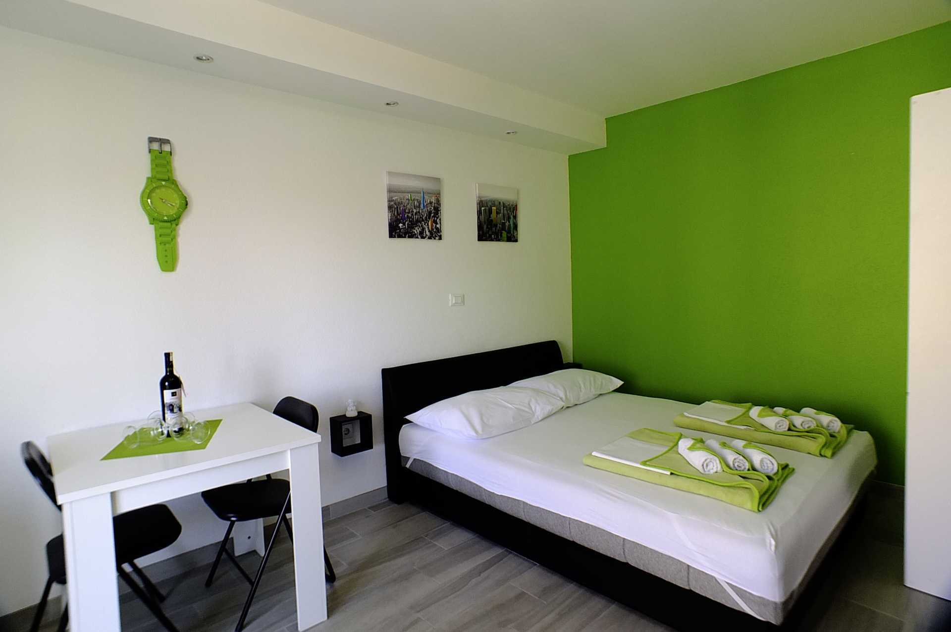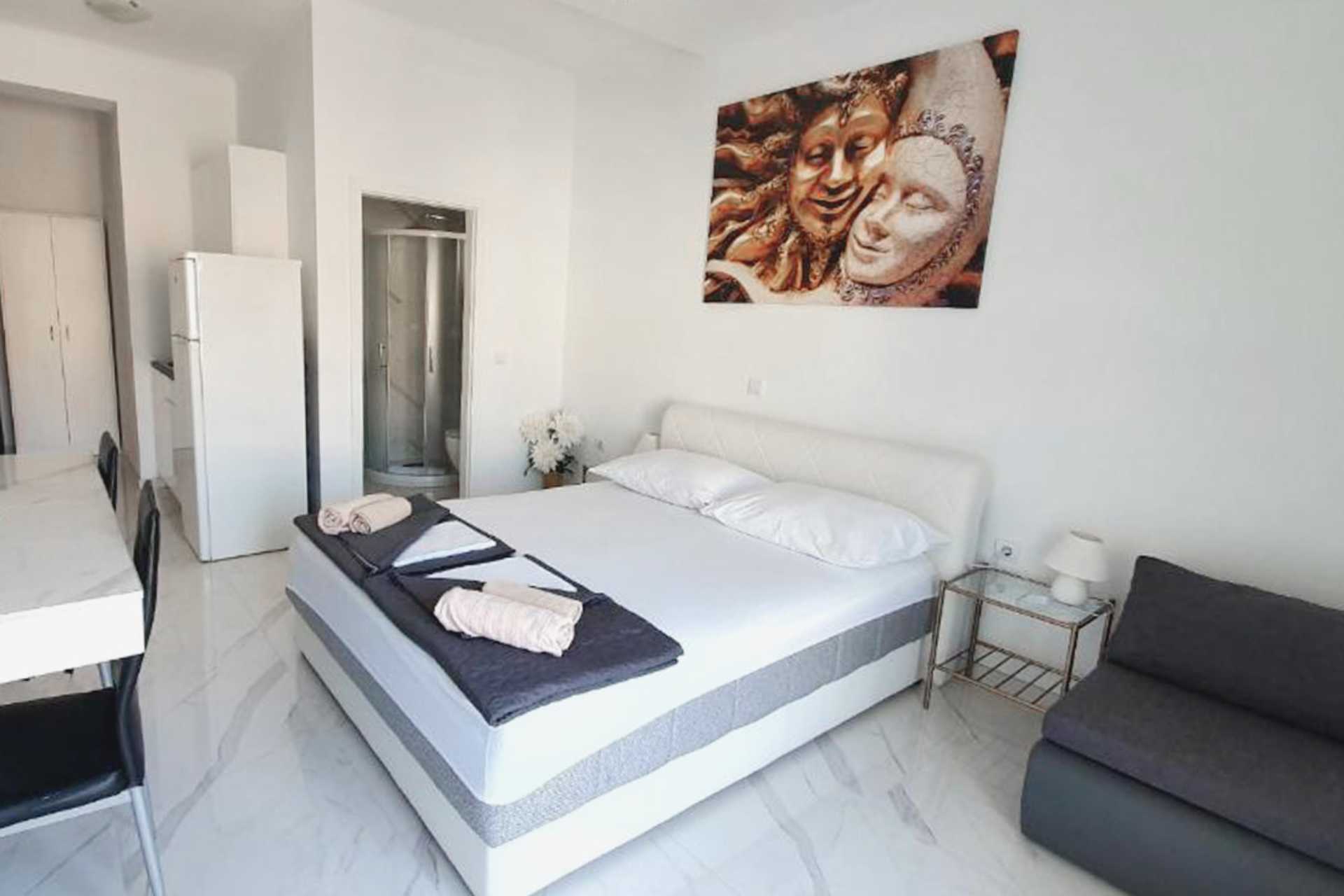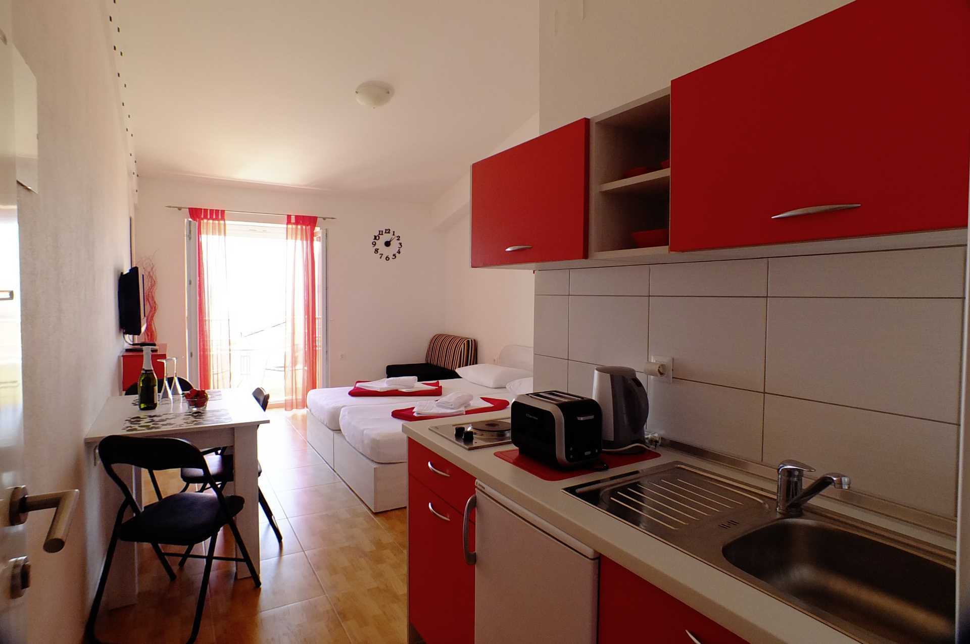 Ettromsleilighet med balkong eller markterrasse. Balkongen kan være av forskjellig størrelse, noen har begrenset havutsikt og noen vender mot havet men har ikke havutsikt - havet kan skimtes i det fjerne mellom husene. Minikjøkken. En dobbeltseng. Mulig med en ekstraseng i sovesofa. Minikjøkken med kjøleskap, kokeplater, vannkoker og enkelt kjøkkenutstyr. Wifi, luftkondisjonering og safe inkludert. TV. Dusj og wc. Rengjøring 6 ggr/uke.