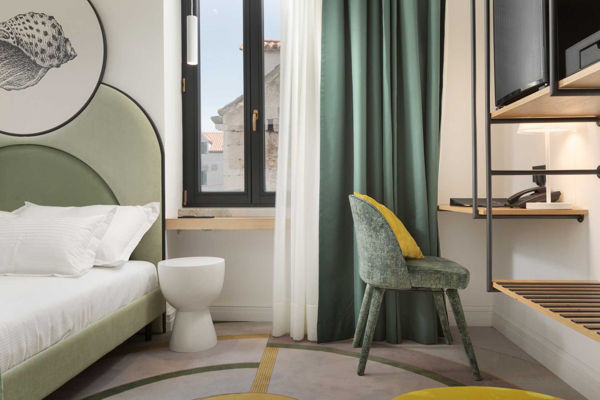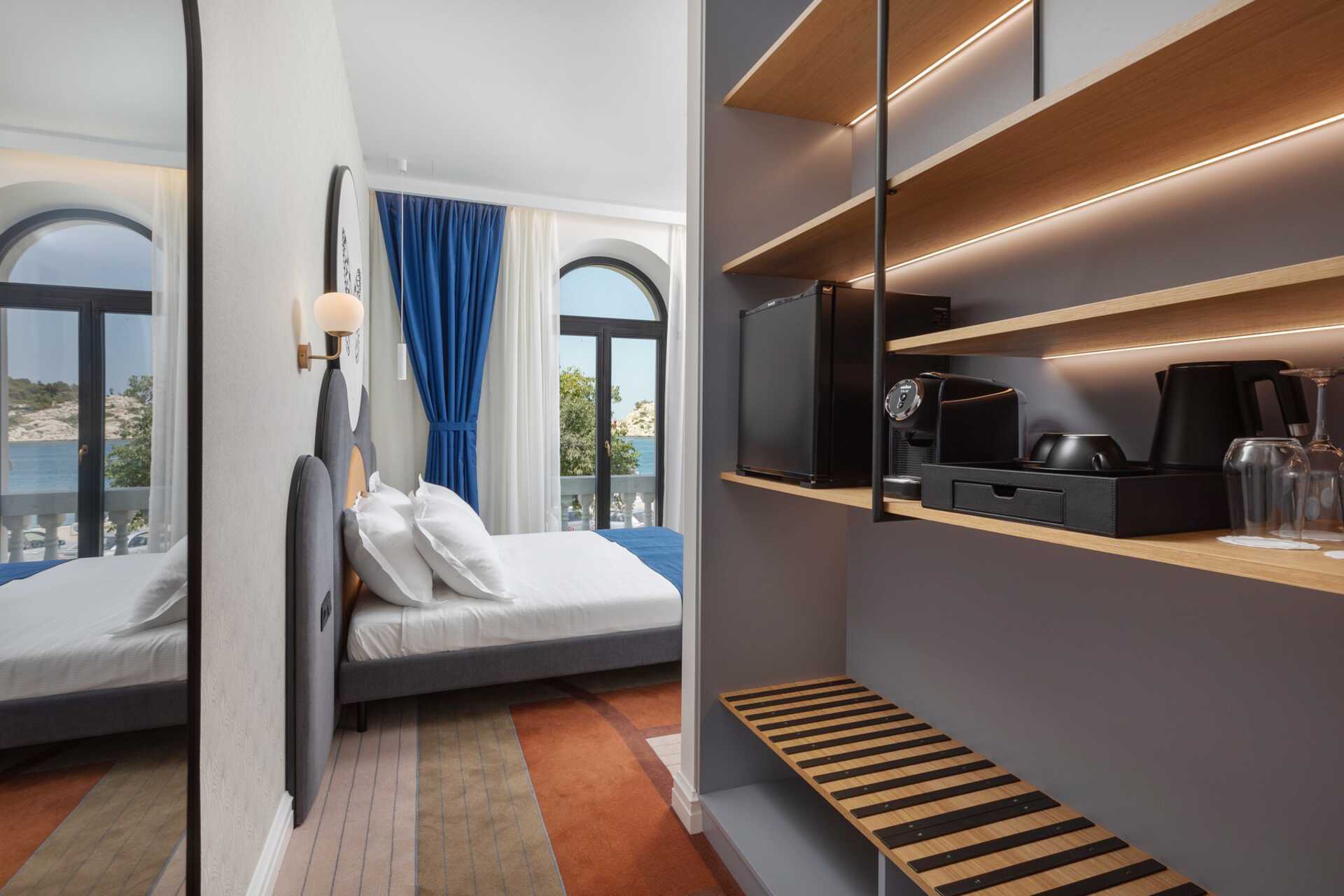 Superiorrom, uten uteplass og med begrenset havutsikt fra vinduet. En dobbeltseng. Wifi, luftkondisjonering og safe inkludert. Minibar. Espressomaskin, kapsler inkludert. Vannkoker. TV med internasjonale kanaler. Vegg-til-vegg-teppe Hårføner. Baderom med dusj og wc. Rengjøring 7 ggr/uke.