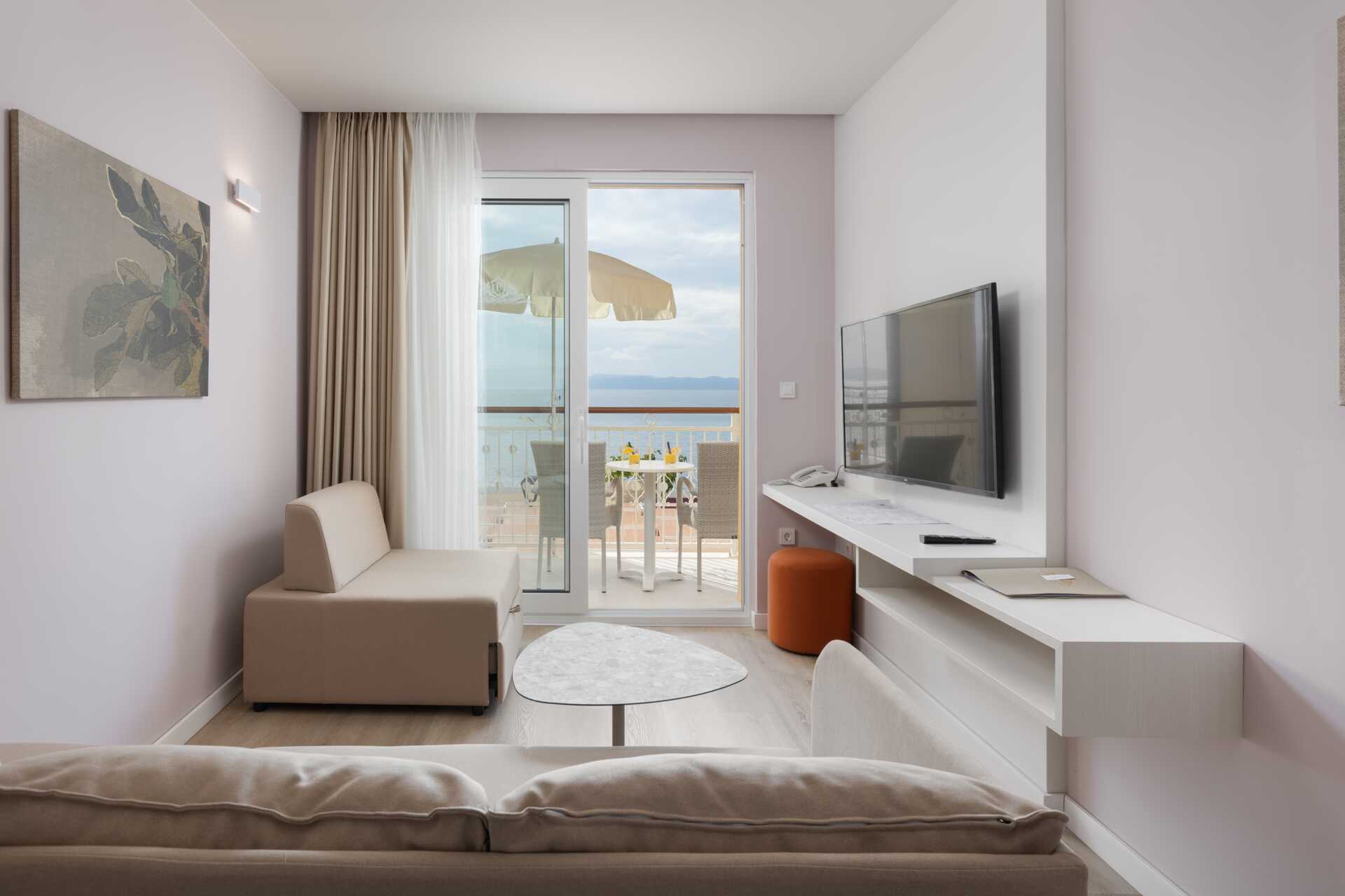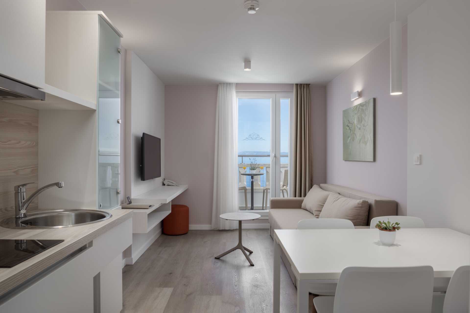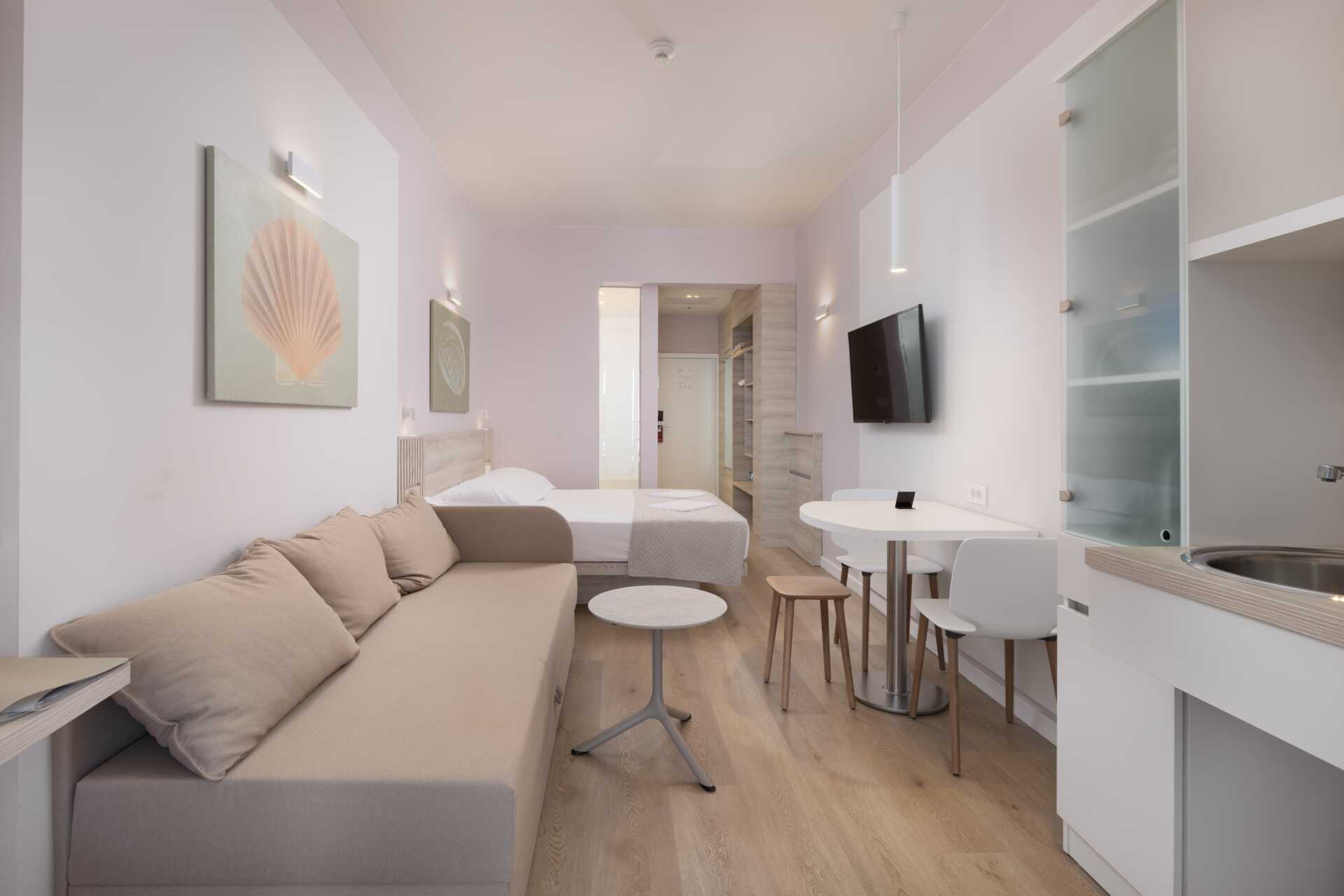 Juniorsuiter med balkong eller terrasse i varierende størrelser, noen balkonger har havutsikt. Soverom og kombinert stue med lite kjøkkenområde. I noen toromsleiligheter har trapper. En dobbeltseng eller to enkeltsenger. Mulig med ekstrasenger i sovesofa. Lite kjøkkenkrok med kjøleskap, vannkoker, kaffetrakter og enkelt kjøkkenutstyr. Det er ikke kokeplater. Wifi, luftkondisjonering og safe inkludert. TV. Hårføner. Dusj og wc. Rengjøring 7 ggr/uke.