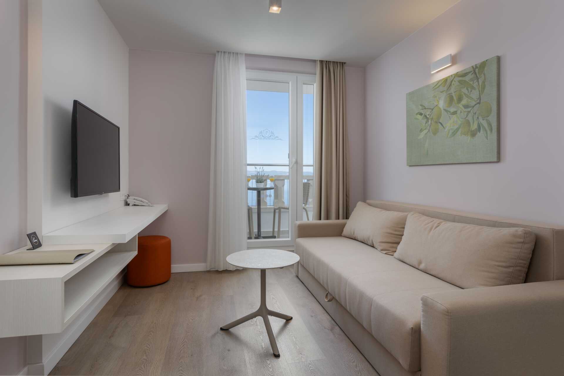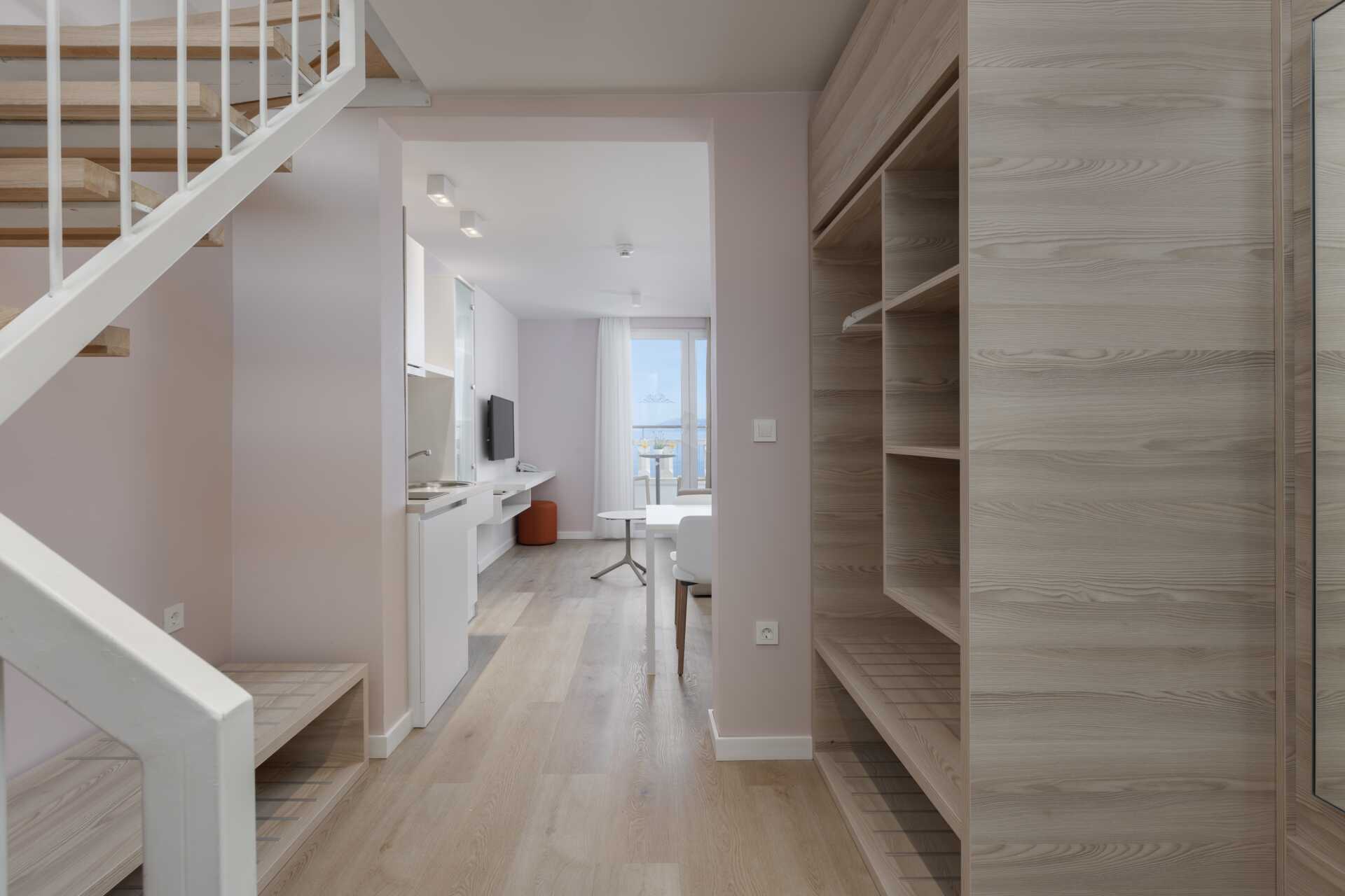 Juniorsuite i etasje med en liten balkong med havutsikt. I inngangsetasjen er det en kombinert stue med minikjøkken og et bad med hårføner, dusj og wc. En trapp opp er det et soverom med en dobbeltseng eller to enkeltsenger. Mulig med ekstrasenger i sovesofa i stuen. Lite kjøkkenkrok med kjøleskap, vannkoker, kaffetrakter og enkelt kjøkkenutstyr. Det er ikke kokeplater. Wifi, luftkondisjonering og safe inkludert. TV med lokale kanaler. Hårføner. Rengjøring 7 ggr/uke.
