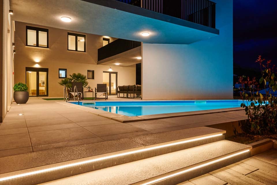 Denne unikt designede villaen er enestående, med en sandsteinsfasade polert som en stein og en utendørs takterrasse som gir fugleperspektiv over den pittoreske byen Omiš.