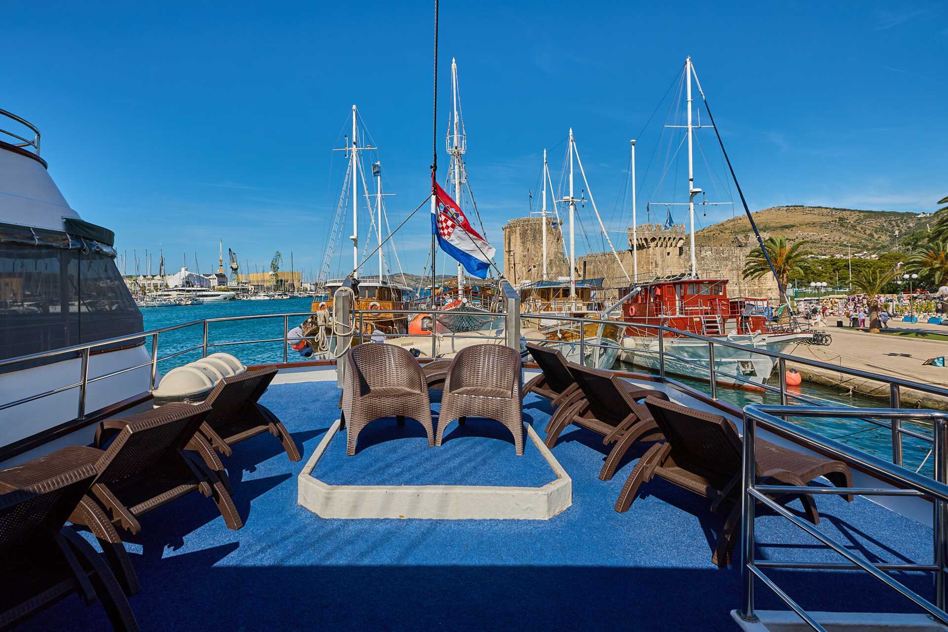Skjærgårdscruiset starter og slutter i Trogir. Ombordstigning i Trogir havn skjer mellom kl. 13.00 og 14.00 hvor du blir ønsket velkommen med en drink og har muligheten til å møte mannskapet og dine medreisende. Deretter setter vi kursen mot en bukt på øya Čiovo, hvor vi tar vårt første bad i det krystallklare vannet i Adriaterhavet. Dagens endelige destinasjon er Split, hovedstaden i Dalmatia. Byens største severdighet er det historiske sentrum som er bygd rundt Diokletians palass, et verdensarvsted med 1700 år gamle romerske murer, bolighus, kirker og sjarmerende kafeer. Kvelden er fri til egne turer i den pittoreske gamlebyen.